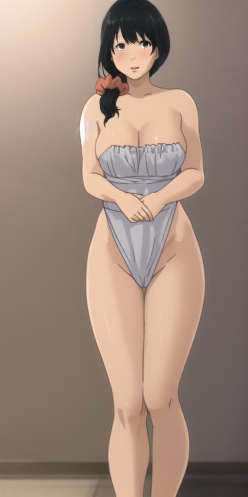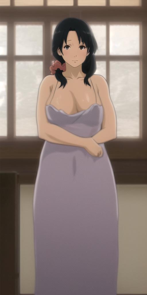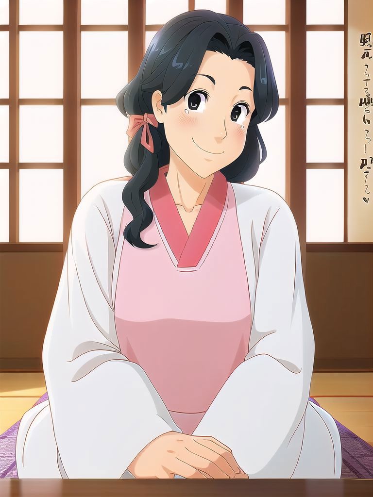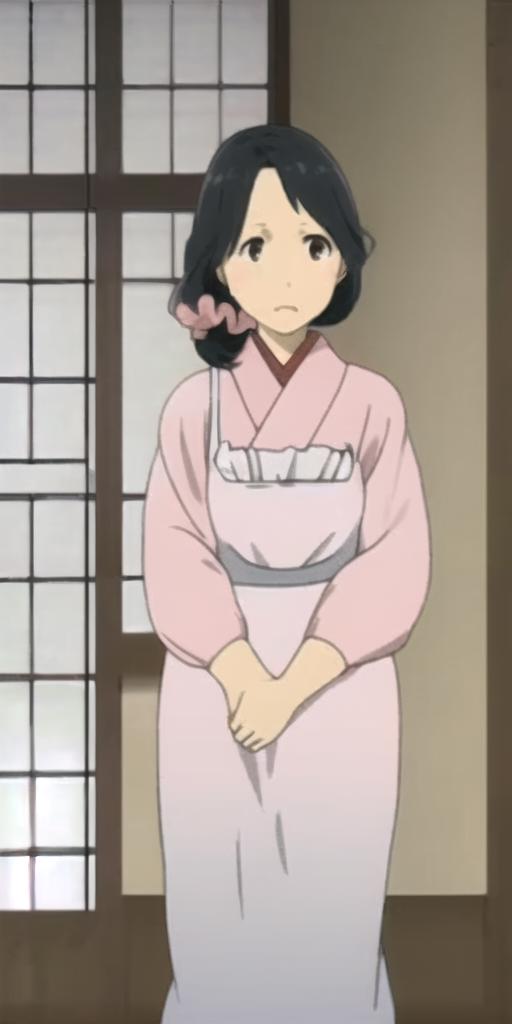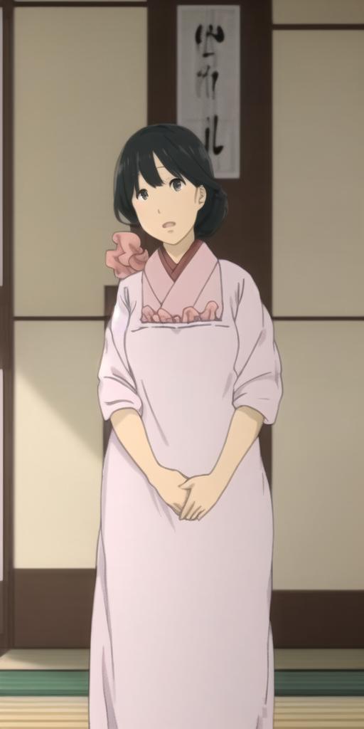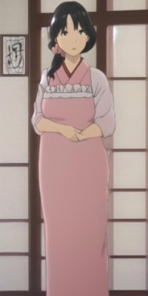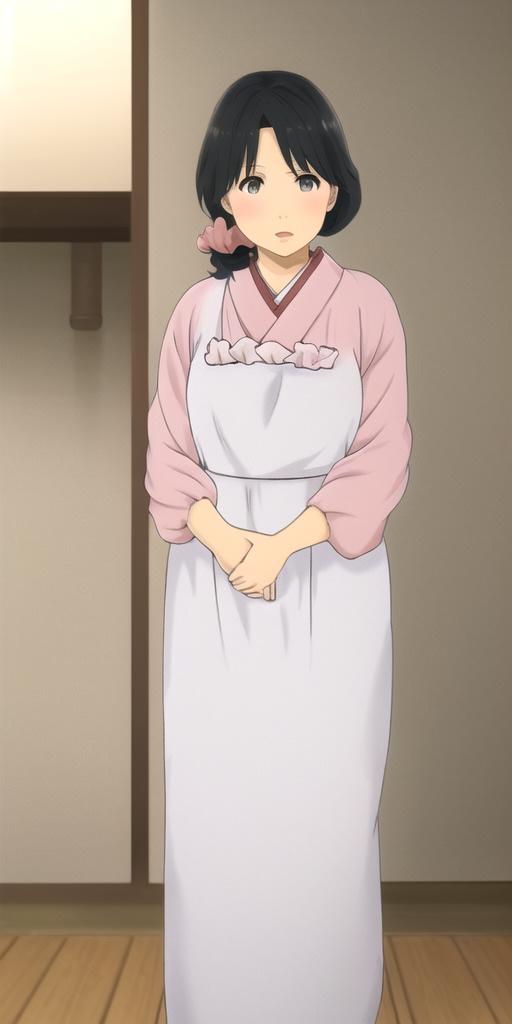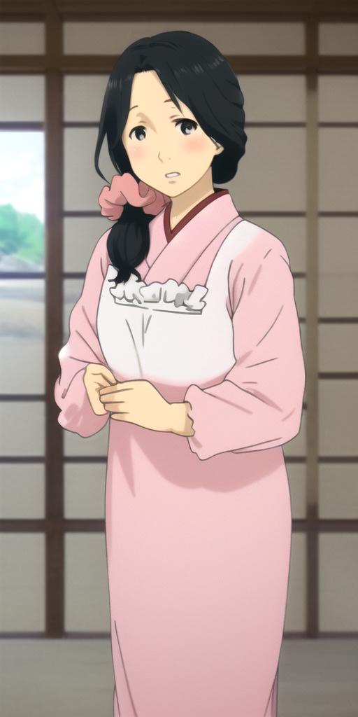 Handa Emi, mature female, black hair, black eyes, pink kimono, white kappougi, white socks, blue slippers, pink scrunchie, hair scrunchie, hair over shoulder, long hair