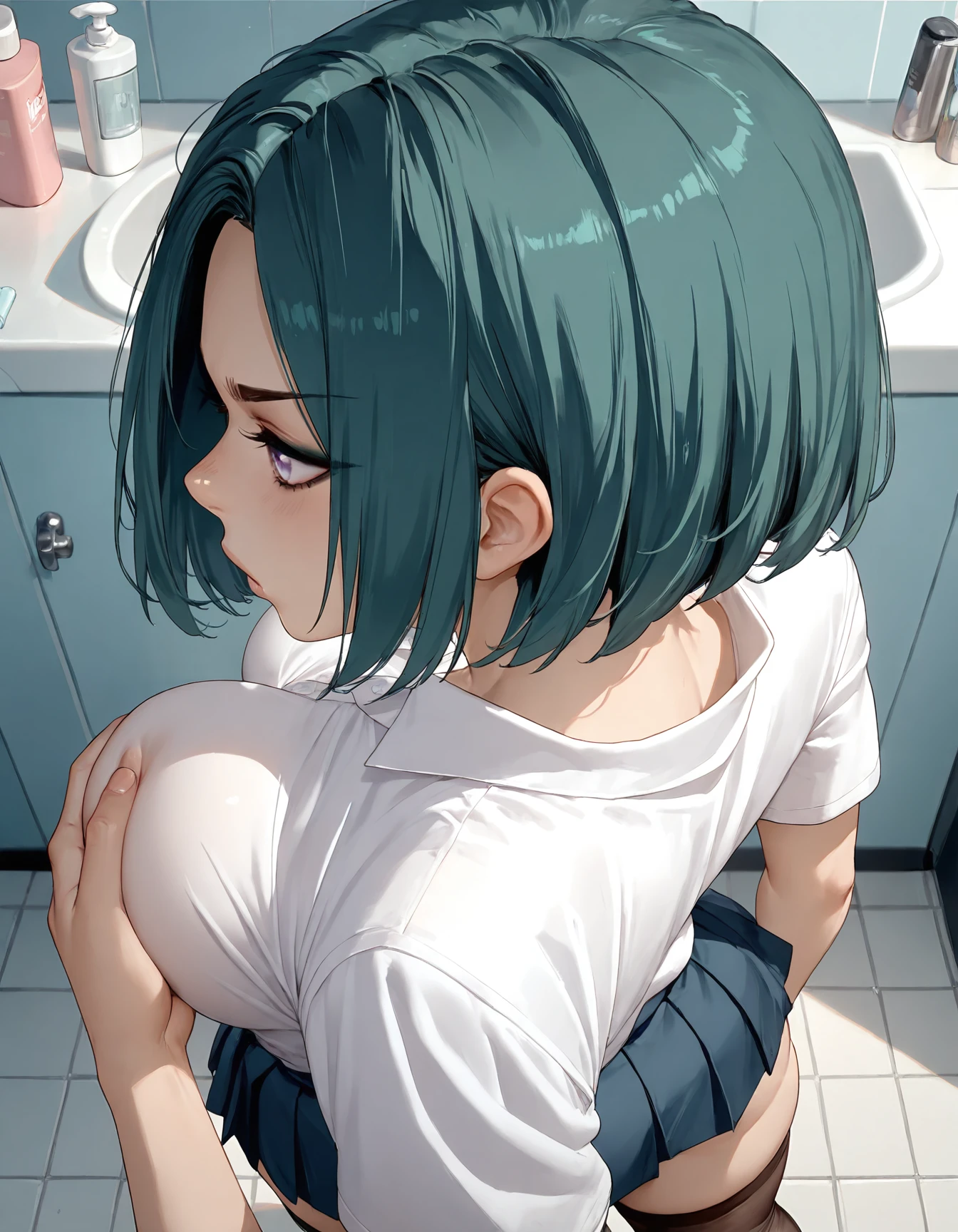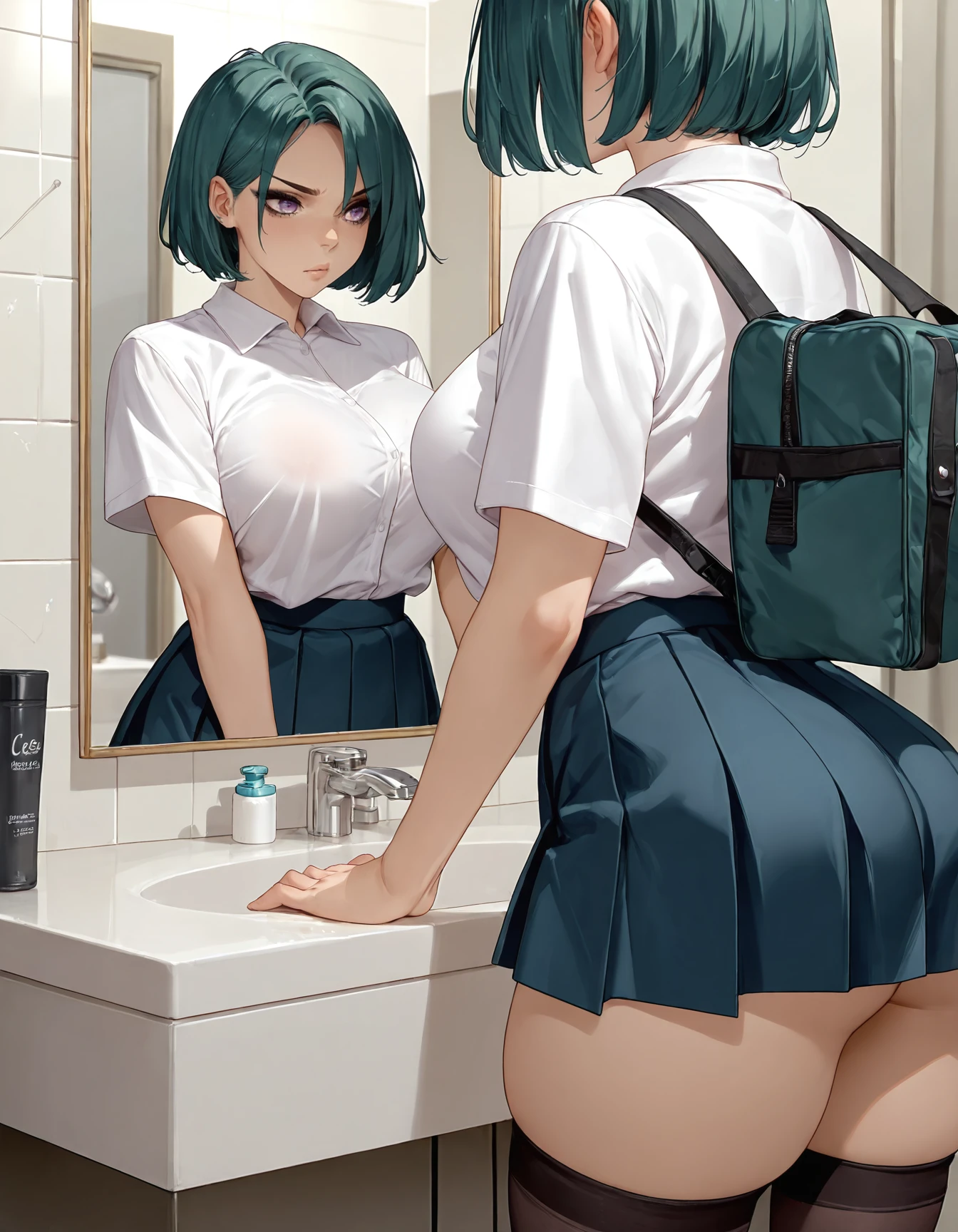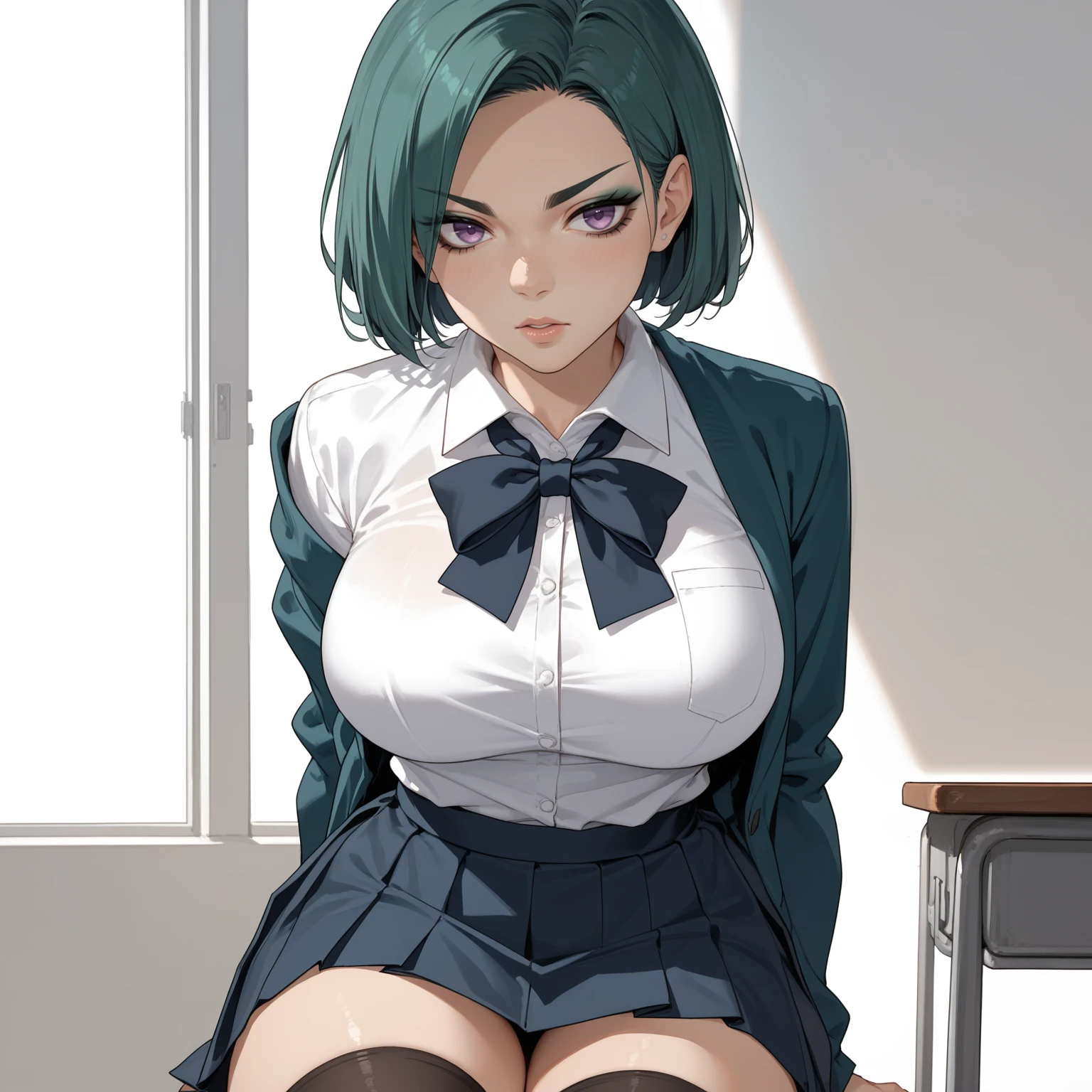 Cecile, white shirt, shirt tucked in, green bowtie, green hair, dark green skirt, brown thighhighs, black thighhighs, green thighhighs, long sleeves, short sleeves, cleavage cutout, cleavage, green jacket, green bag, green bra, glowing eyes, magenta eyes, loafersDescription