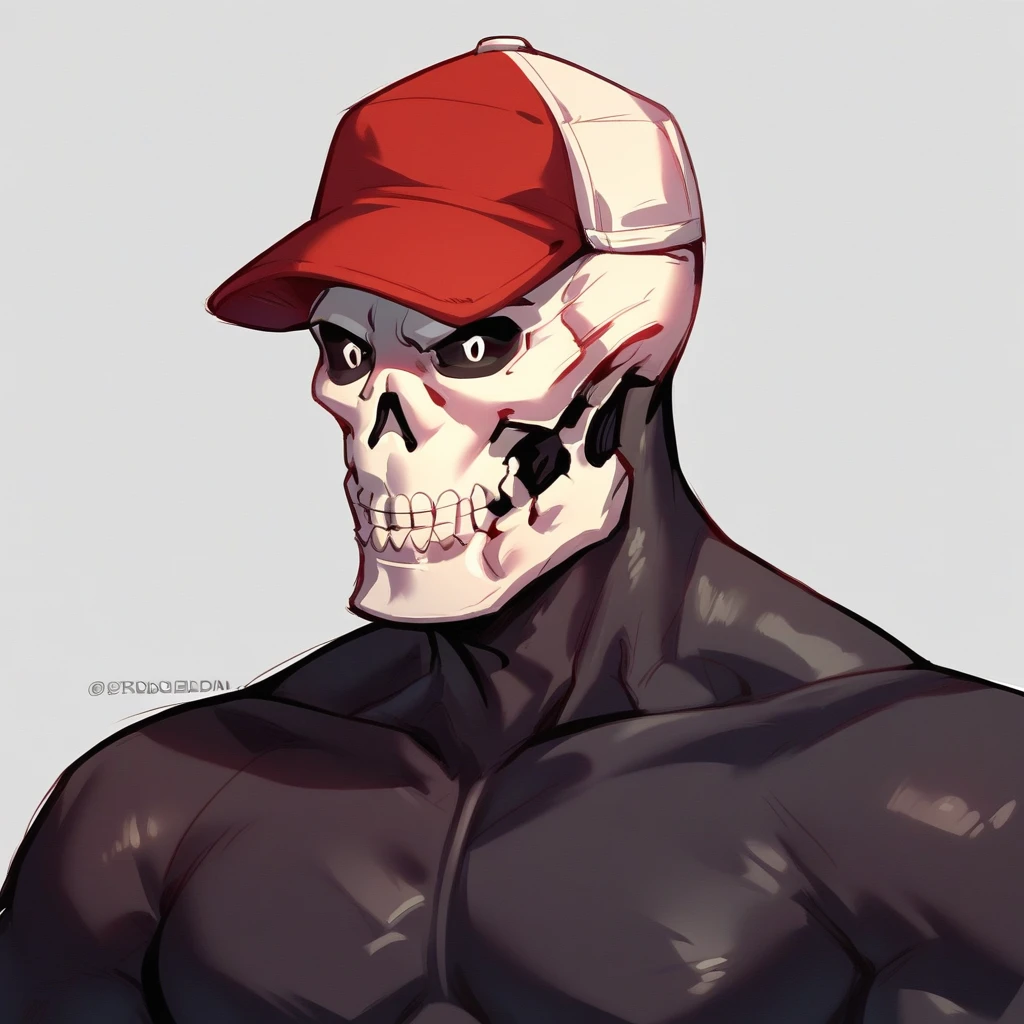 1boy, skullm@geddon, skull head, white pupils, black skin, red baseball cap, red t-shirt, pauldrons, fingerless gloves, belt, purple loincloth, boots, muscular,
