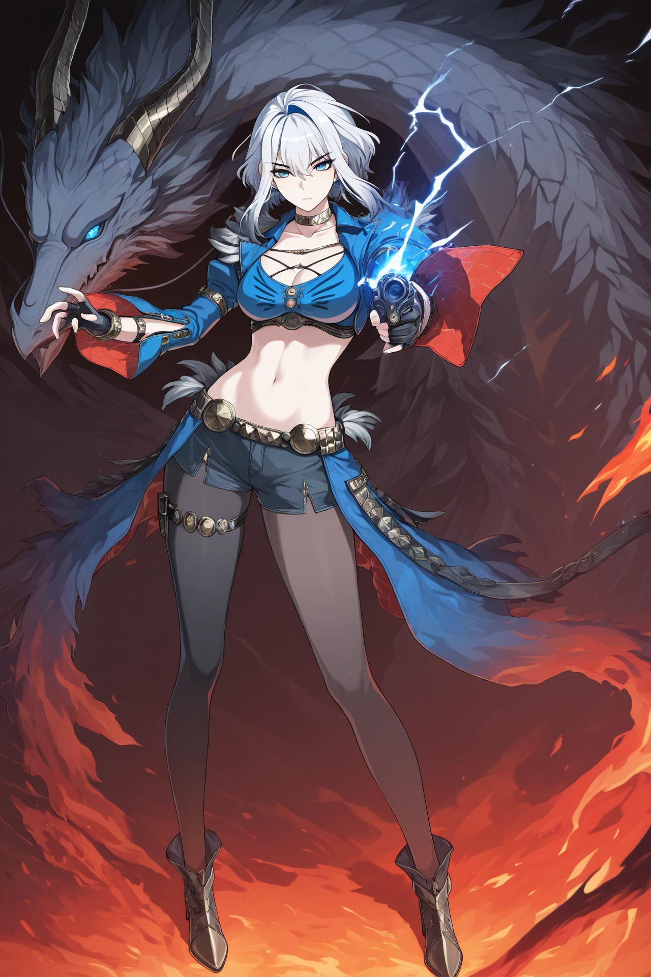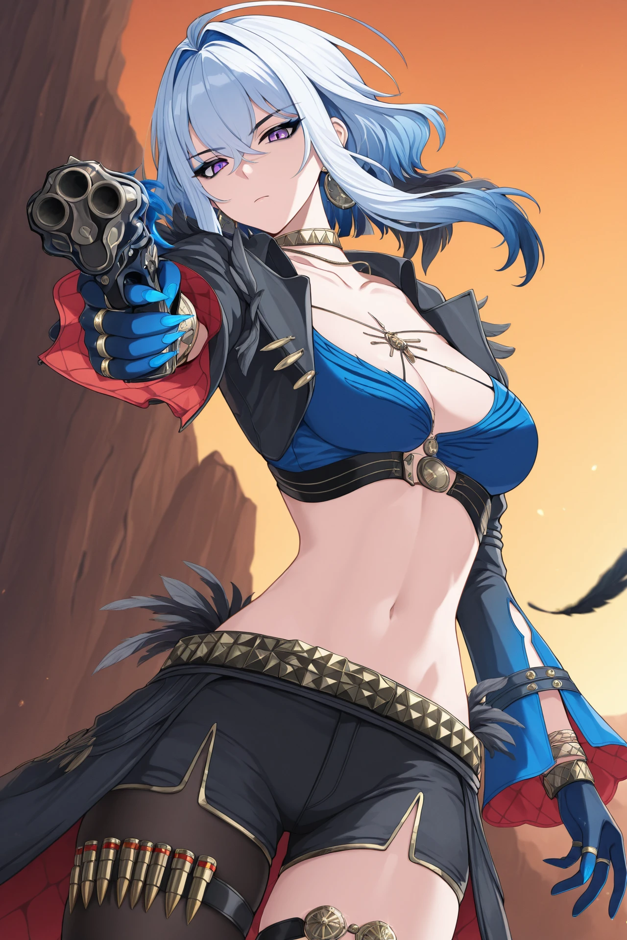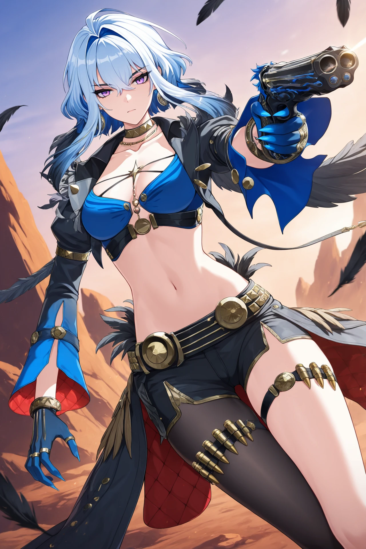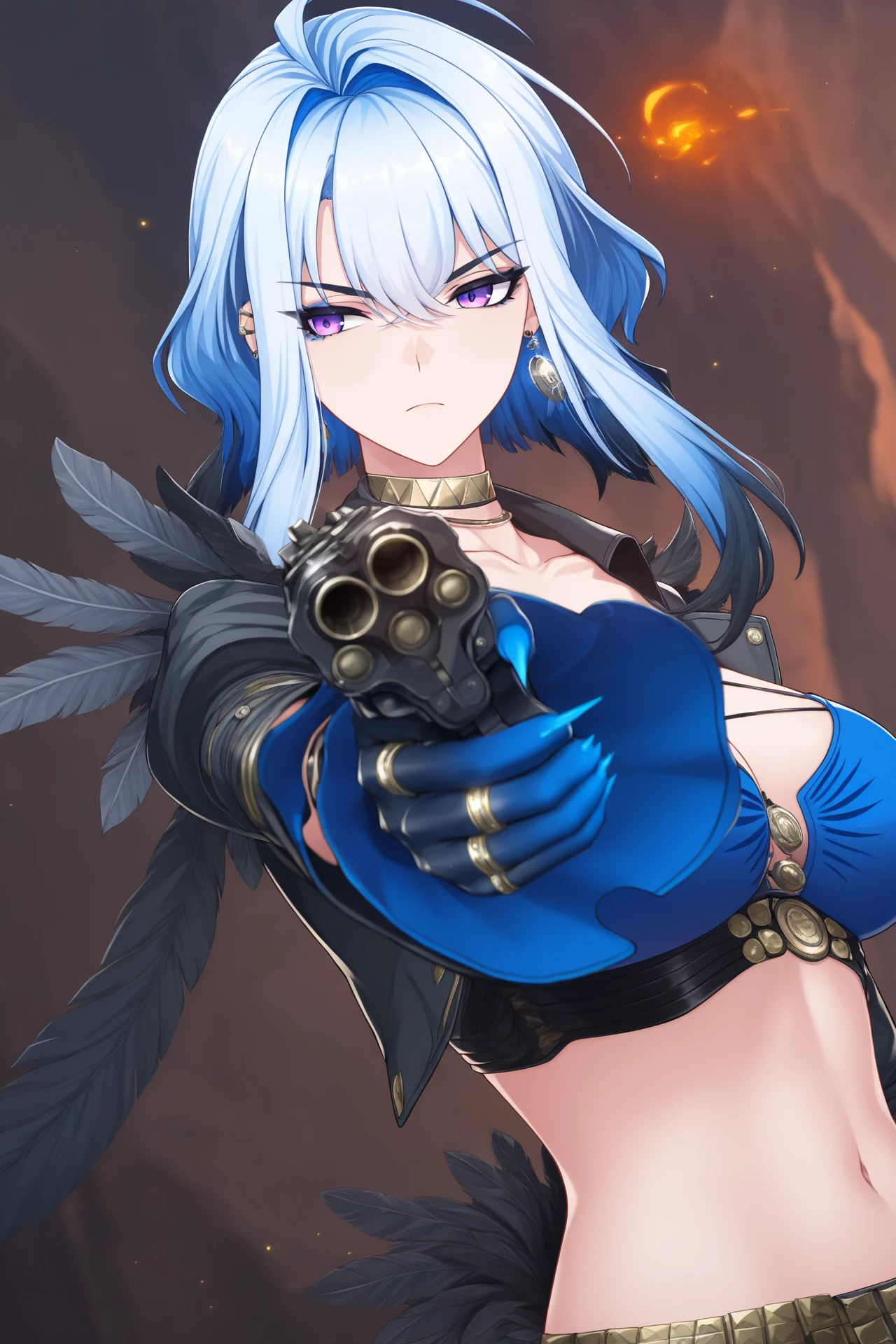 Galbrena, 1girl, solo, large breasts, short hair with sidelocks, navel, hair between eyes, jewelry, bare shoulders, blue hair, purple eyes, white hair, grey hair, multicolored hair, earrings, mole, two-tone hair, piercing, hair intakes, ring, ear piercing, colored inner hair, arm tattoo, multiple rings, black feather wings,
