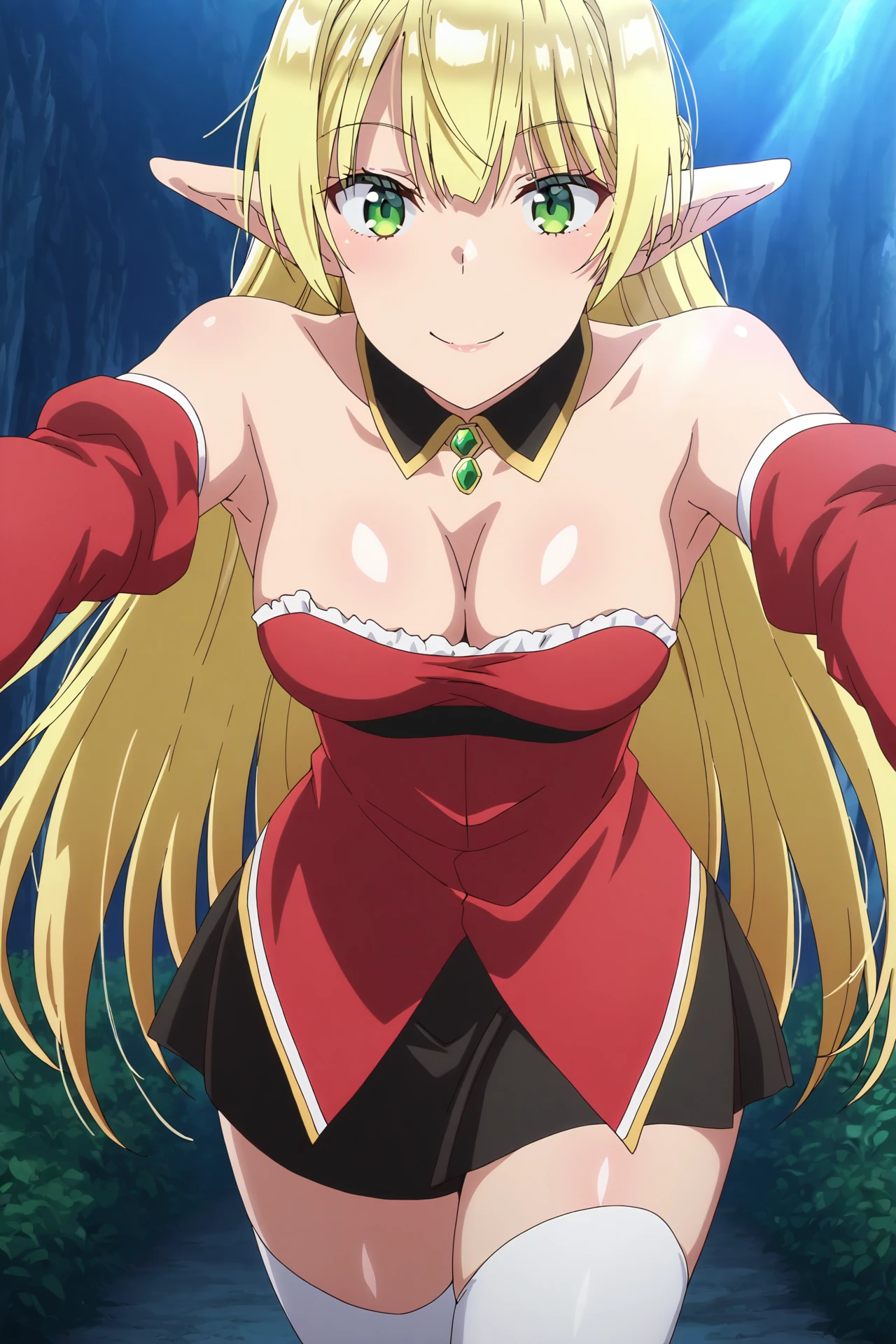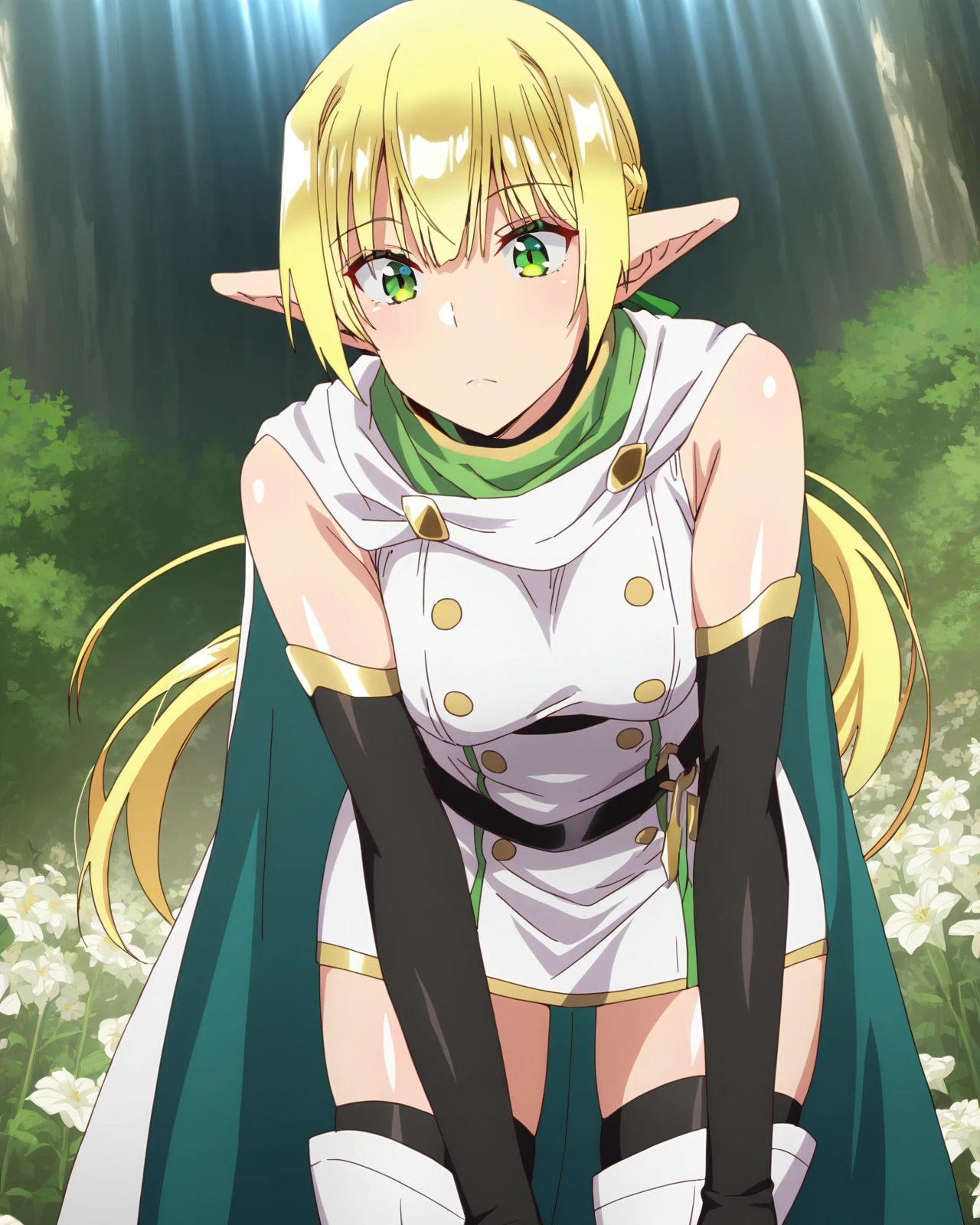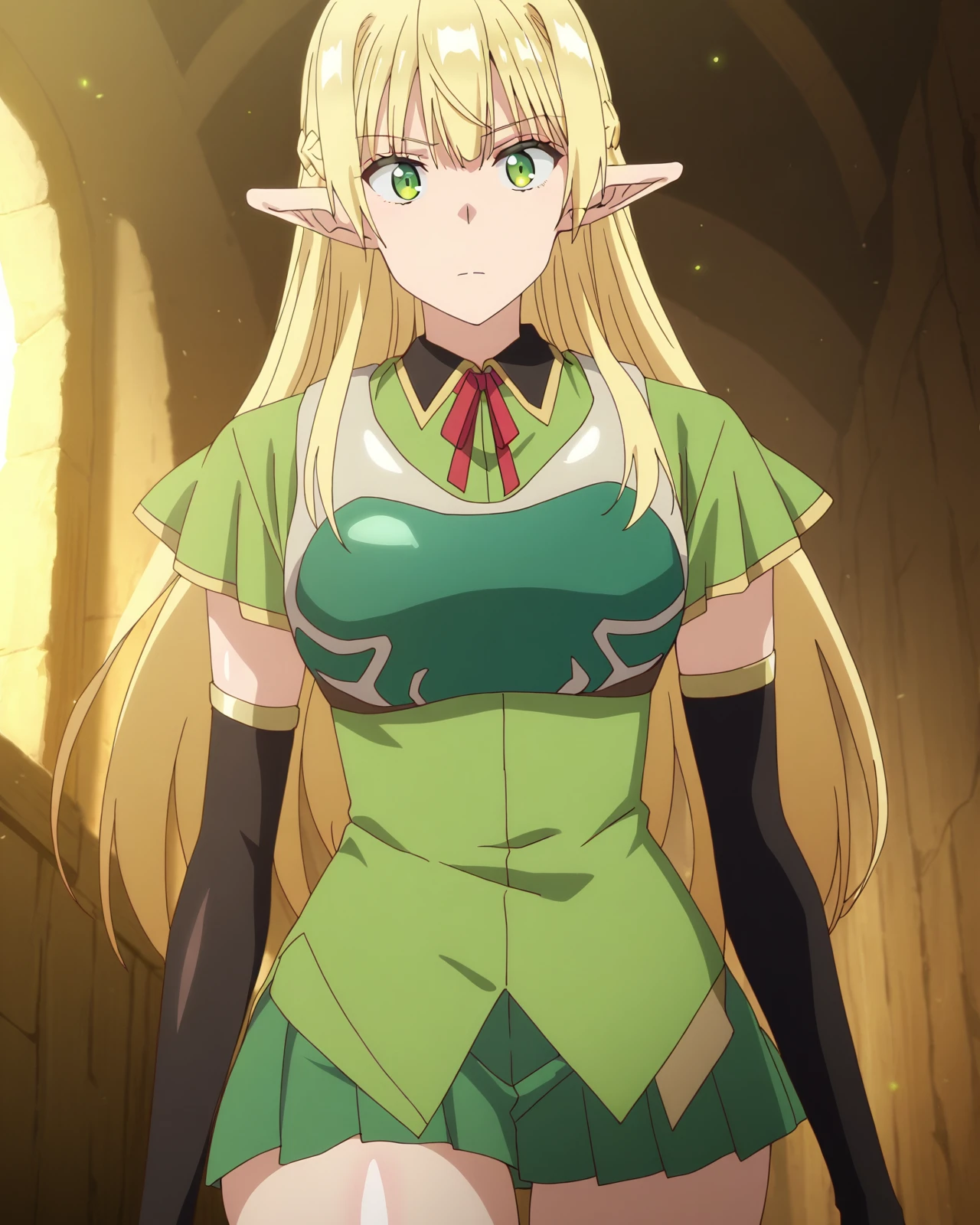 Crowelle, 1girl, long hair, blonde hair, green eyes, pointy ears, elf, flat chest, small breasts,