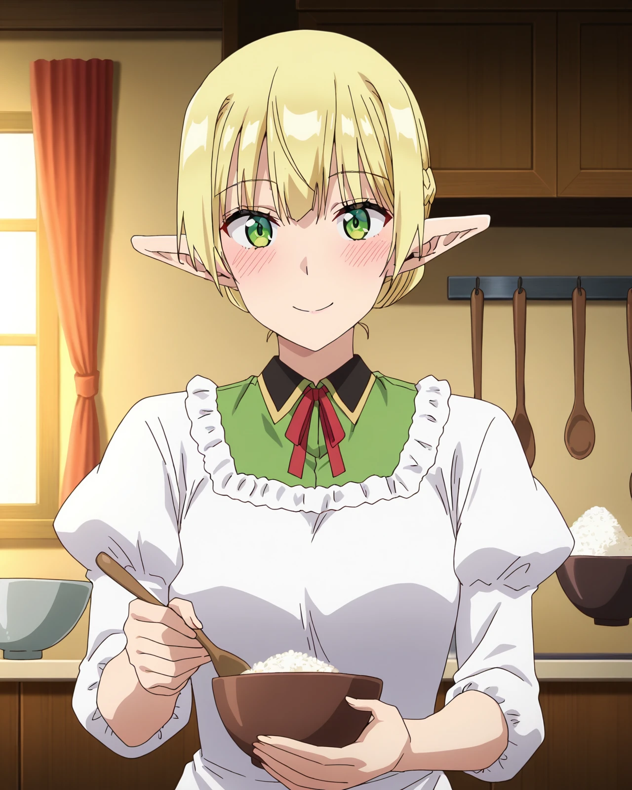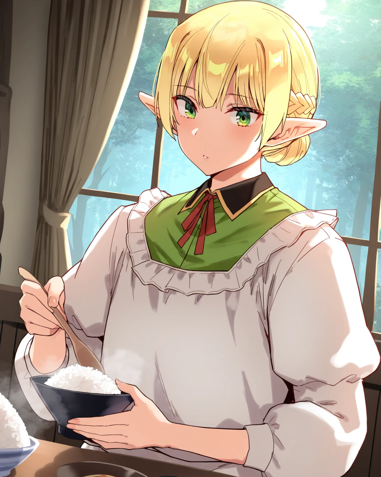 short hair, blonde hair, green eyes, braid, pointy ears, puffy sleeves, hair bun, apron, red ribbon, neck ribbon, elf, kappougi, ribbon, single hair bun,