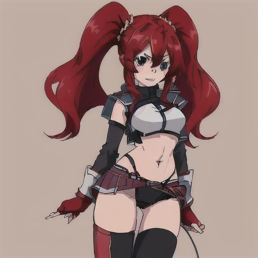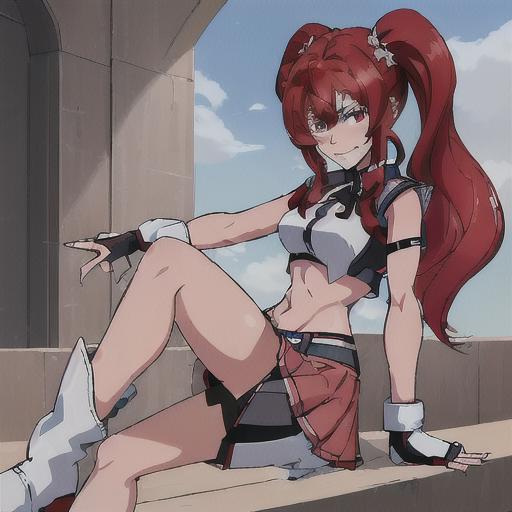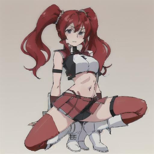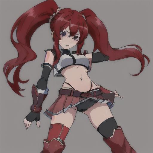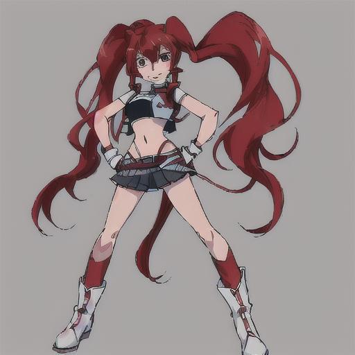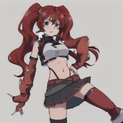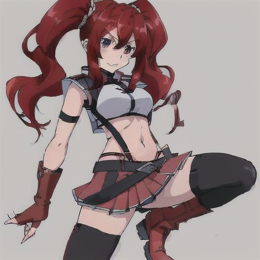 set 1 : <lora:Hildegard_Crossange-10:1>masterpeace,best quality,1girl, solo, long hair,red miniskirt,navel, twintails, red hair, boots, fingerless gloves, white footwear, high heel boots,midriff,Purple Eyes