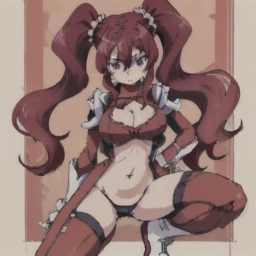 set 2 : <lora:Hildegard_Crossange-10:1>masterpeace,best quality,1girl, solo, long hair,large breasts,thighhighs, navel, cleavage, twintails, underwear, red hair, boots, fingerless gloves,black panties, clothing cutout, body suit, cleavage cutout, scrunchie, lowleg,Purple Eyes