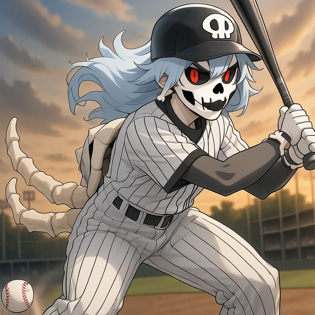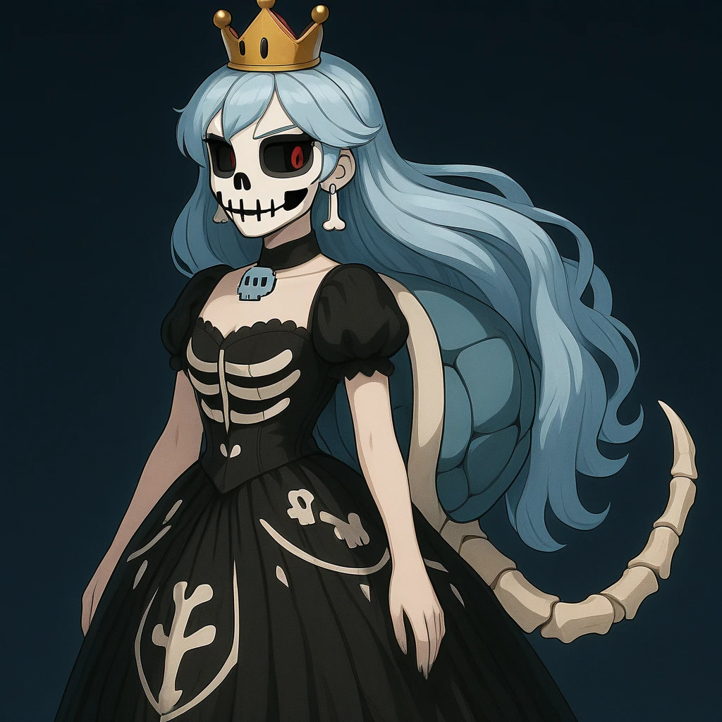 Bonesette, porcelain skin, black lipstick, stitch lines, blue-white hair, bone earrings, skull motif, super crown, black sclera, red irises, shell, skeletal tail, tail,