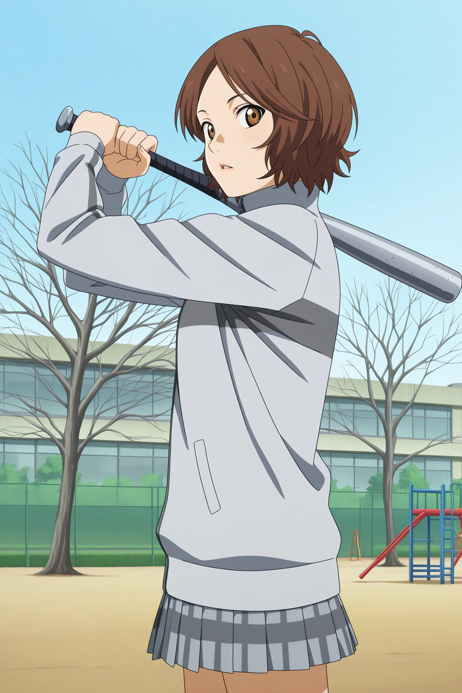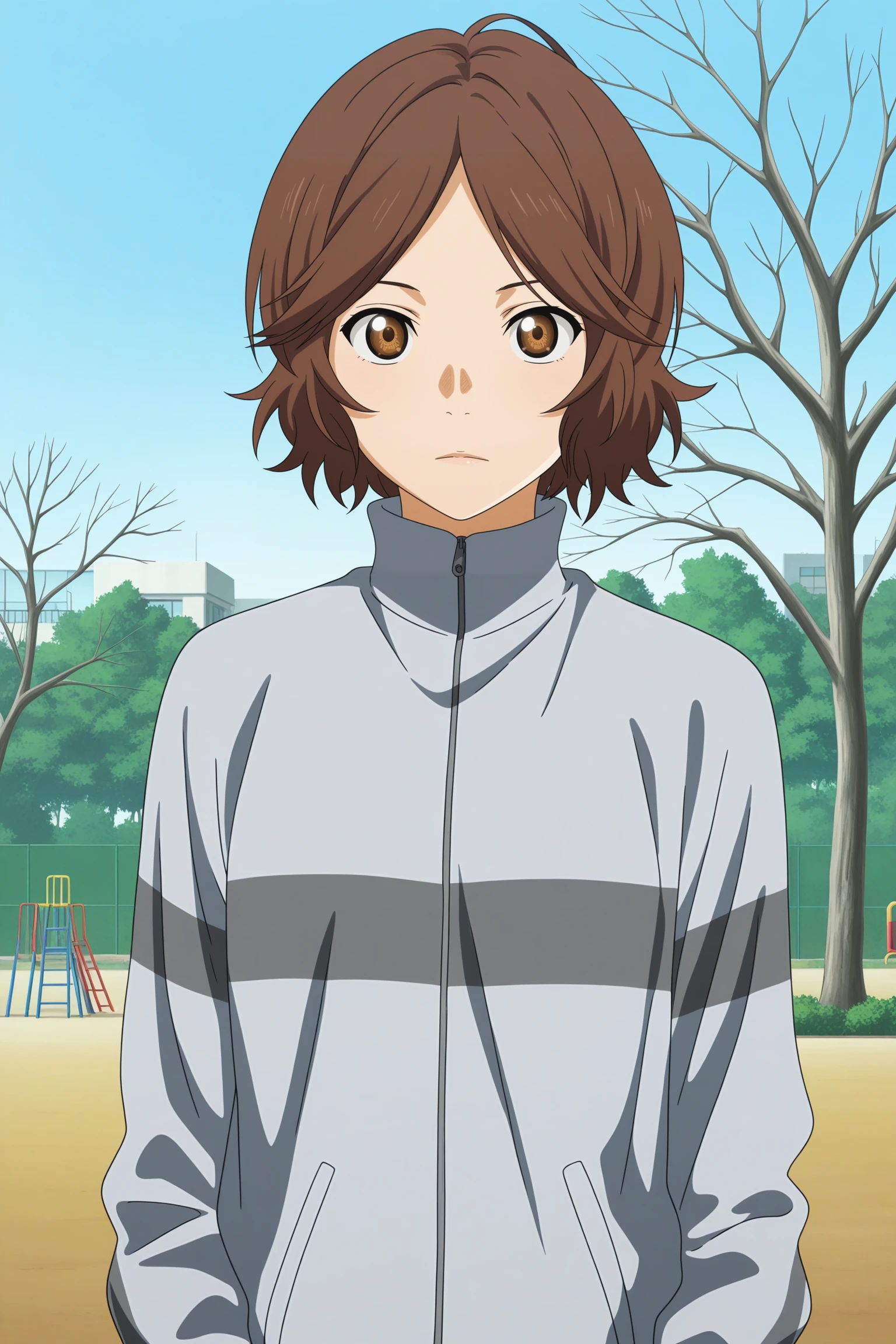 sawabe tsubaki, short hair, brown hair, parted bangs, brown eyes, long sleeves, grey jacket, track jacket, high collar, grey skirt, plaid skirt, pleated skirt, black socks, kneehighs, brown shoes, loafers
