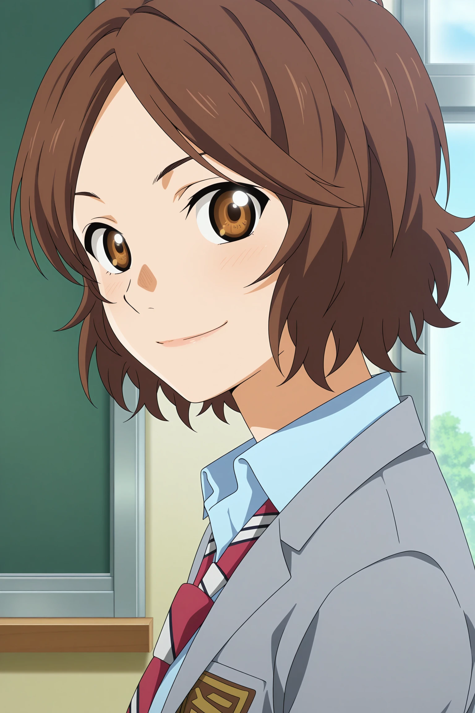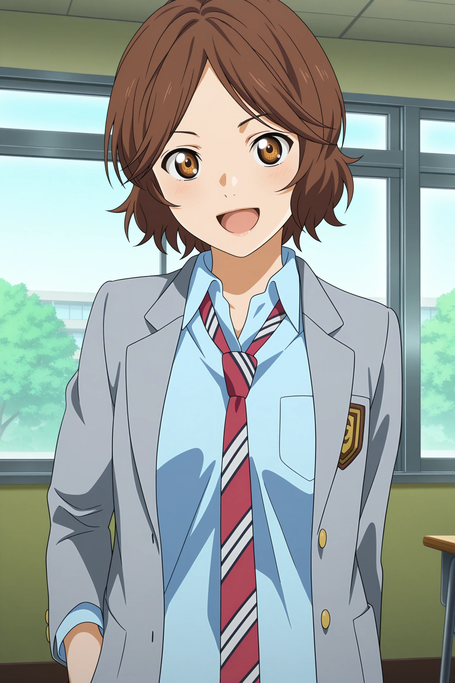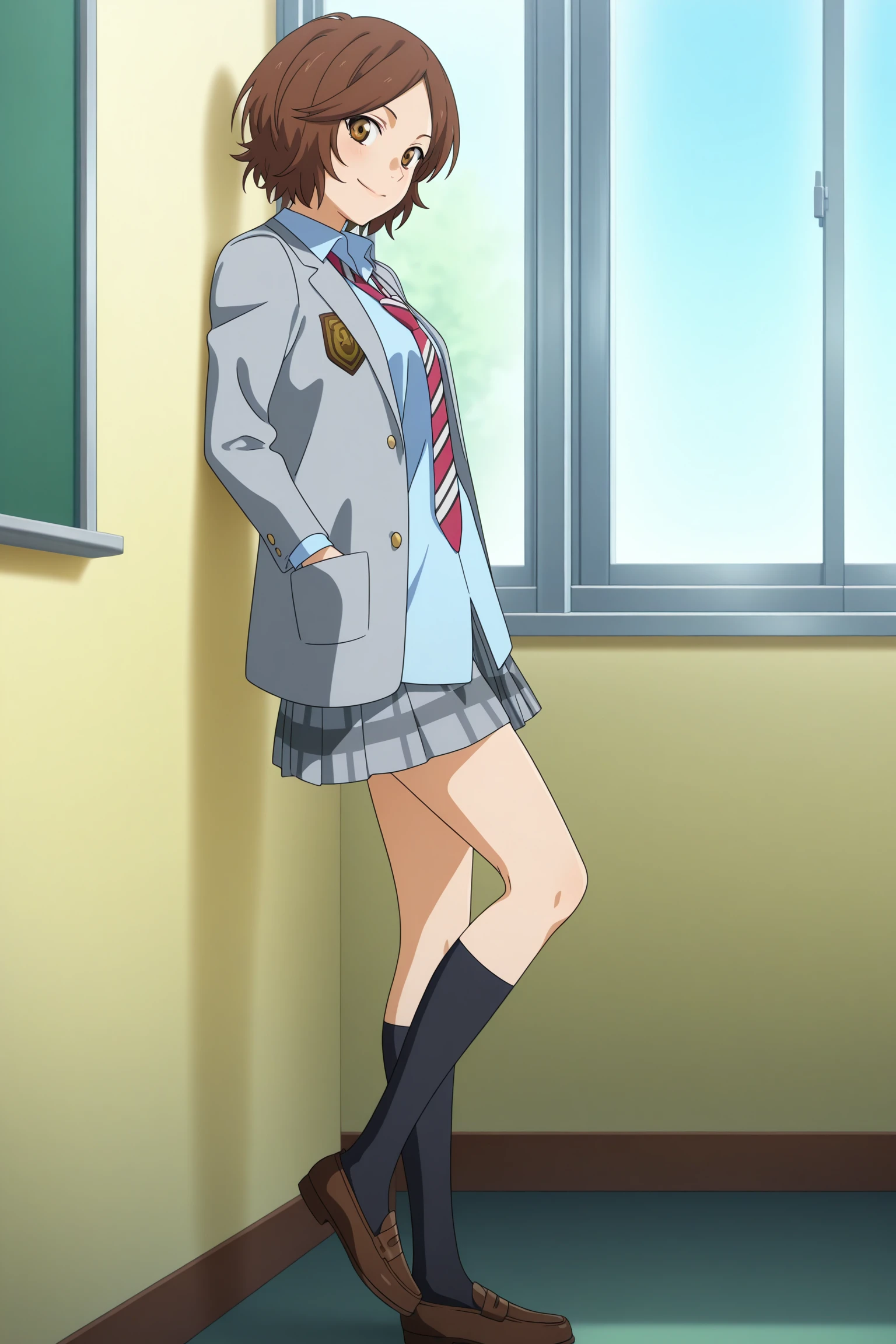 sawabe tsubaki, short hair, brown hair, parted bangs, brown eyes, long sleeves, grey jacket, blue shirt, collared shirt, red necktie, striped necktie, untucked shirt, grey skirt, plaid skirt, pleated skirt, black socks, kneehighs, brown shoes, loafers
