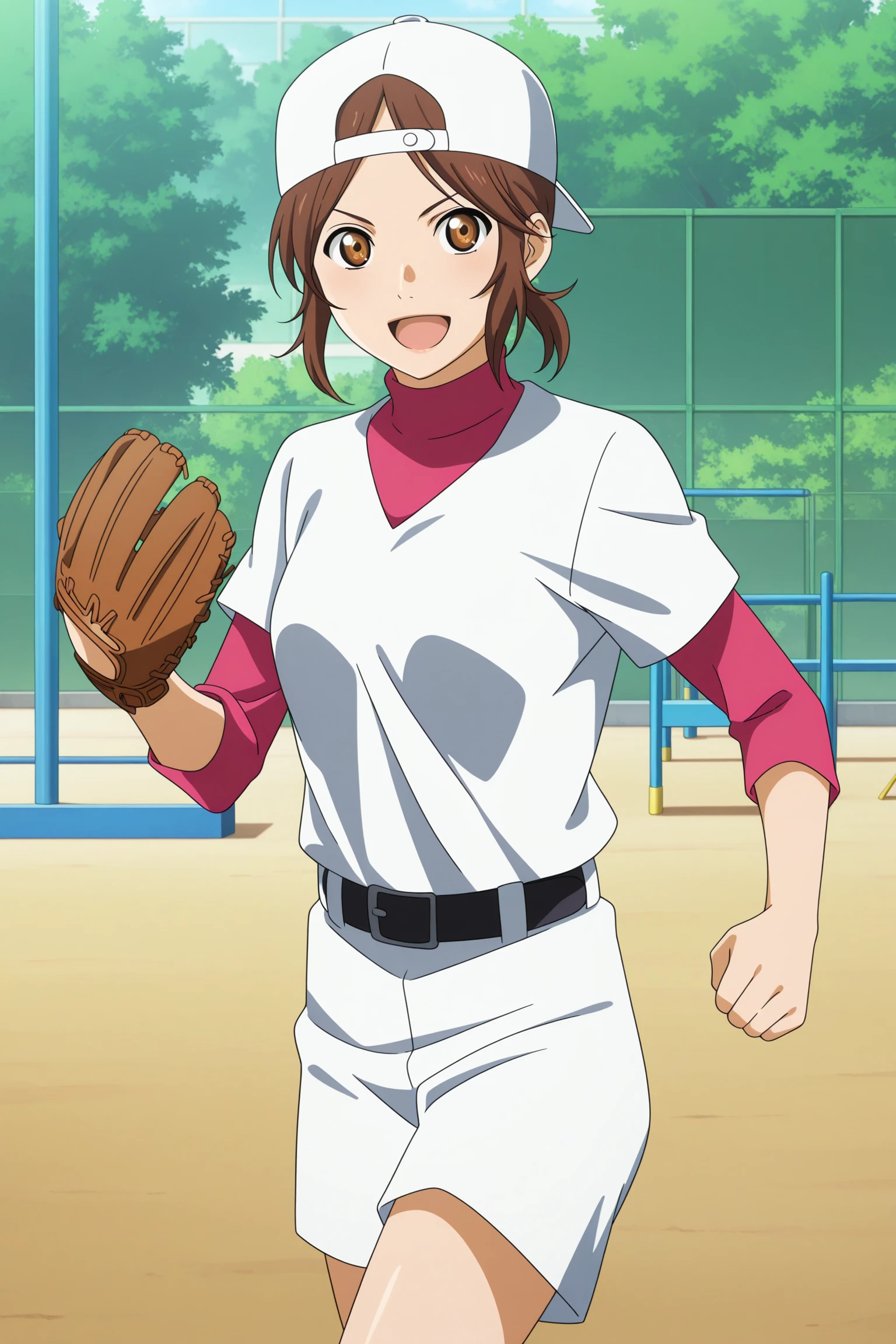 sawabe tsubaki, short hair, brown hair, baseball cap, backwards hat, white hat, short ponytail, parted bangs, brown eyes, three-quarter sleeves, shirt under shirt, pink shirt, turtleneck, white shirt, v-neck, belt, white shorts, two-tone socks, kneehighs, uwabaki