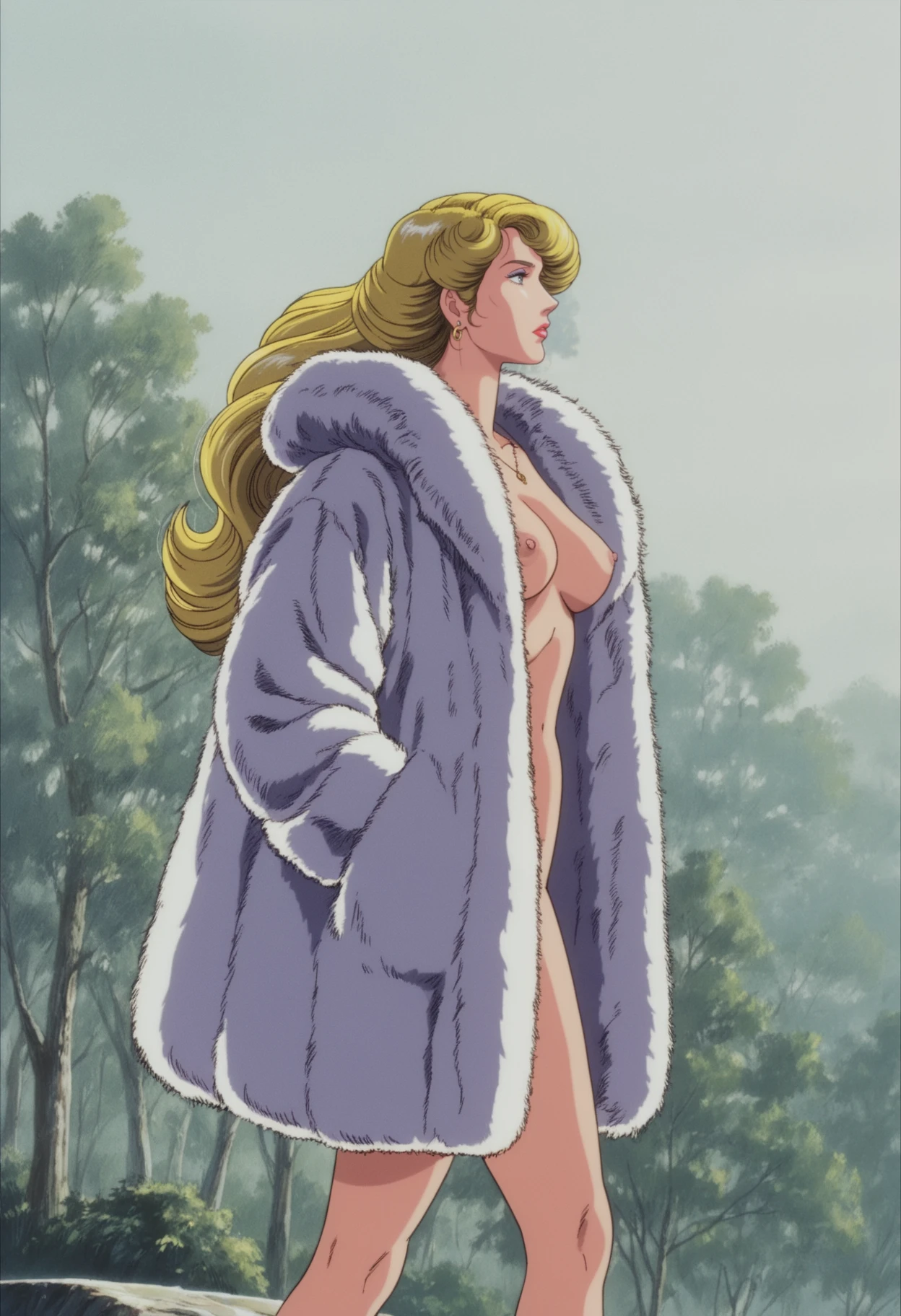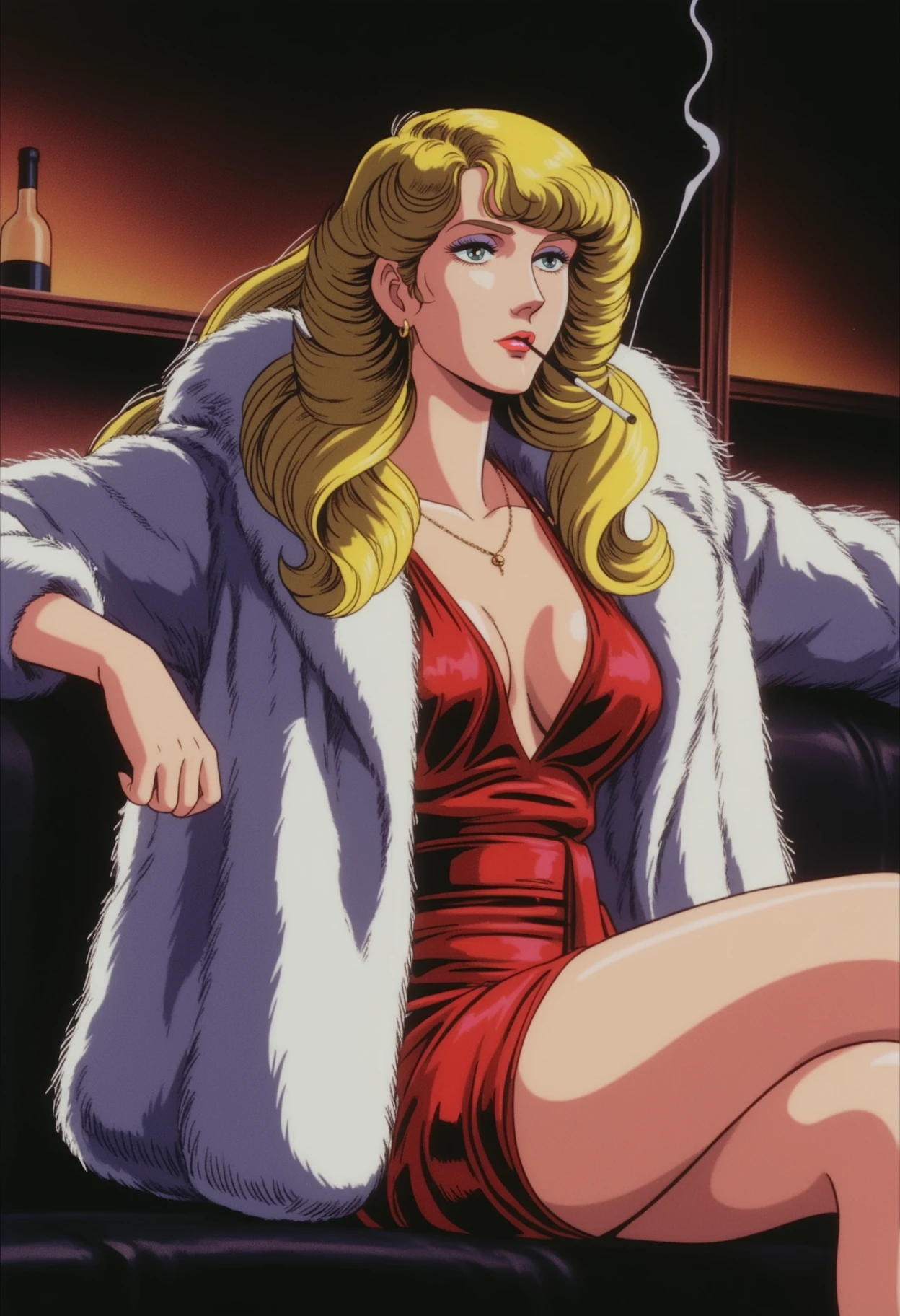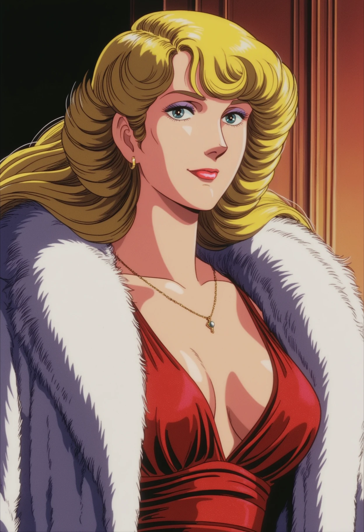 1girl,solo,retro artstyle,anime coloring,blonde hair,long hair,blue eyes,lipstick,purple eyeshadow,medium breasts,earrings,necklace