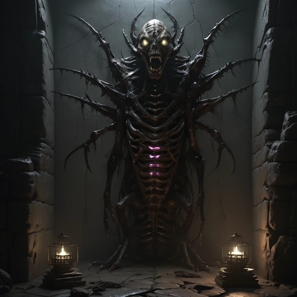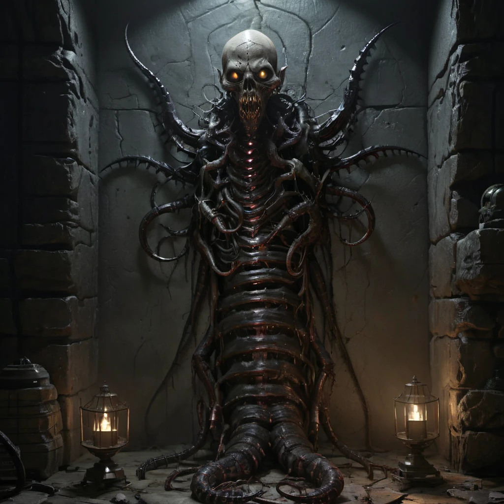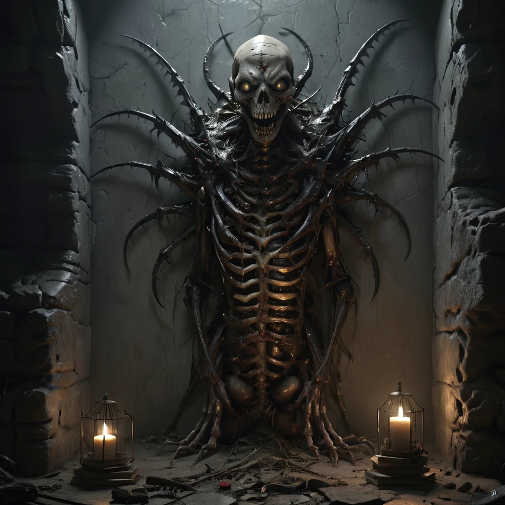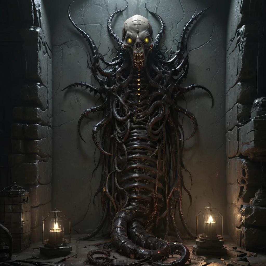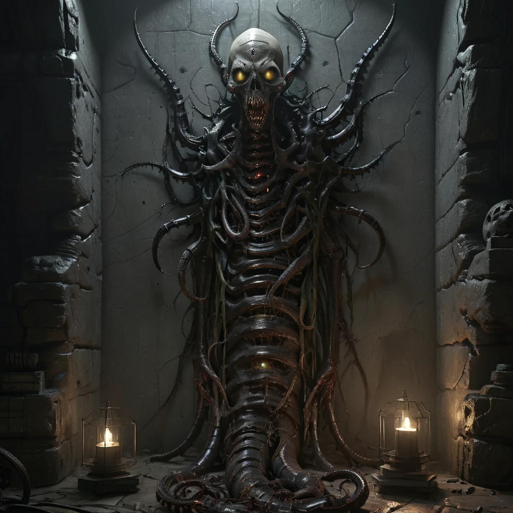 asthikada, bone, book, book stack, cage, candle, candlestand, carapace, crypt, dark, fire, flame, glowing, glowing eyes, hat, indoors, inhuman head, insectoid arms, lamp, looking at viewer, no humans, open mouth, ribs, ruins, scenery, skull, solo, spikes, stairs, standing, stone wall, table, tangled arms, teeth, tentacles, tongue, torch, tree, wall, worm body, yellow eyes,Description