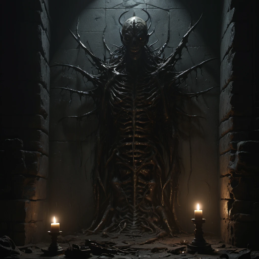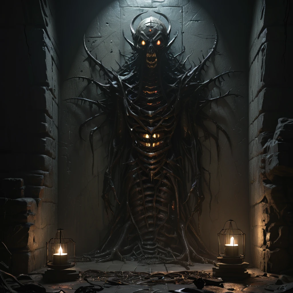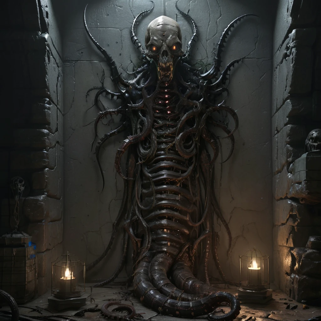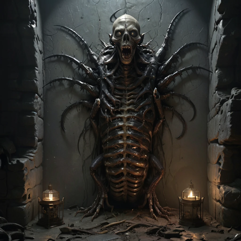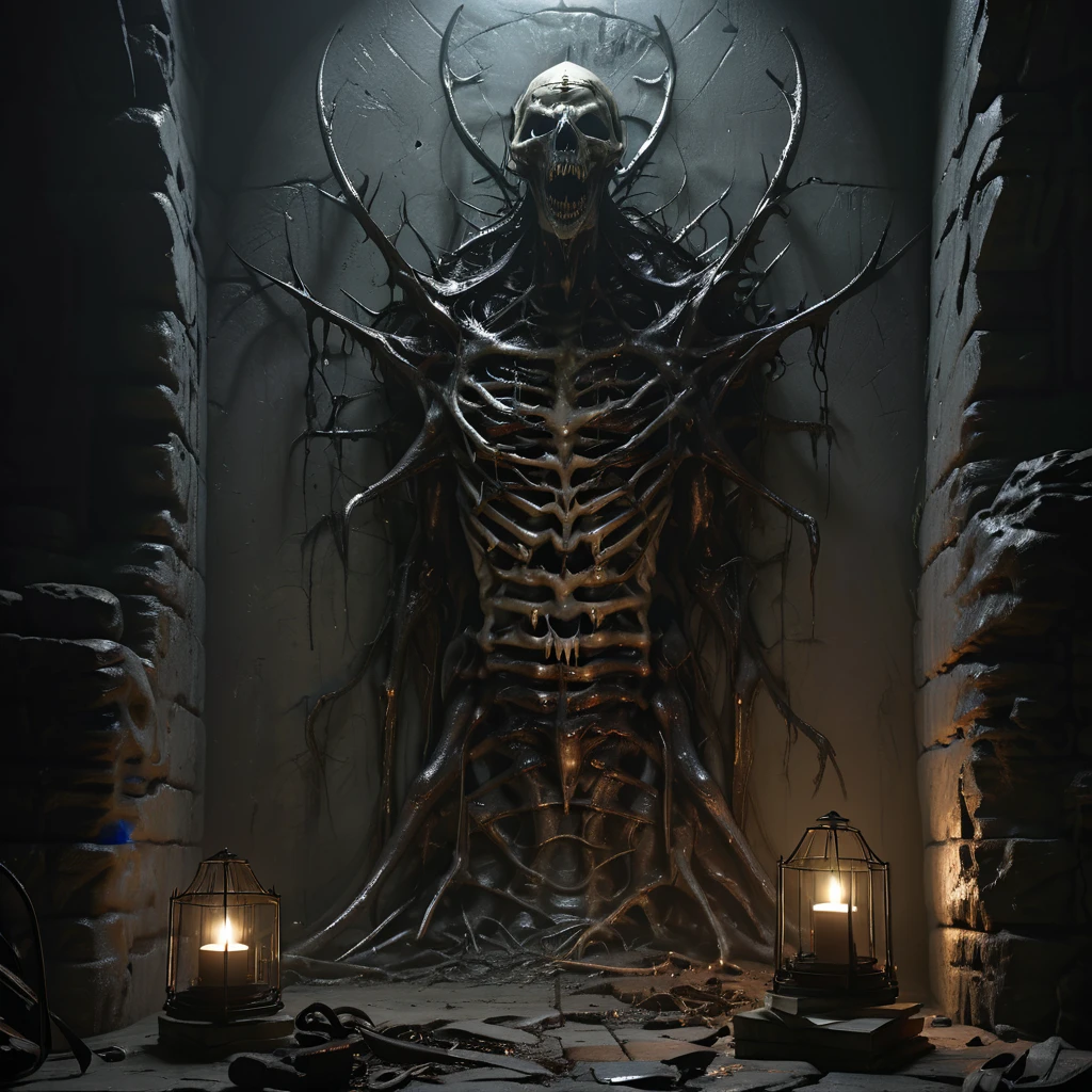 asthikada, bone, book, book stack, cage, candle, candlestand, carapace, crypt, dark, fire, flame, glowing, glowing eyes, hat, indoors, inhuman head, insectoid arms, lamp, looking at viewer, no humans, open mouth, ribs, ruins, scenery, skull, solo, spikes, stairs, standing, stone wall, table, tangled arms, teeth, tentacles, tongue, torch, tree, wall, worm body, yellow eyes,Description
