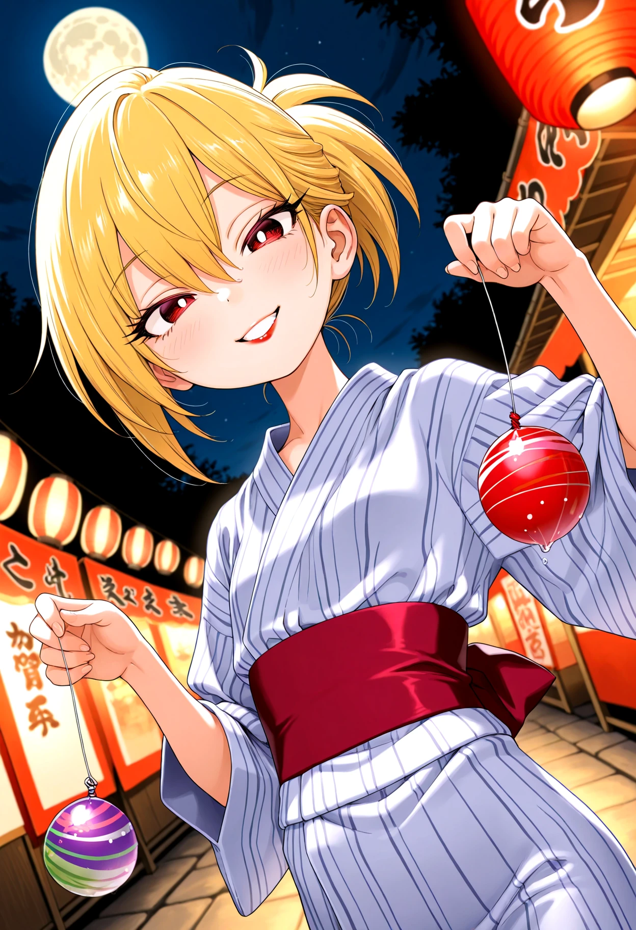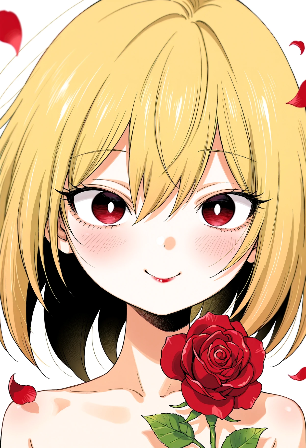 HimekawaIbara, blonde hair, hair between eyes, long eyelashes, white pupils, petite, red lips, skinny, narrow waist, slim legs, thigh gap,