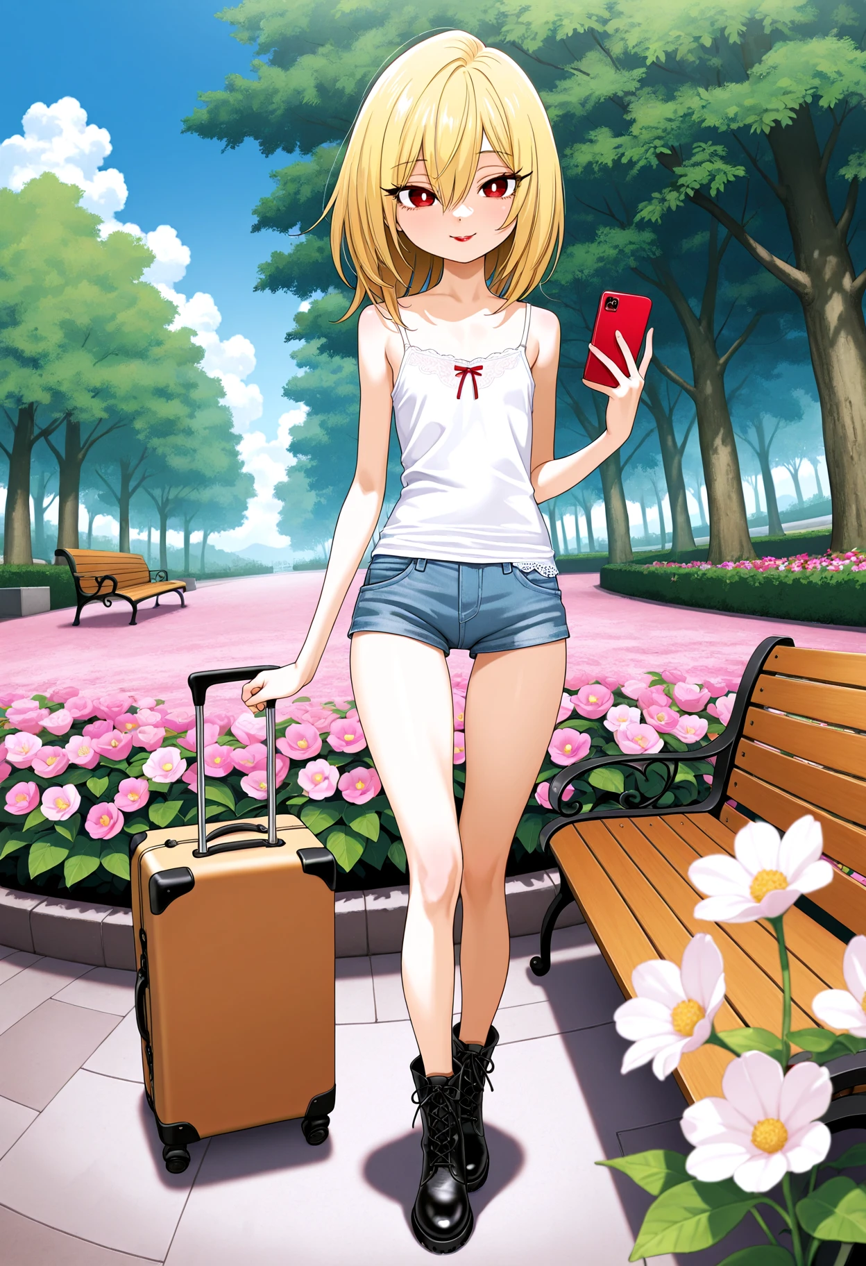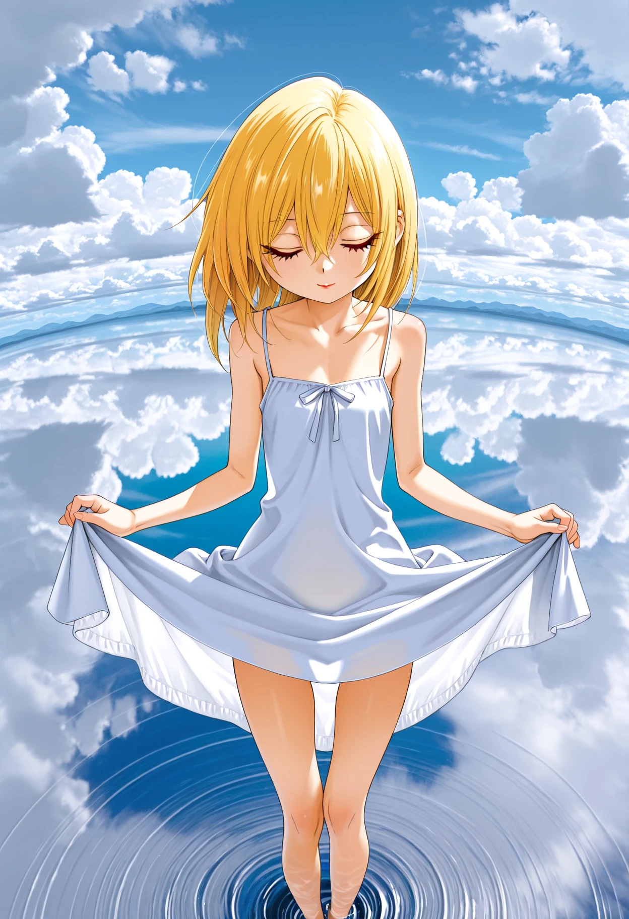 HimekawaIbara, blonde hair, hair between eyes, long eyelashes, white pupils, petite, red lips, skinny, narrow waist, slim legs, thigh gap, 構図によっては太もものプロンプトなど不要なものを削ってください。 ( slim legs, thigh gap ) 削らない場合、ロングスカートがミニスカートになるなどの、意図せず太ももを露出する副作用がある場合があります。