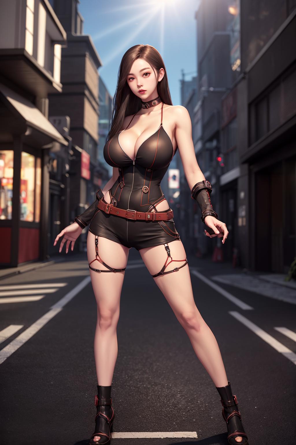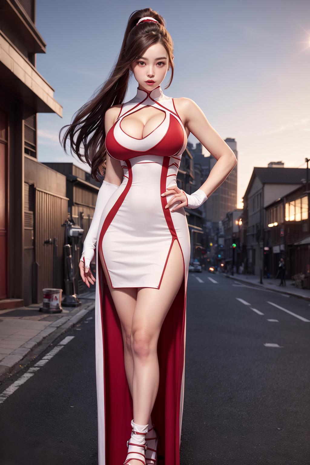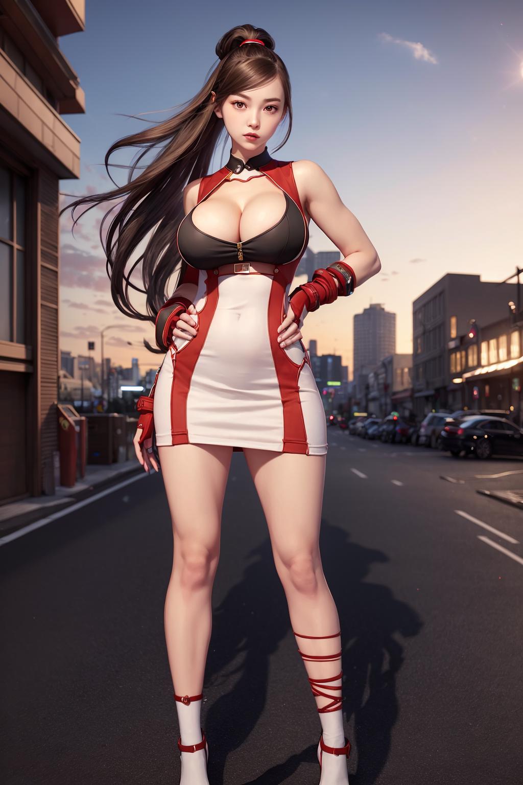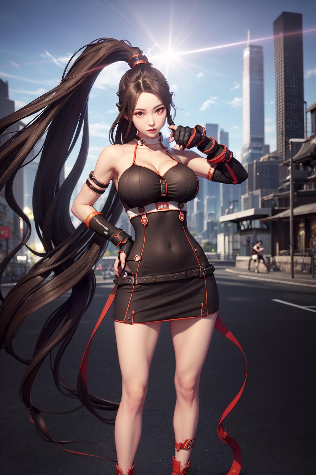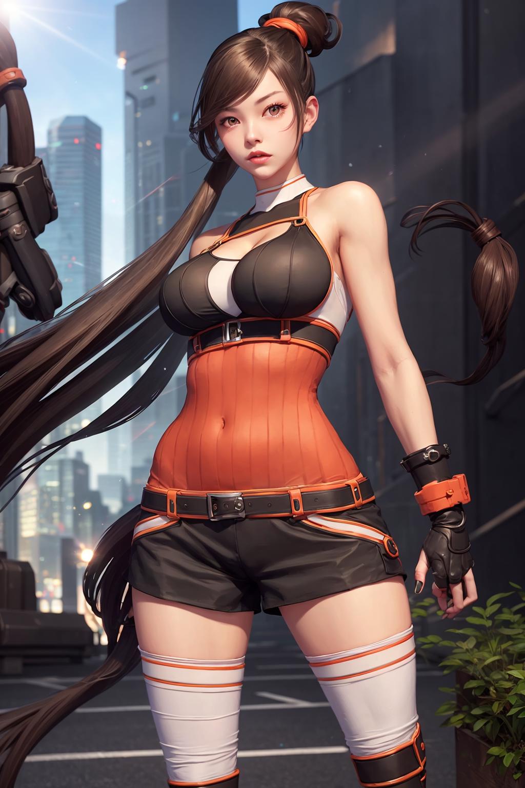 very long hair, orange shirt, gloves, fingerless gloves, shorts,bandages, shirt, low-tied long hair, bandaid, elbow pads, ponytail, black shorts,