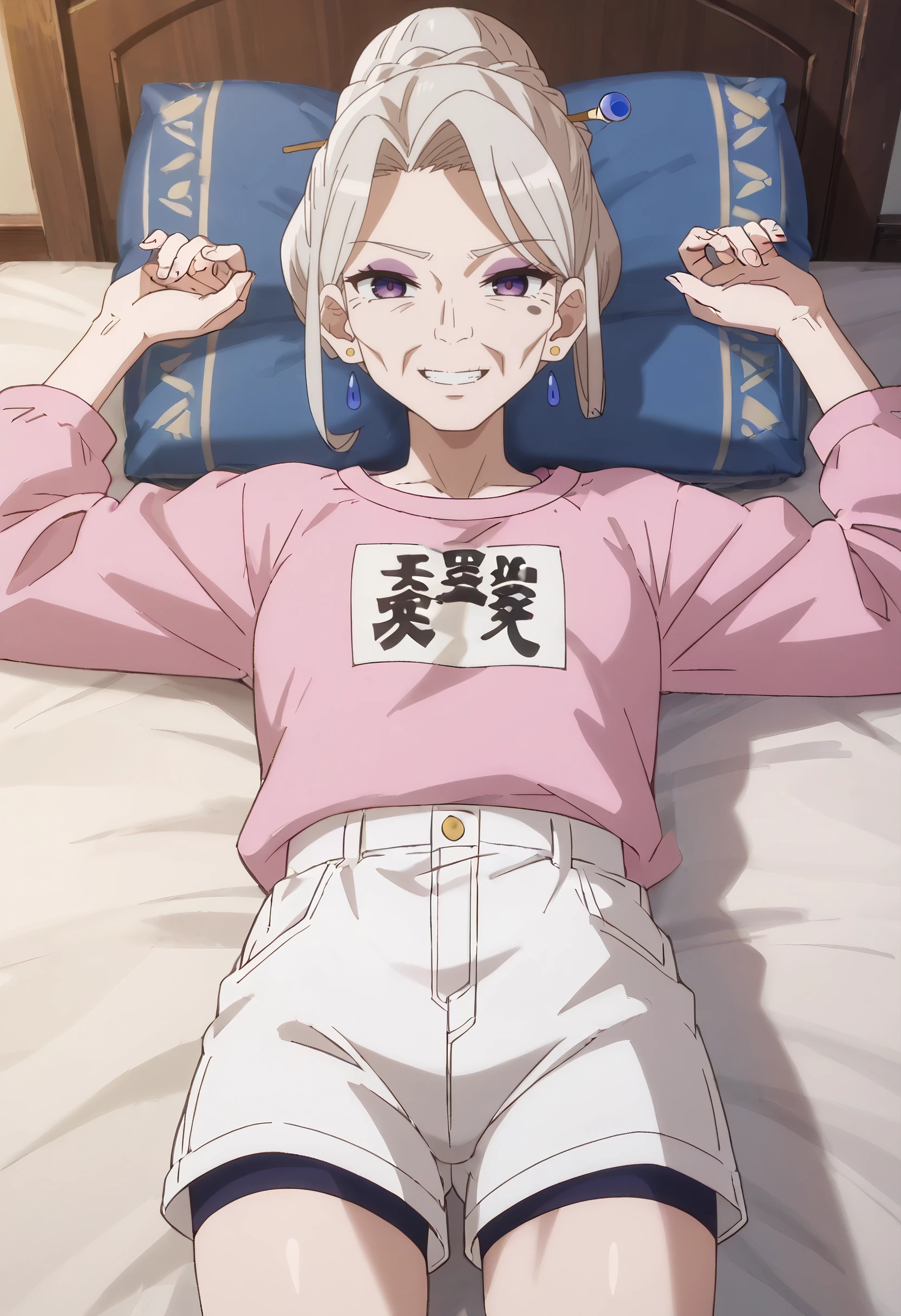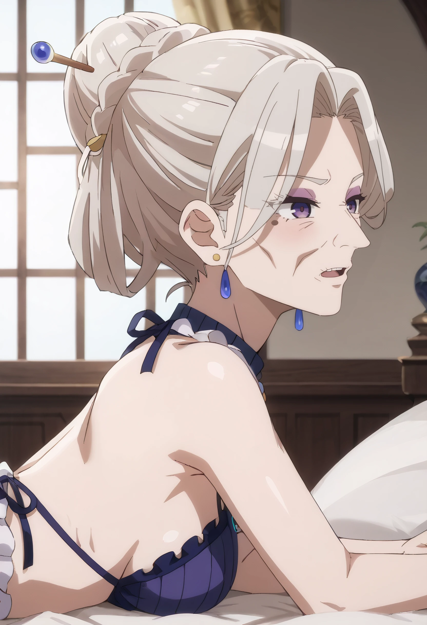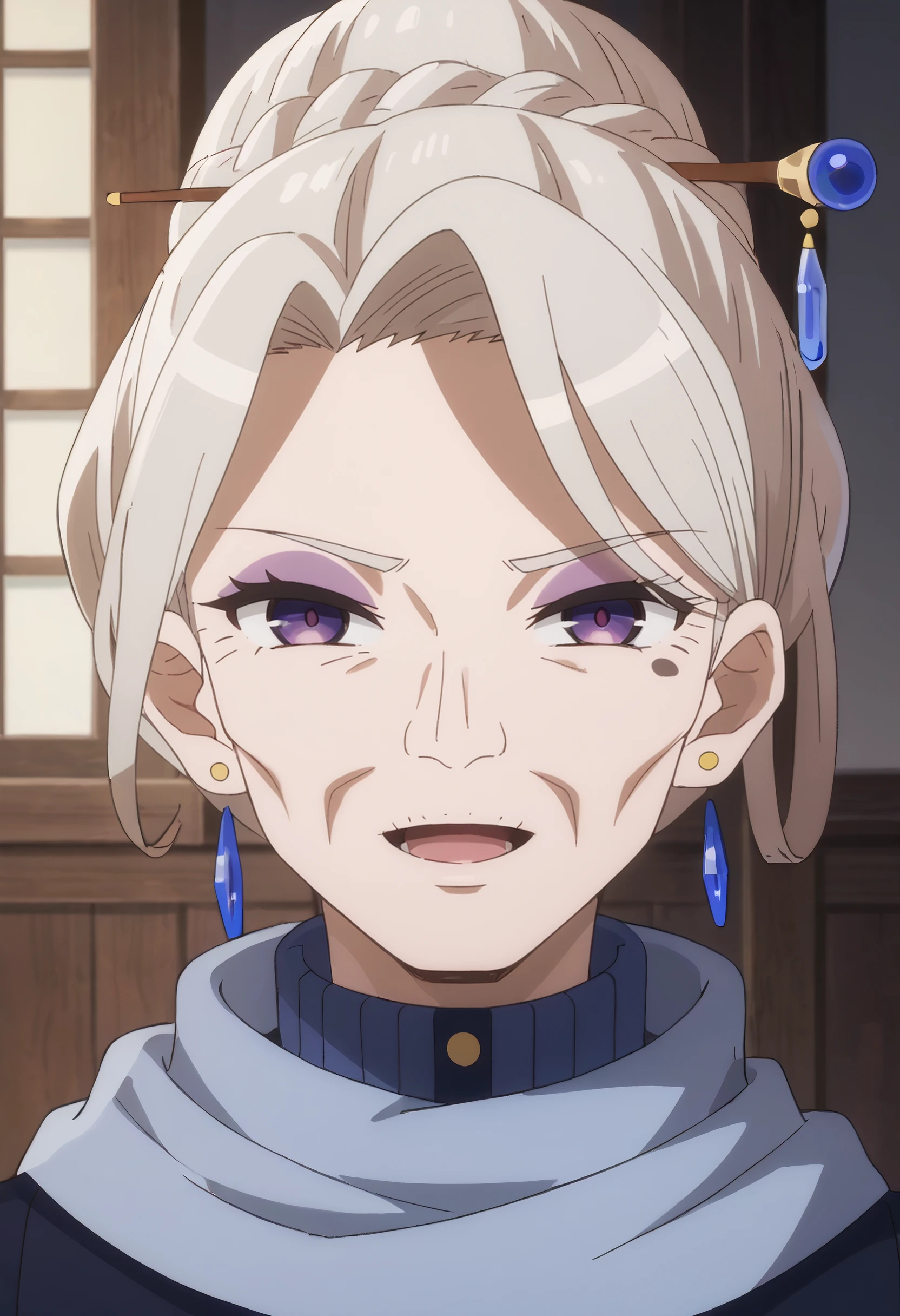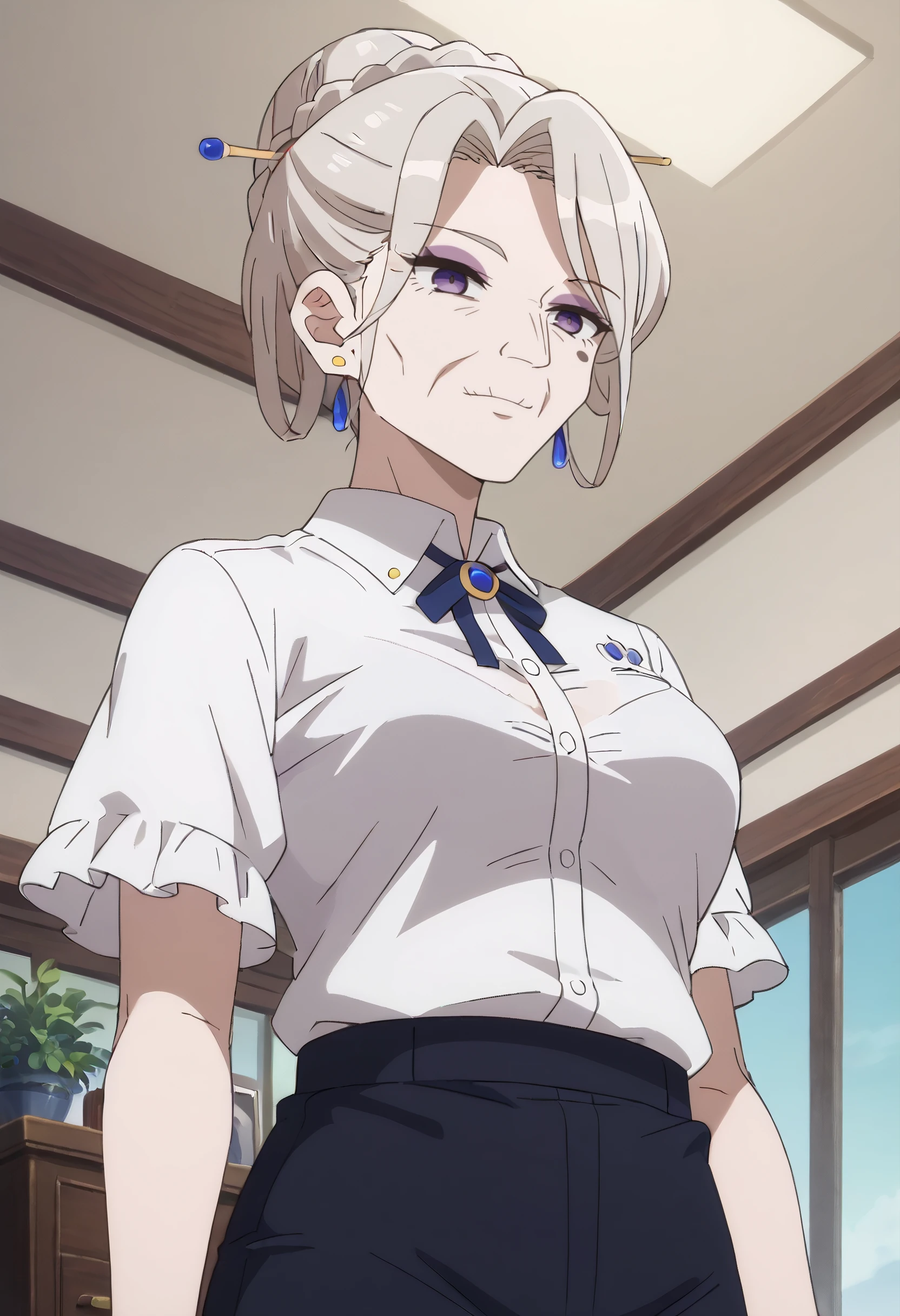 AMGFaust, mole, purple eyes, bangs, long hair, eyebrows visible through hair, white hair, hair bun, braid, hair between eyes,