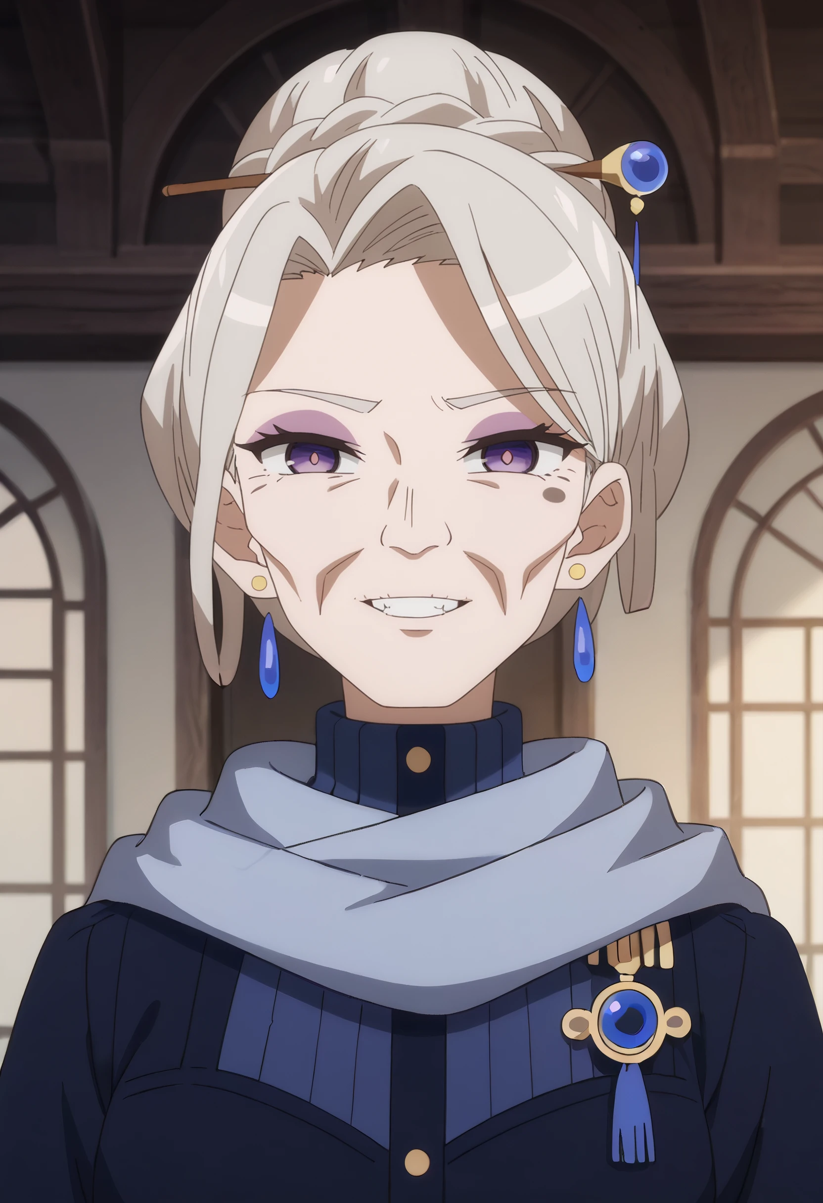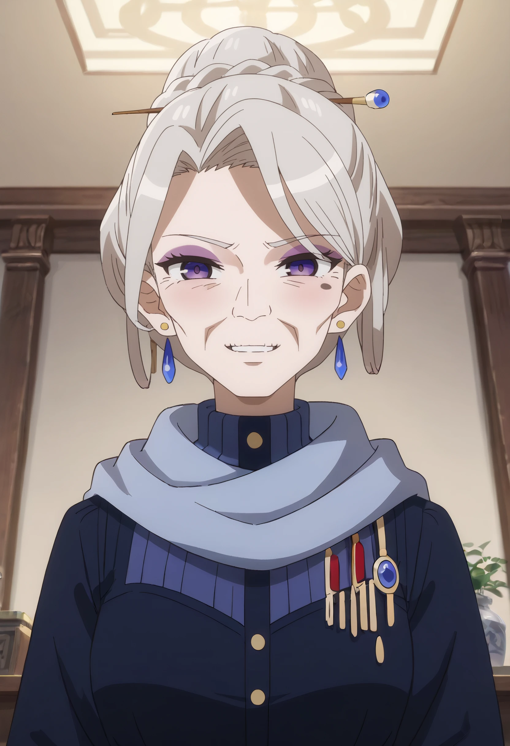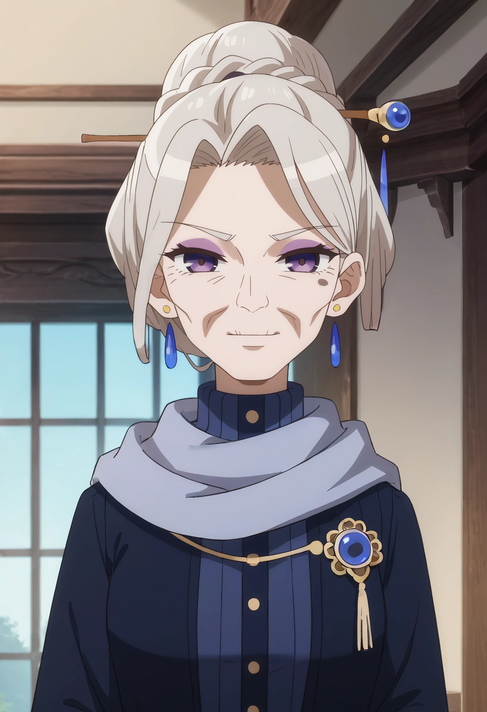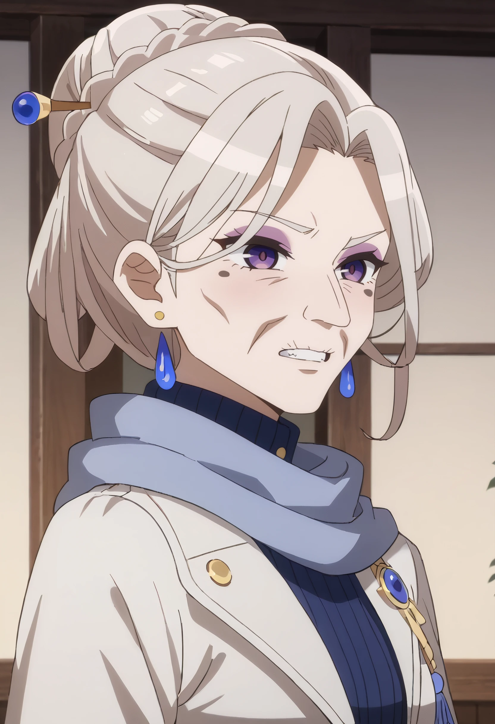 earrings, jewelry, hair ornament, scarf, turtleneck, blue scarf, makeup, high collar, dress, coat, long sleeves, crystal earrings,