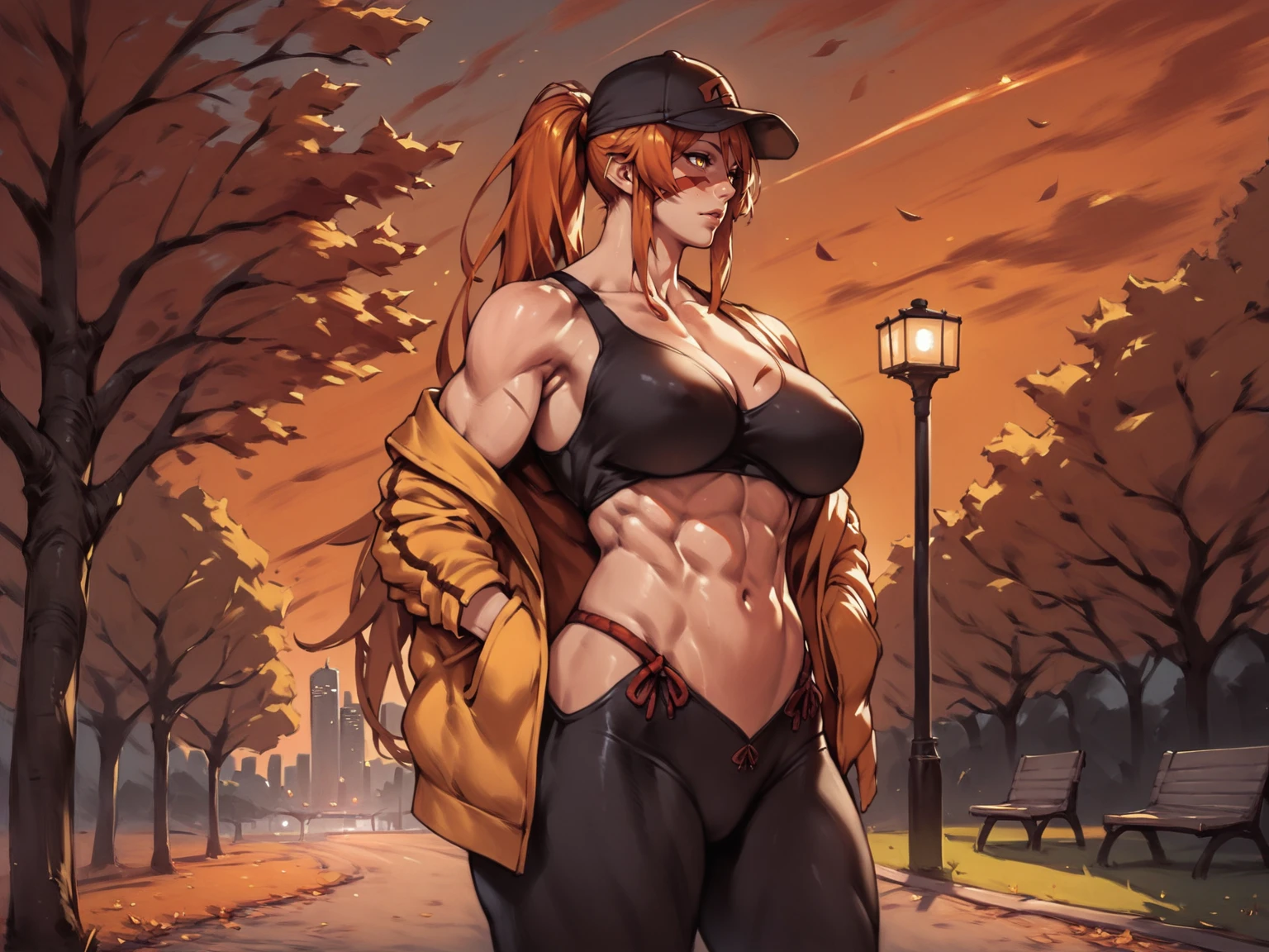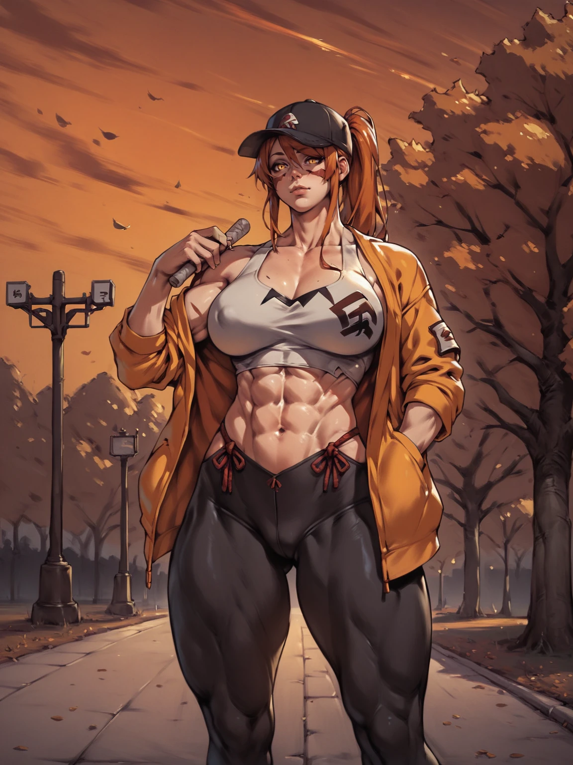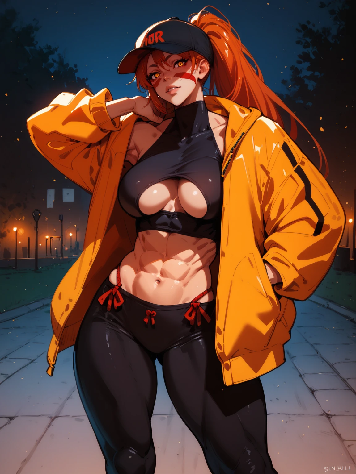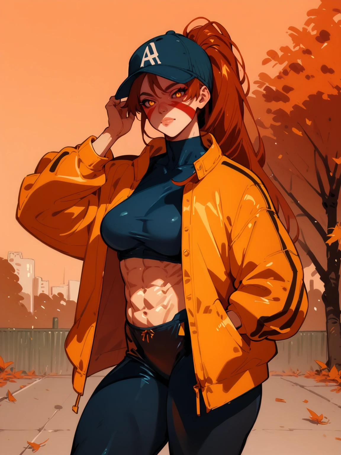 Use tags: fuuma kotarou, 1girl, red facepaint, orange long hair, muscular female, muscular, large breasts, yellow eyes, pants, thighs
