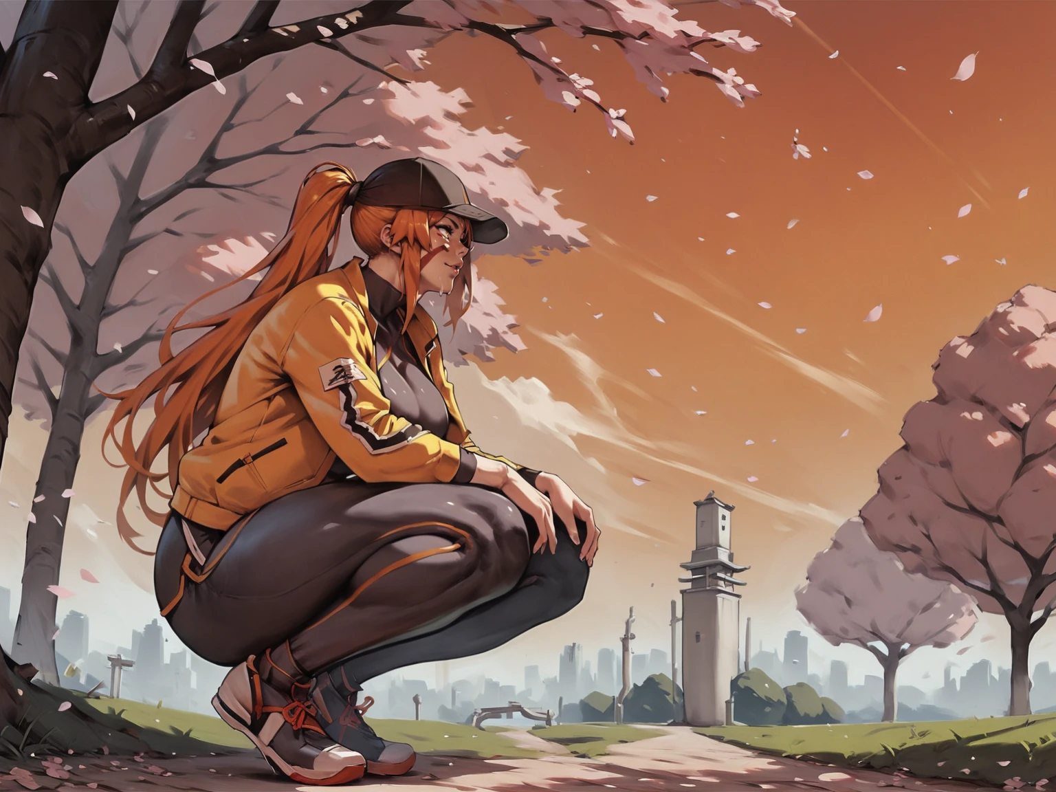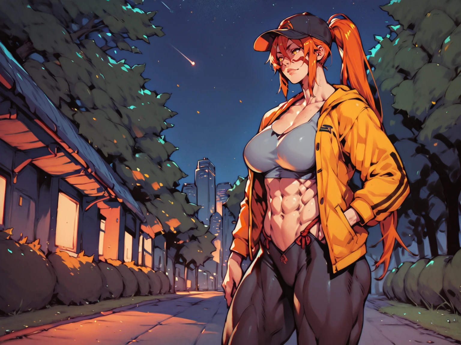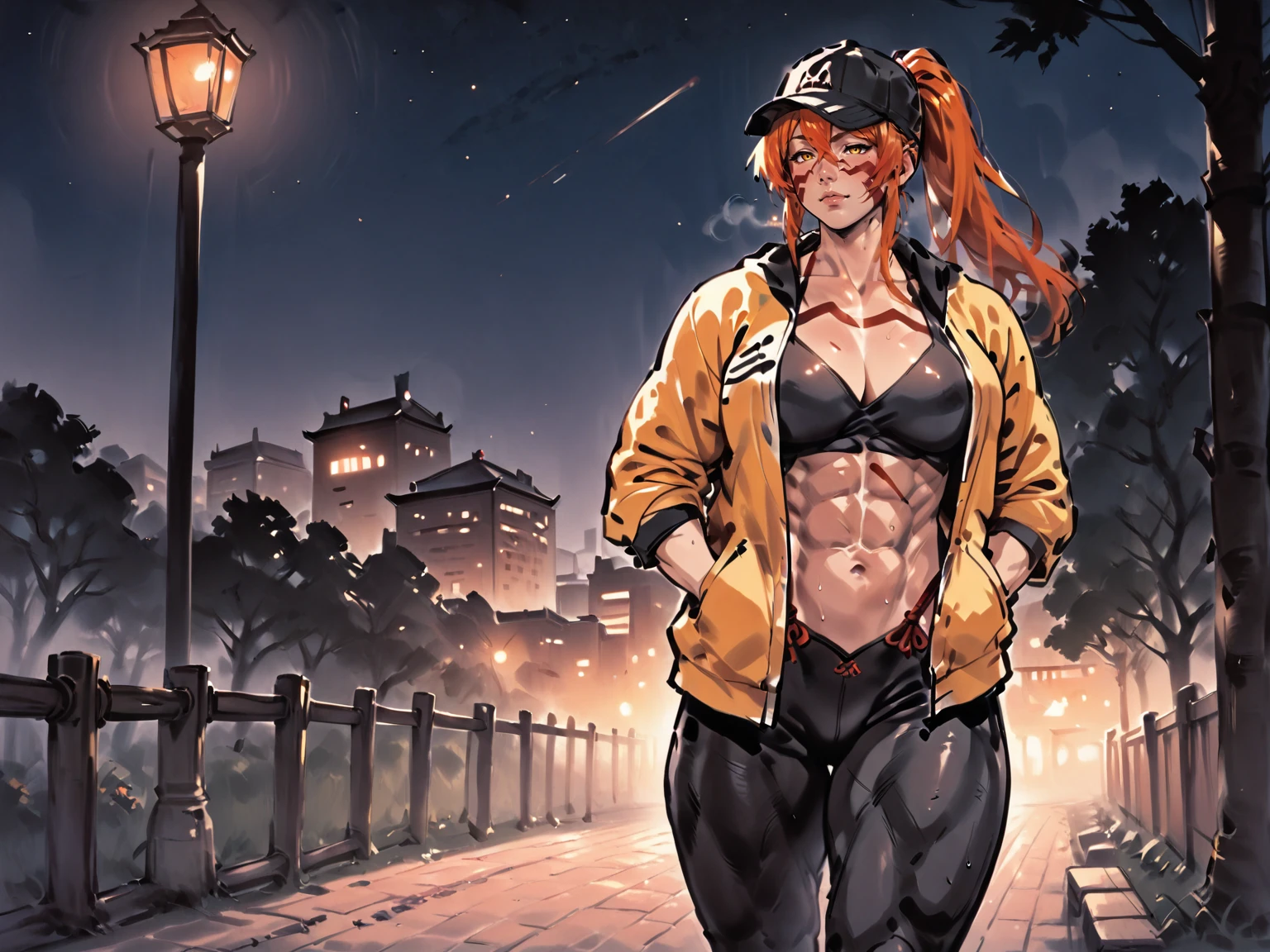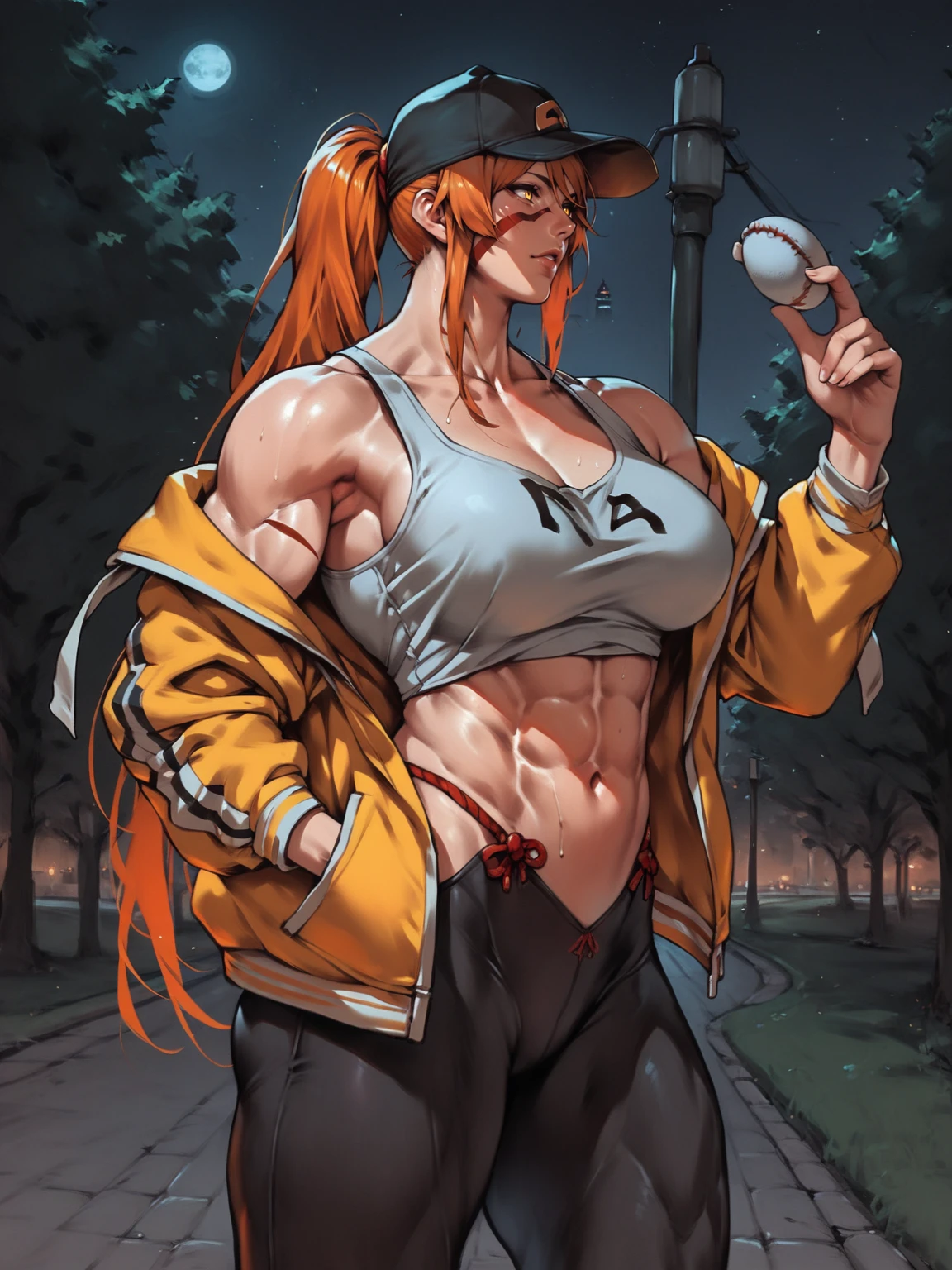 Use tags: fuuma kotarou, 1girl, red facepaint, orange long hair, muscular female, muscular, large breasts, yellow eyes, pants, thighs