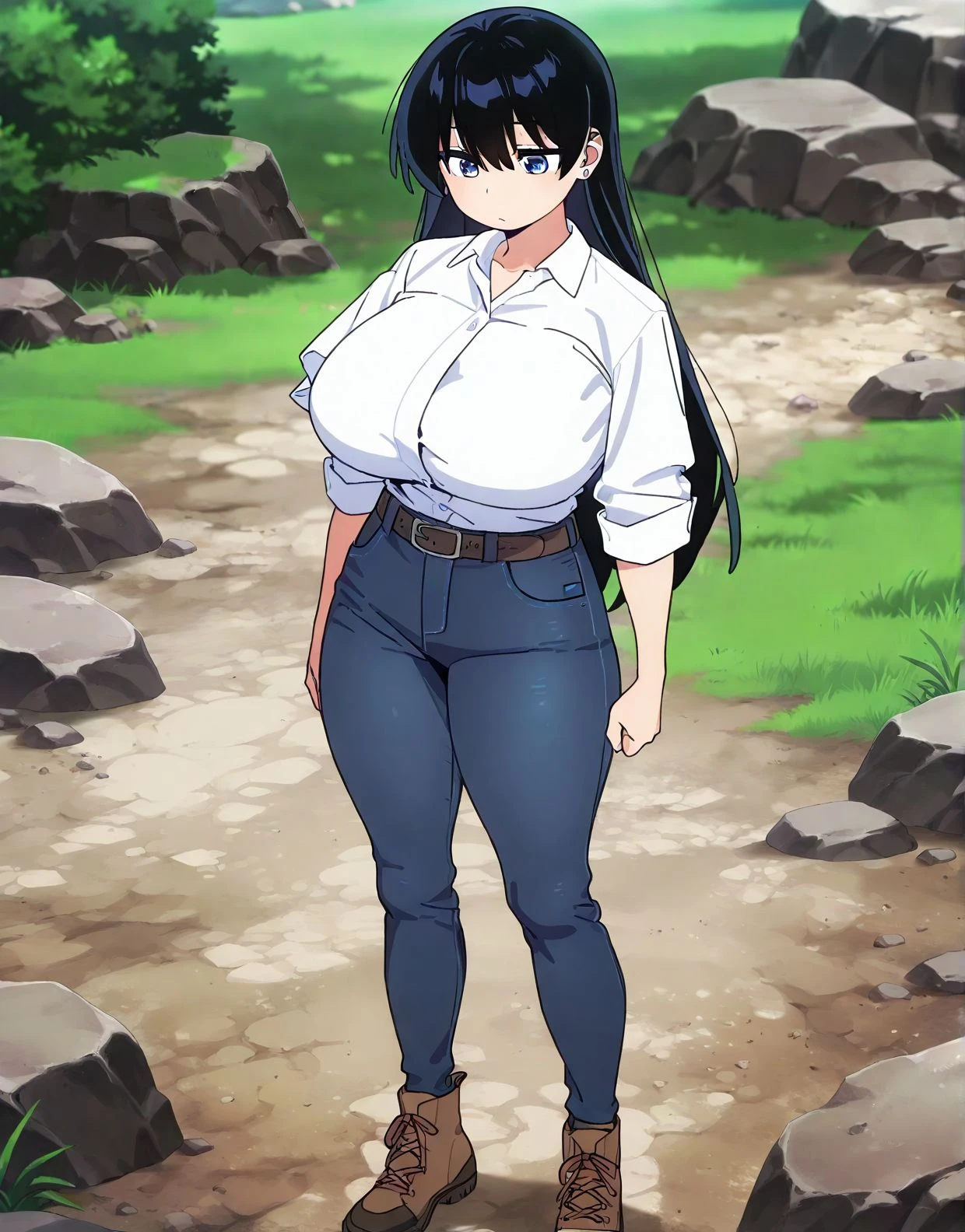 white shirt,brown belt,huge breasts,