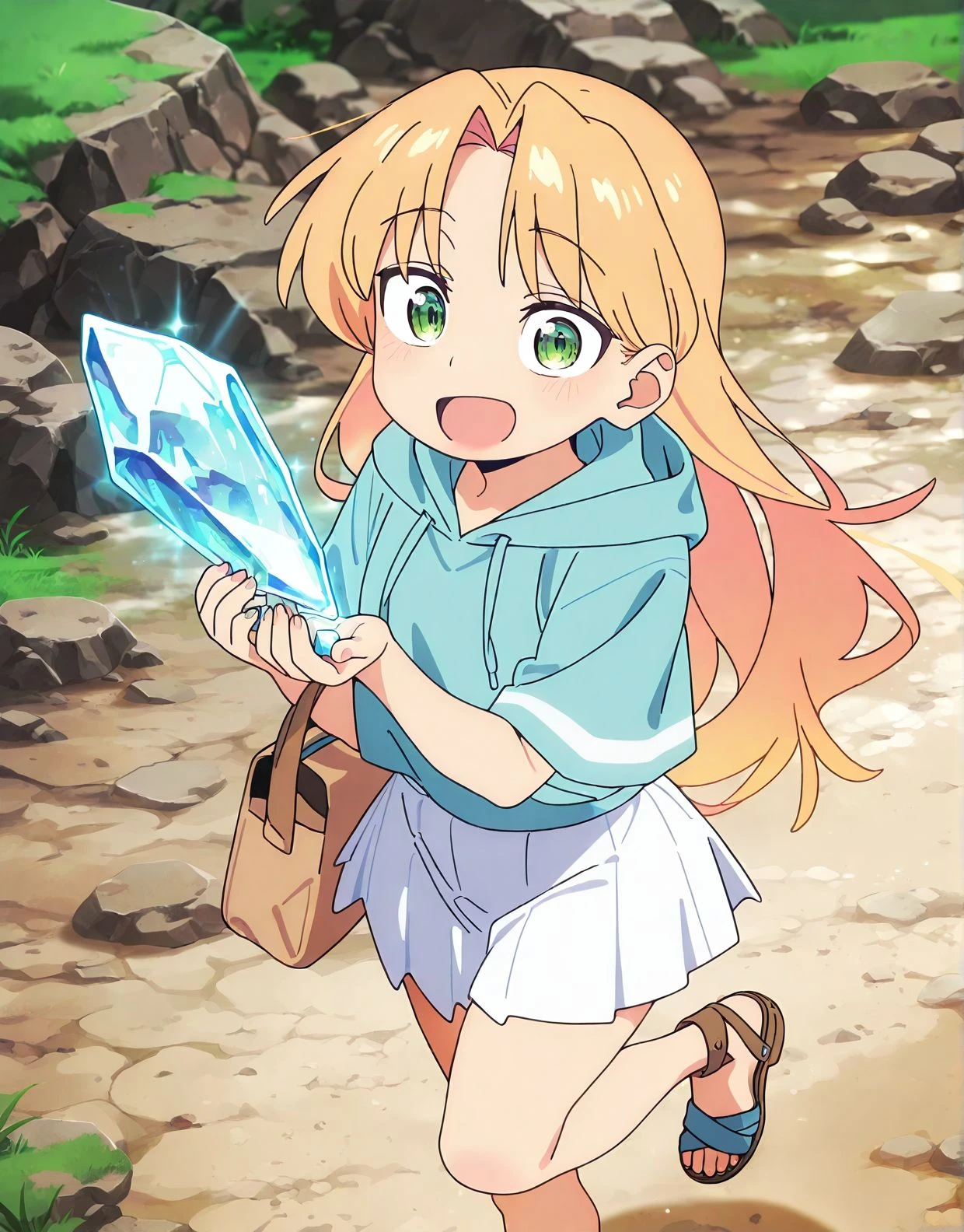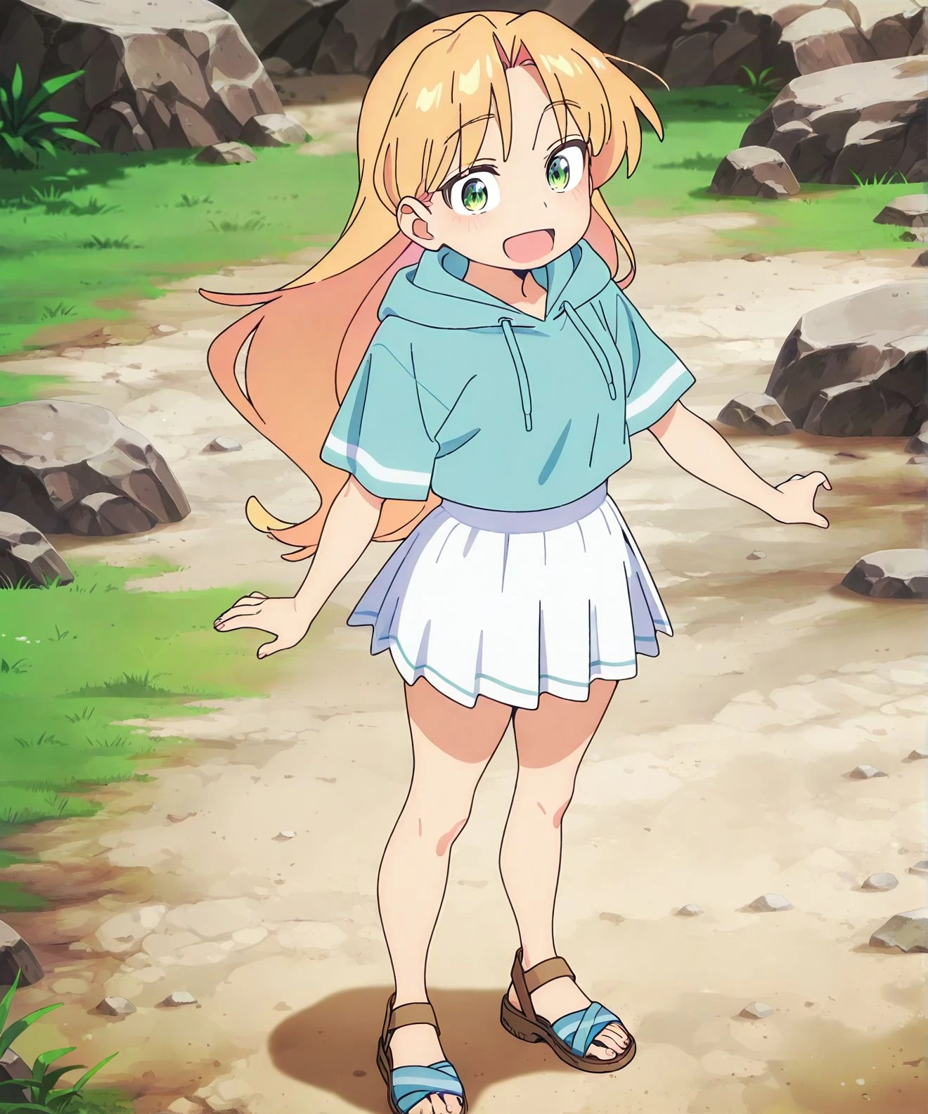 hood,blonde hair,sandals,smile,open mouth,r_ruri,