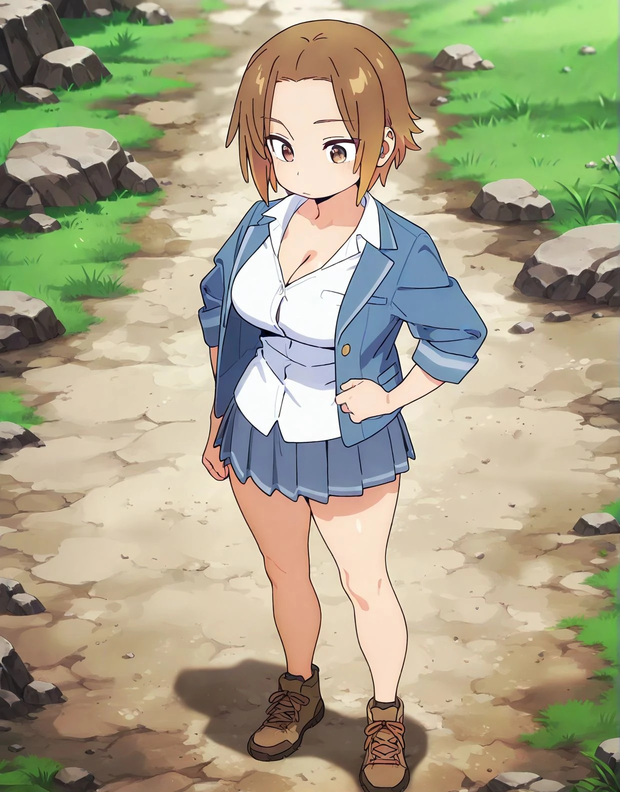 cleavage,short hair,brown hair,pleated skirt,open jacket,