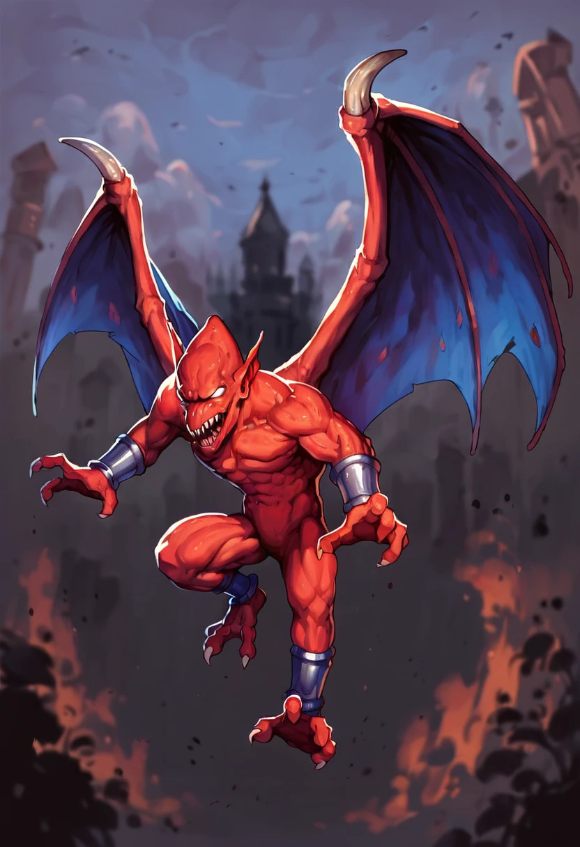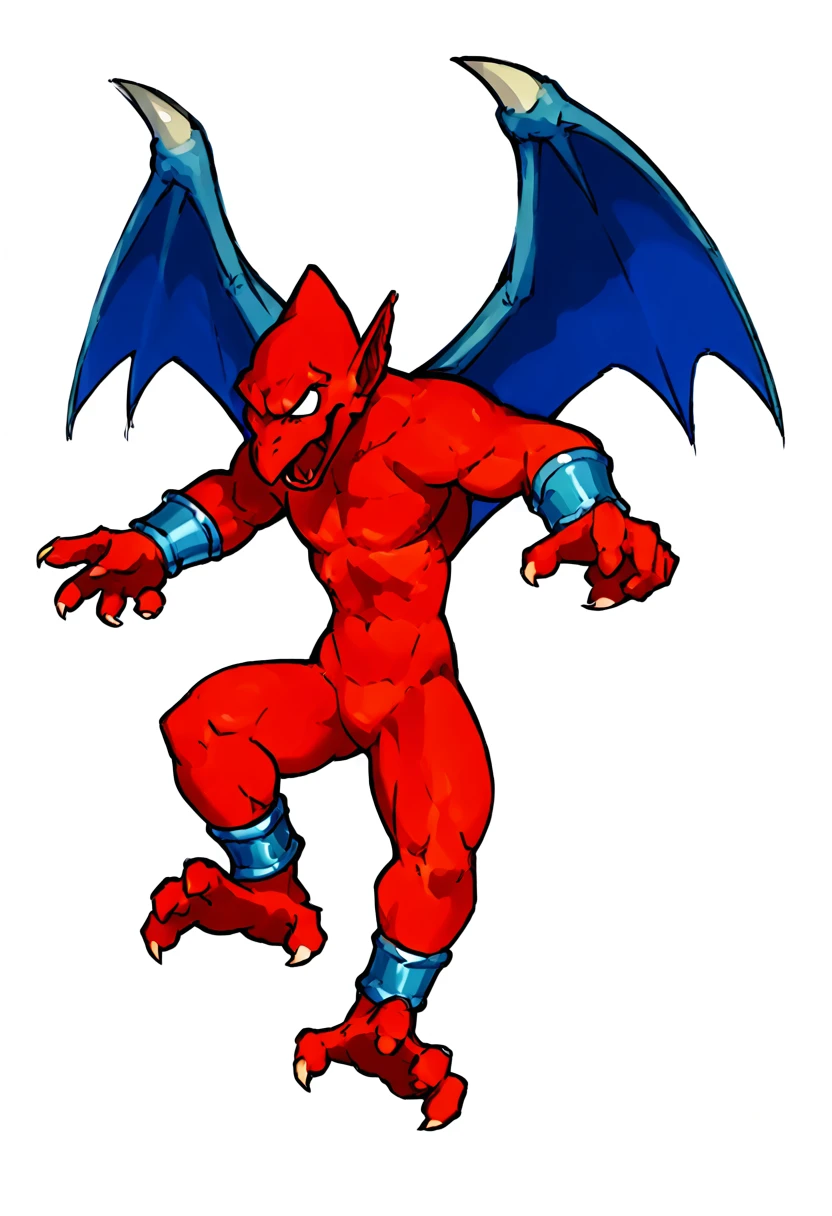 Prompts: Red Arremer, Firebrand, red body, shortstack, ankle cuffs, wrist cuffs, wings, blue wings