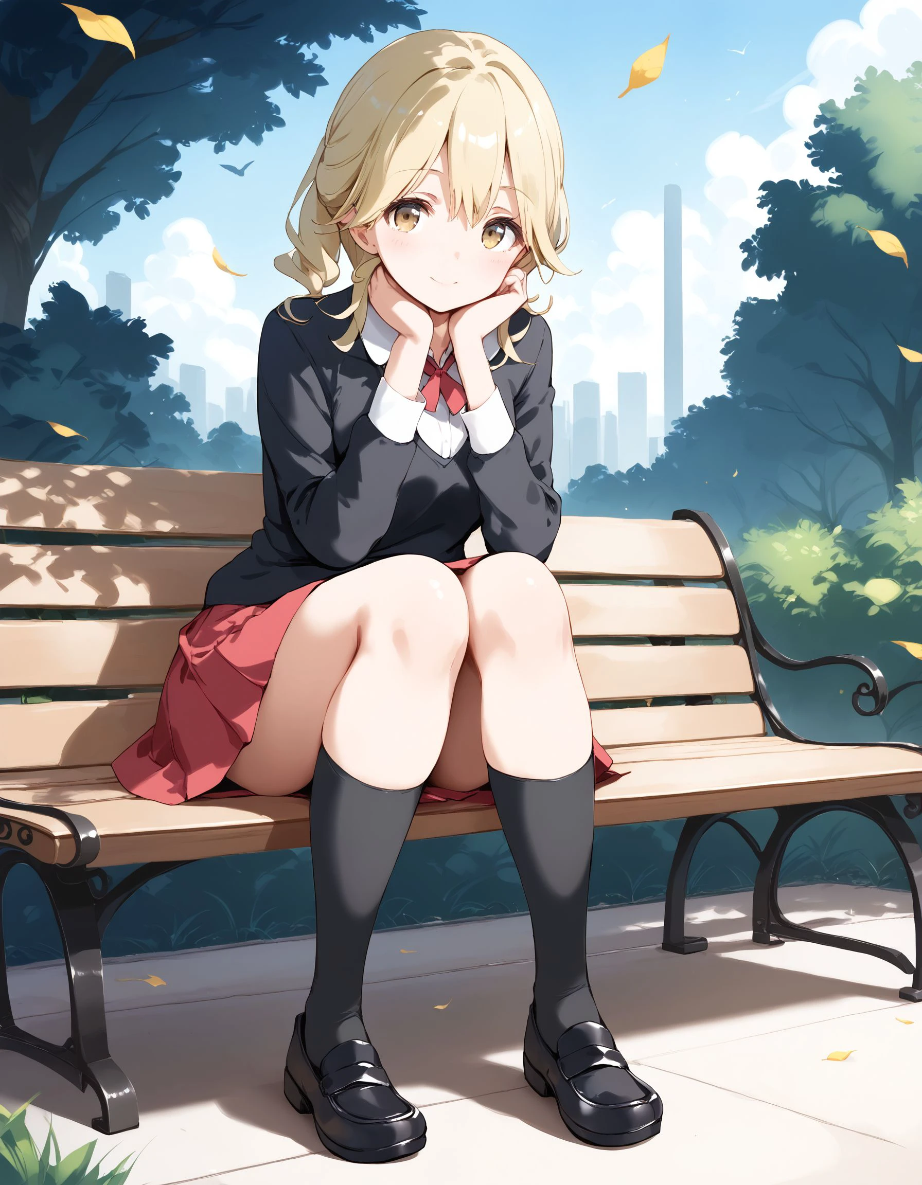 Add "necktie,black sweater,white shirt,skirt,socks,loafers" for her typical look.
