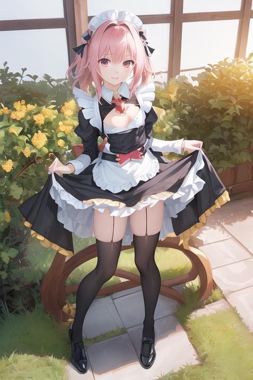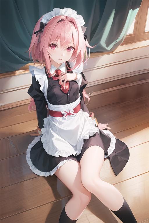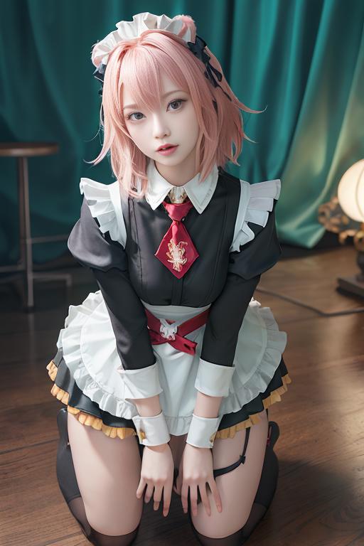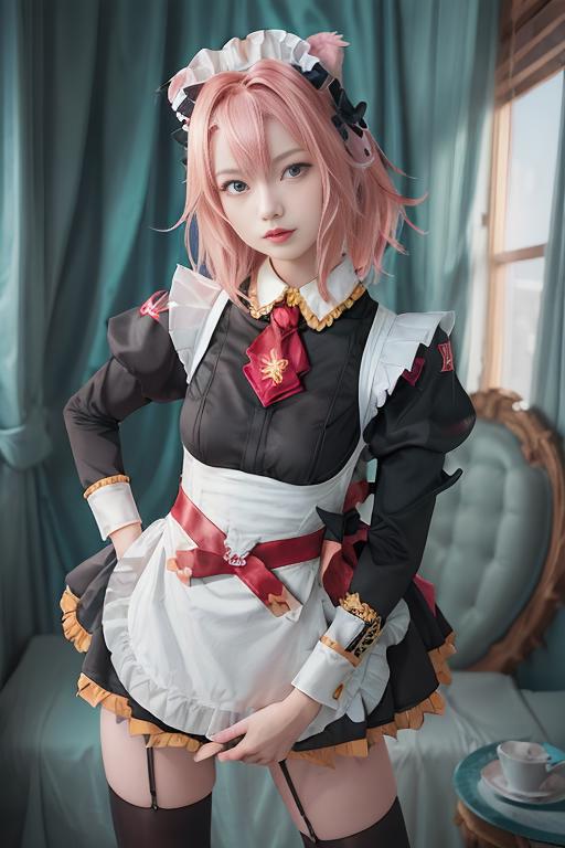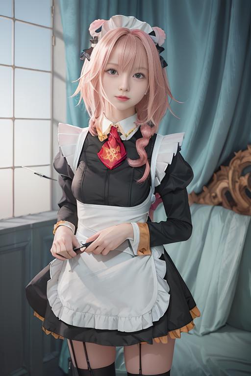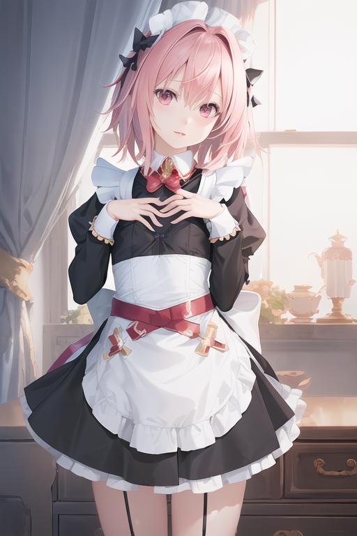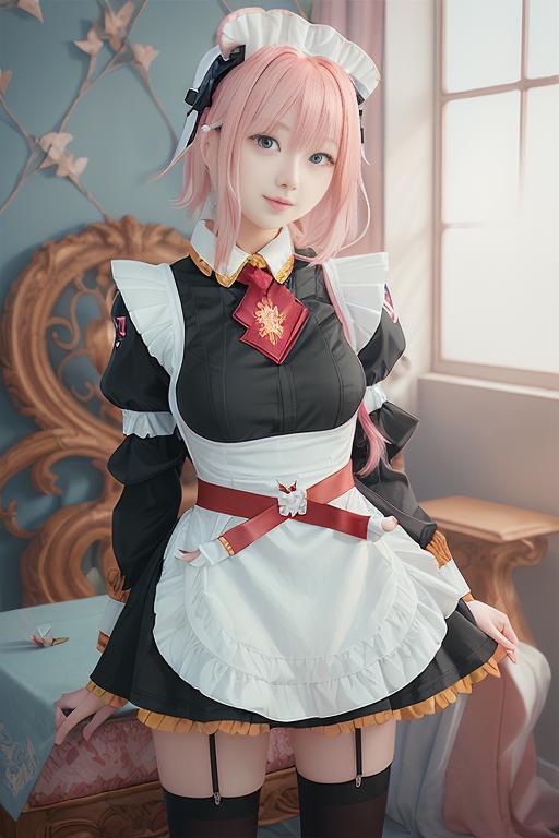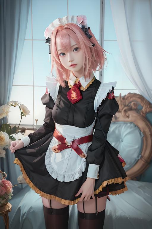 black maid dress with white apron, red necktie with griffin print, pink braided hair, hair bow ribbon, black thighhighs, red waist ribbon,