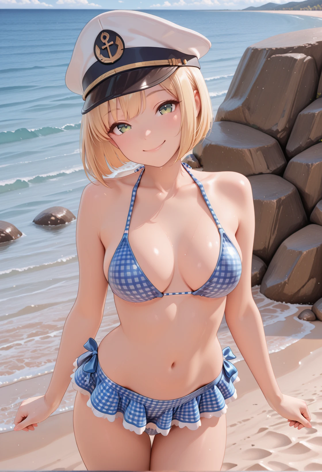 The new summer outfit continues the theme of summer holidays and embodies the carefree summer vibe. It is perfect for those who spend their time at sea or on a yacht. This stylish nautical ensemble features a gingham bikini, a micro skirt with white trim, and a captain’s hat, creating the look of a confident leader ready for yacht adventures.