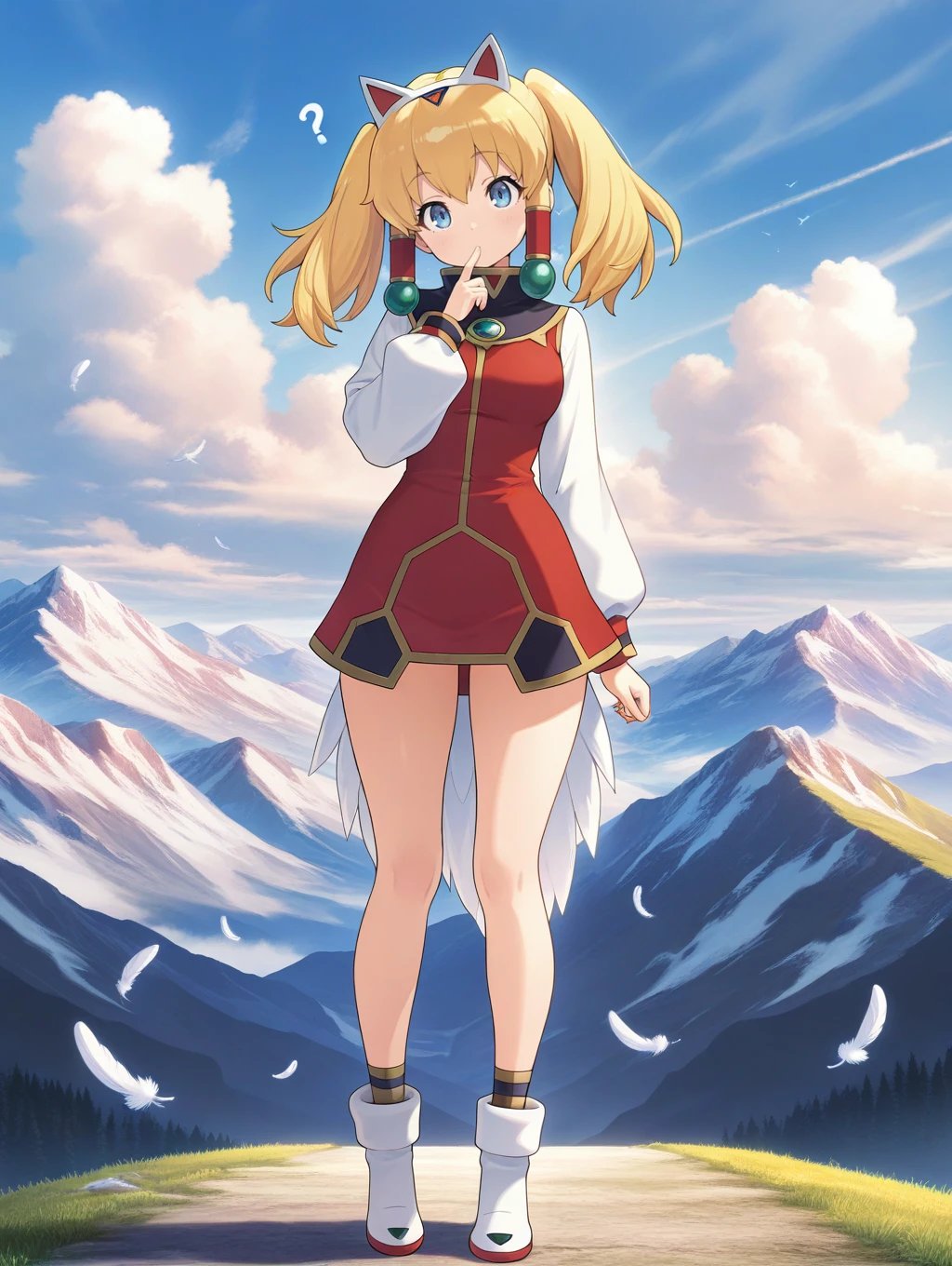 Tags (clothes): red sleeveless dress, cat ear hairband, hair tubes, white long sleeves, white footwear