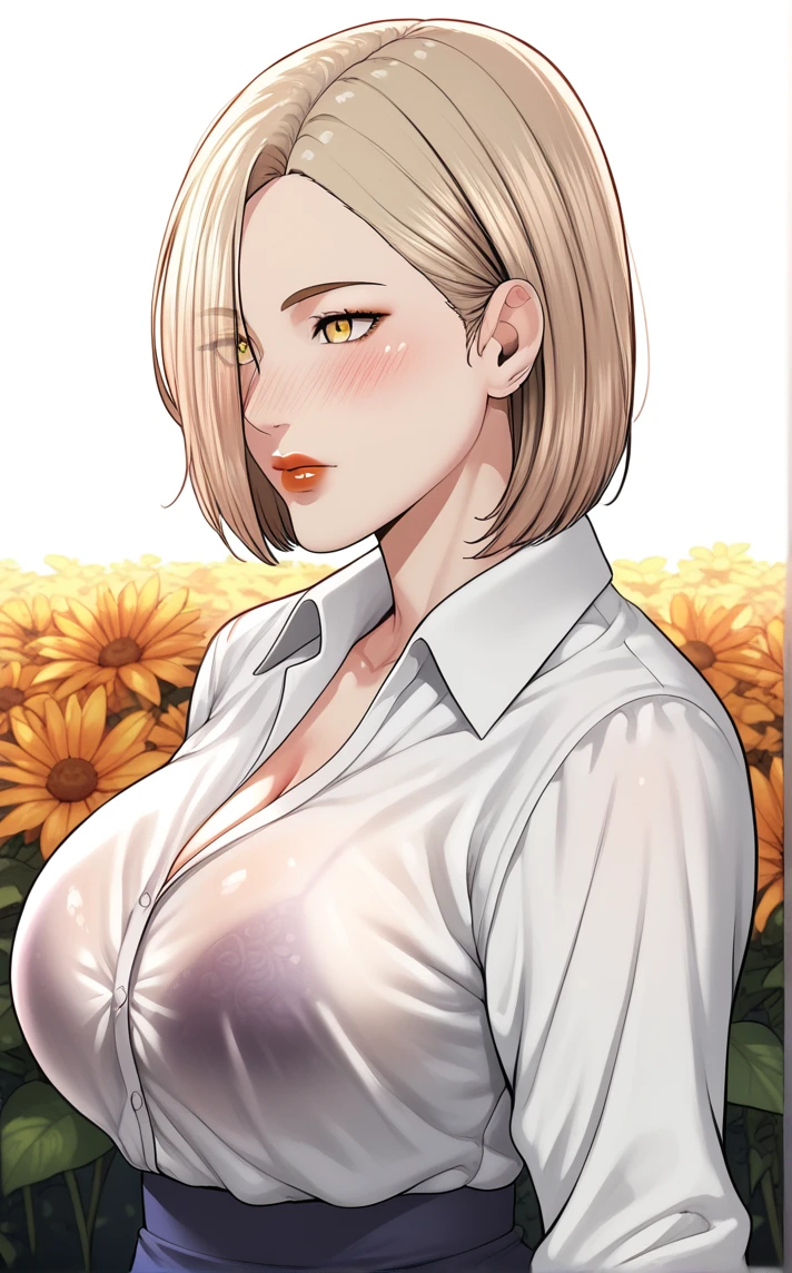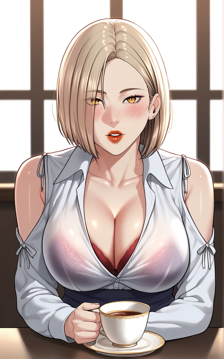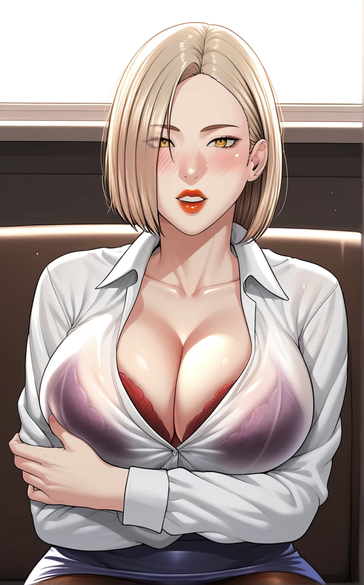 WhiteShirt_Minyoung_ownwaifu, 1girl, blonde hair, bob cut, mature female, medium hair, red lips, yellow eyes, white shirt, collared shirt, collarbone, hair over one eye, large breasts, long sleeves, lipstick, office lady, dress shirt, pencil skirt, bra visible through clothes, eyes visible through hair, shirt tucked in, cleavage, lips, nose blush, blue skirt, brown pantyhose, forehead, eyelashes, high-waist skirt, makeup, hair behind ear, parted bangs, thighband pantyhose, bangs, bralines, open shirt,https://civitai.com/collections/3??32