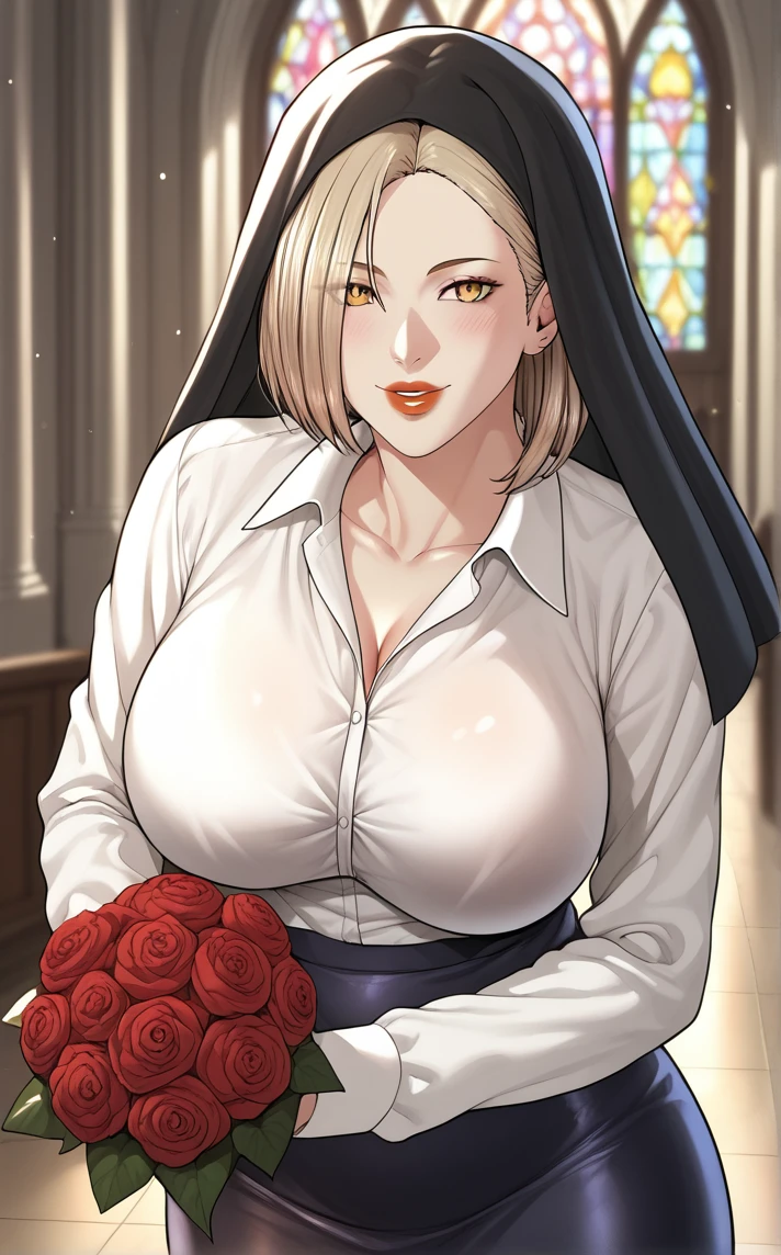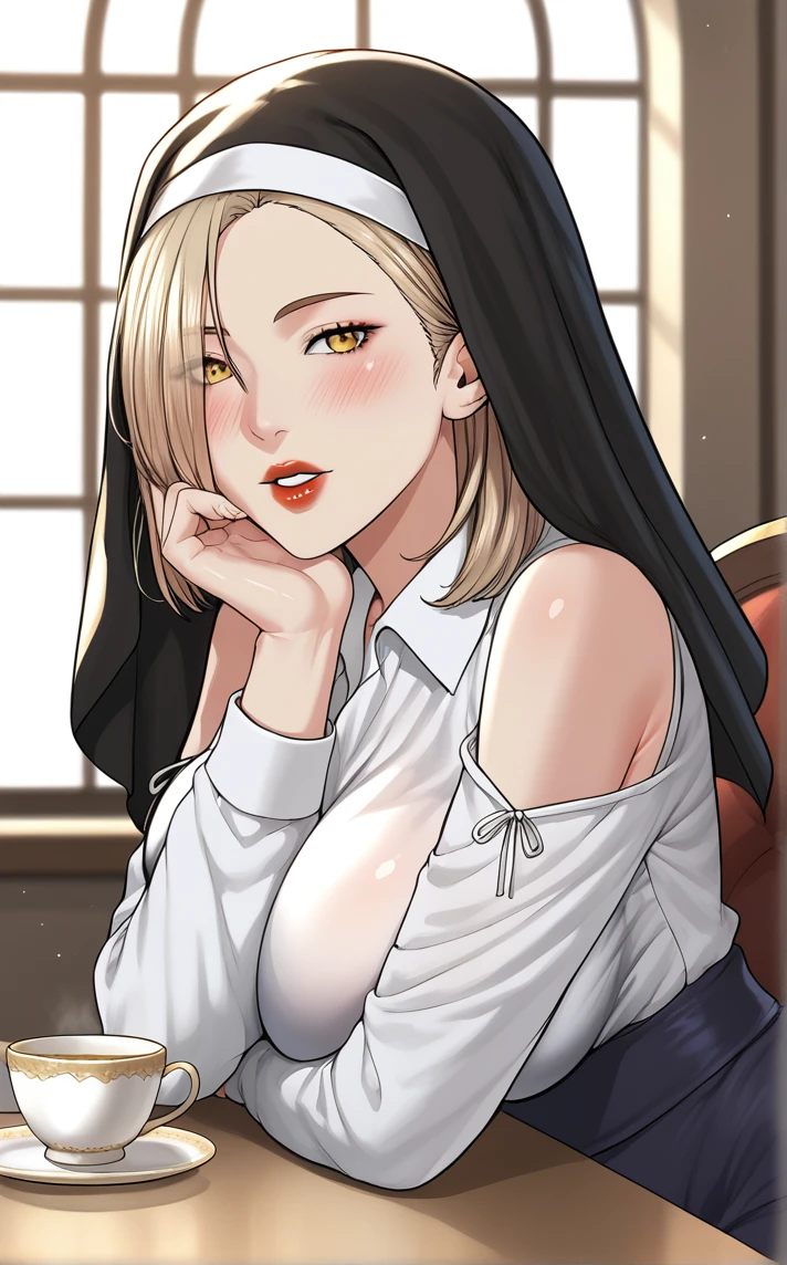 HeadCovering_Minyoung_ownwaifu, 1girl, blonde hair, mature female, medium hair, red lips, yellow eyes, collared shirt, white shirt, habit, traditional nun, hair over one eye, lips, large breasts, eyelashes, lipstick, long sleeves, veil, bangs, dress shirt, black veil, blue skirt, collarbone, makeup, office lady, brown pantyhose,