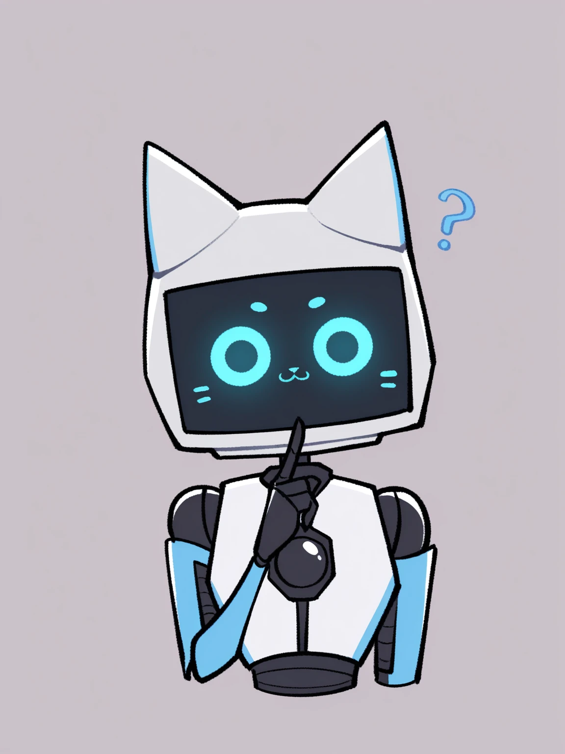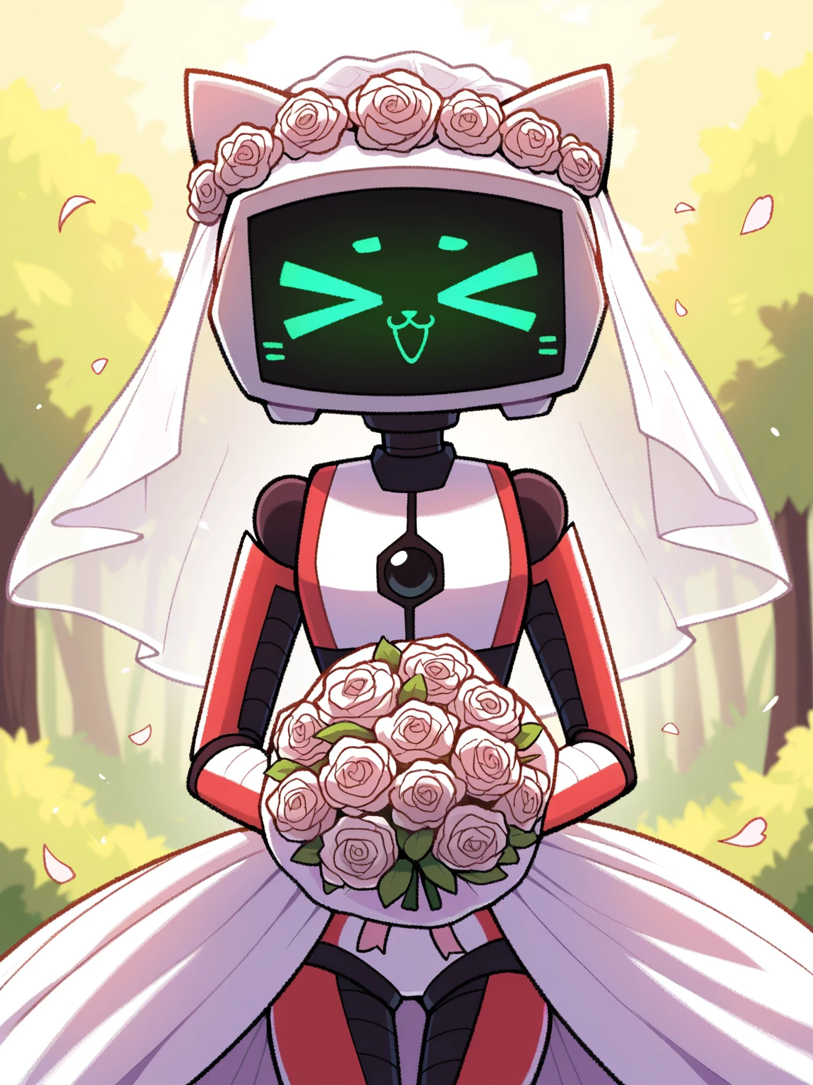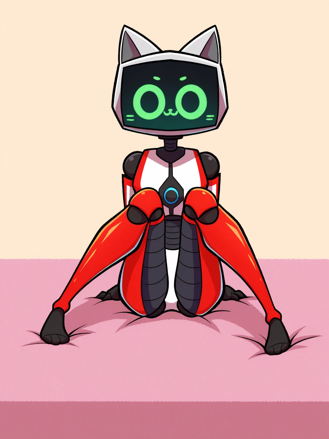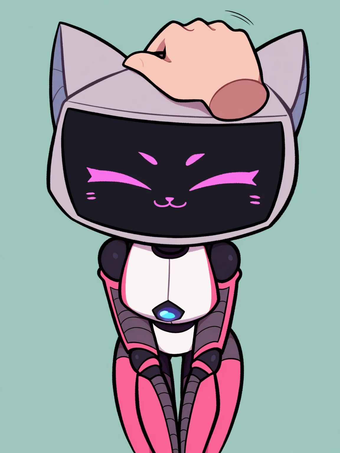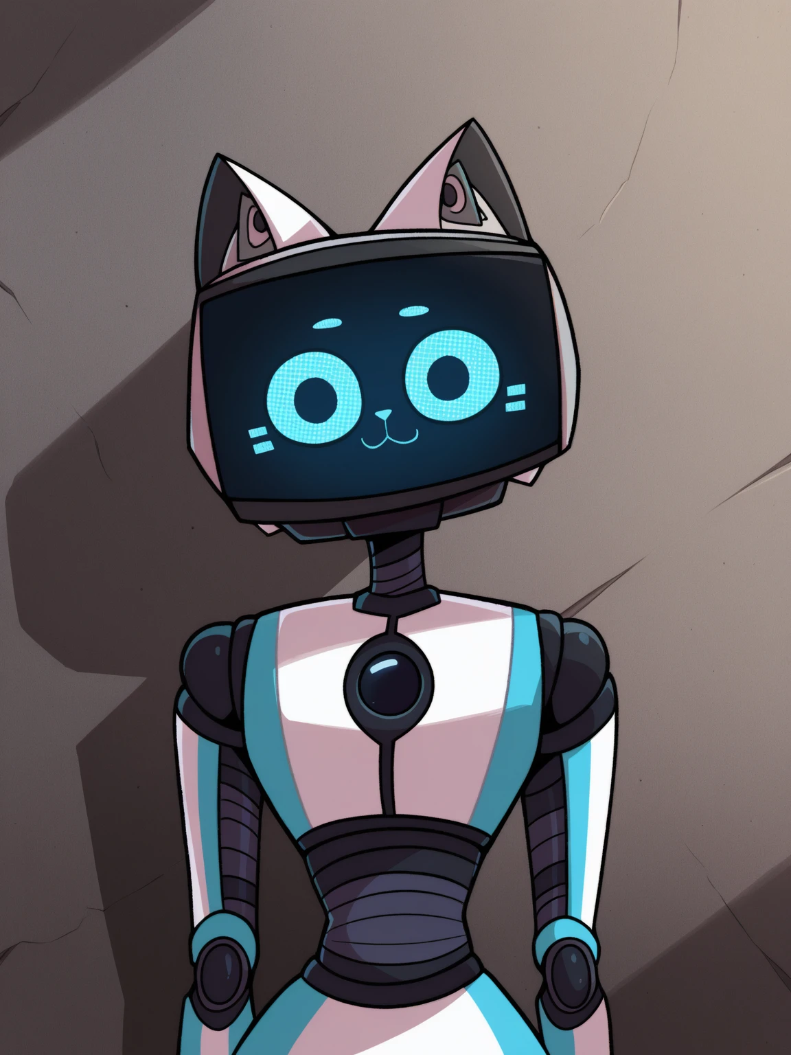 Core tags: robot, (color) body, (color) face, robot joints, cat face, monitor head, screen face, cat ears, :3