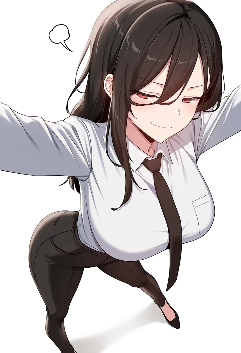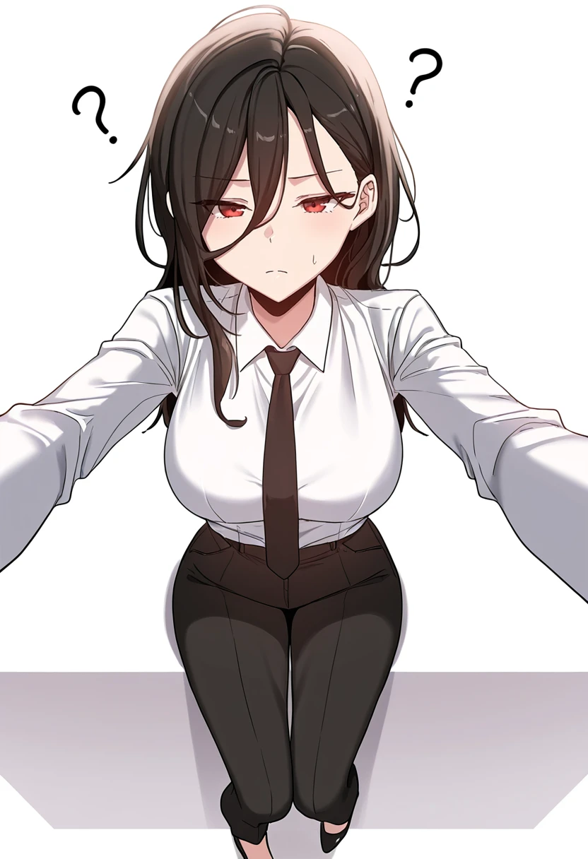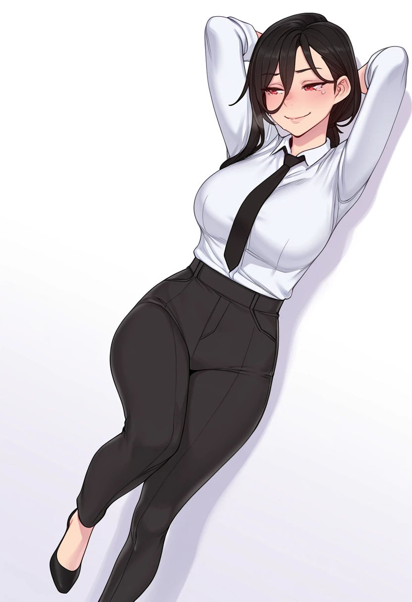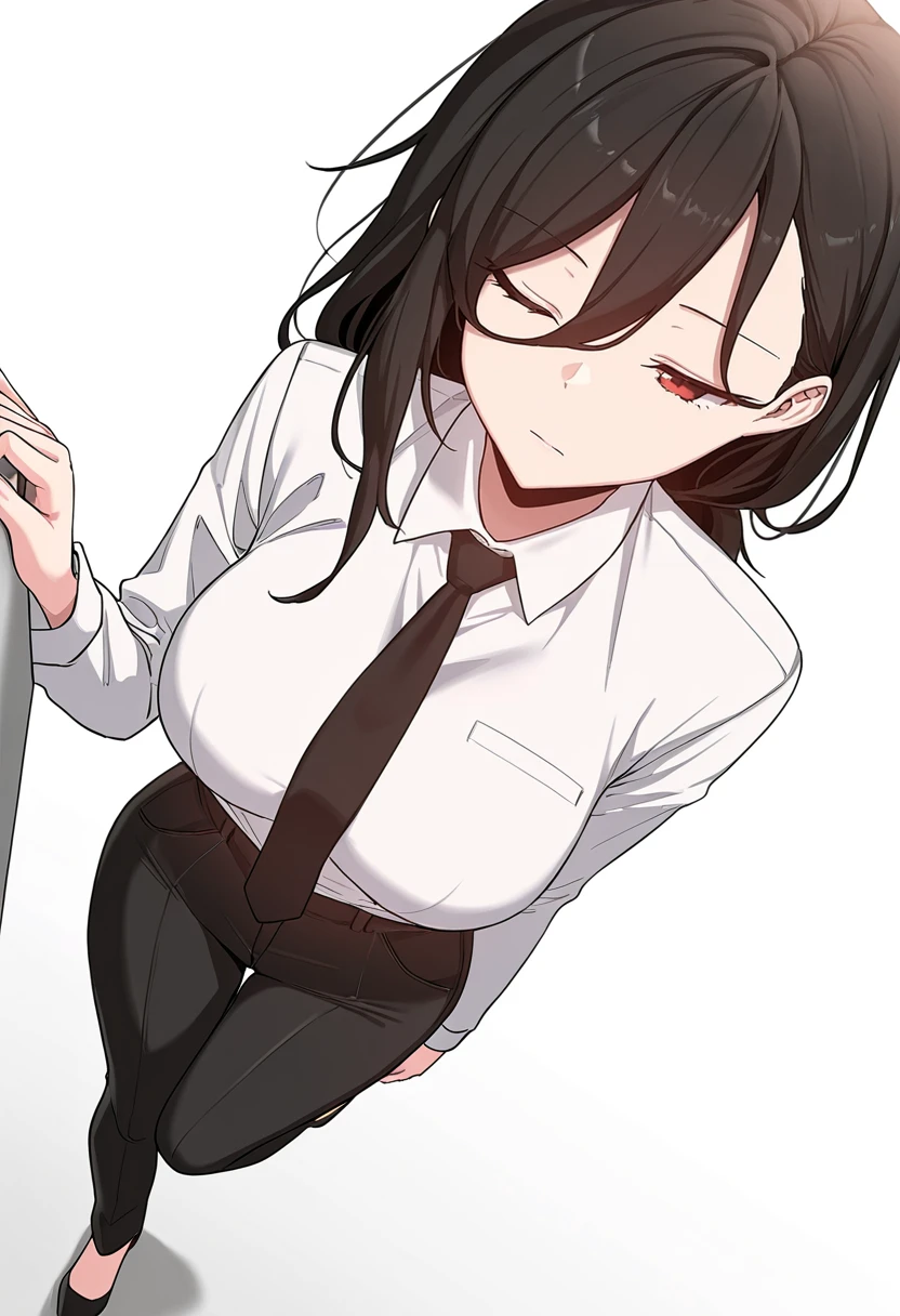 white collared shirt, long sleeves, shirt tucked in,black necktie,black pants,office lady,black footwear,Explanation and notes below👇