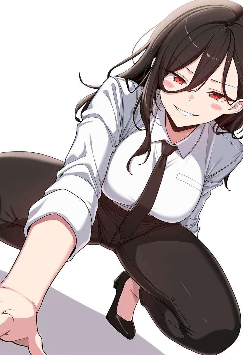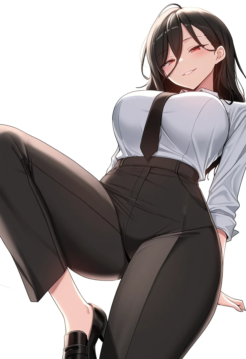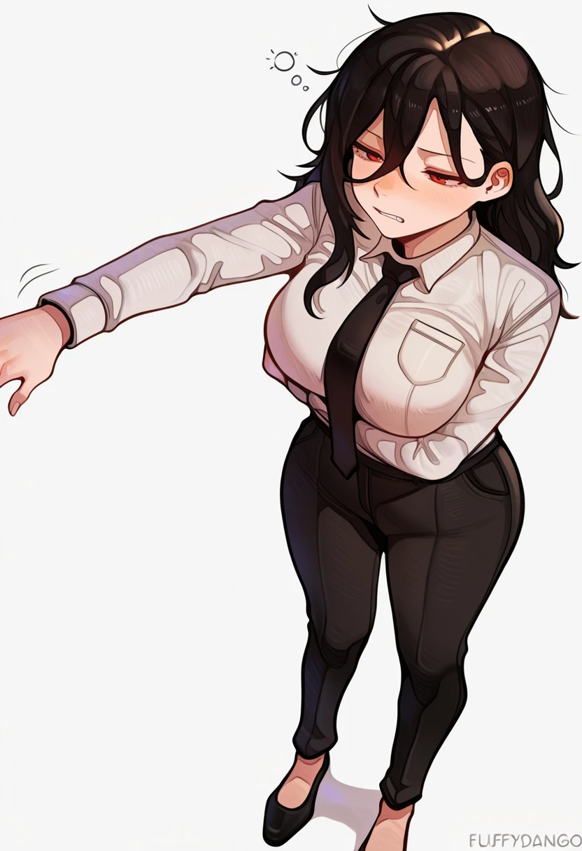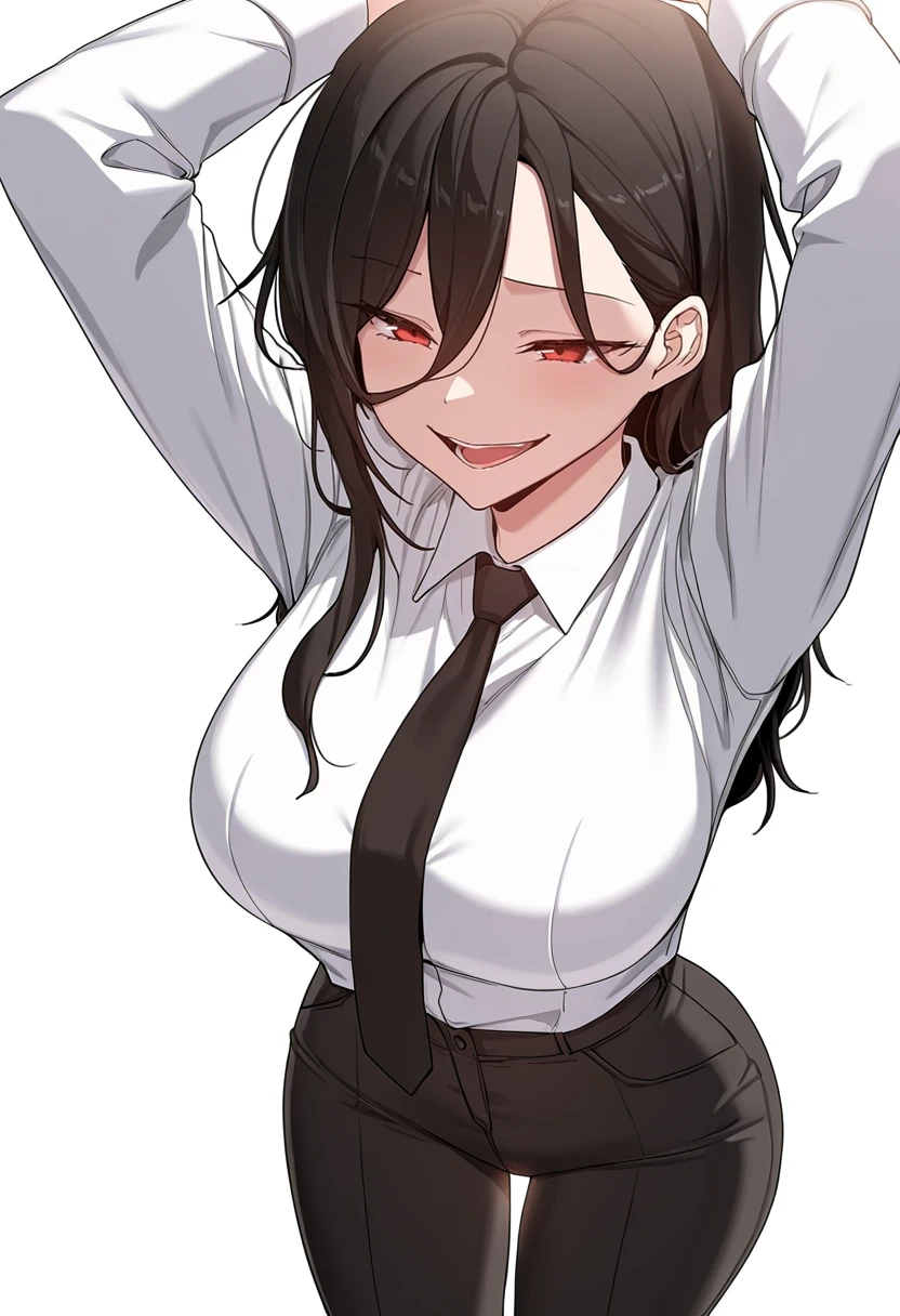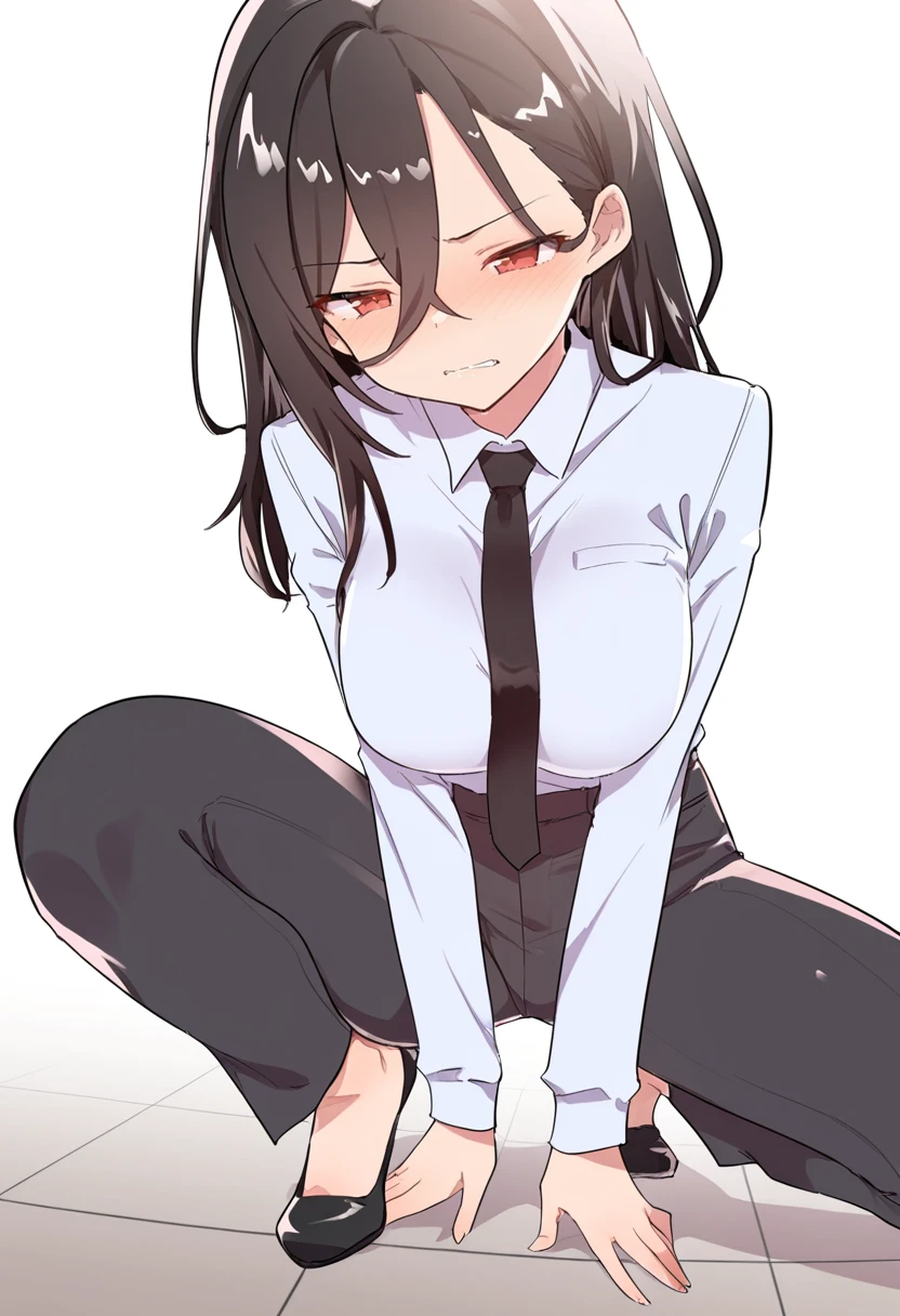white collared shirt, long sleeves, shirt tucked in,black necktie,black pants,office lady,black footwear,Explanation and notes below👇