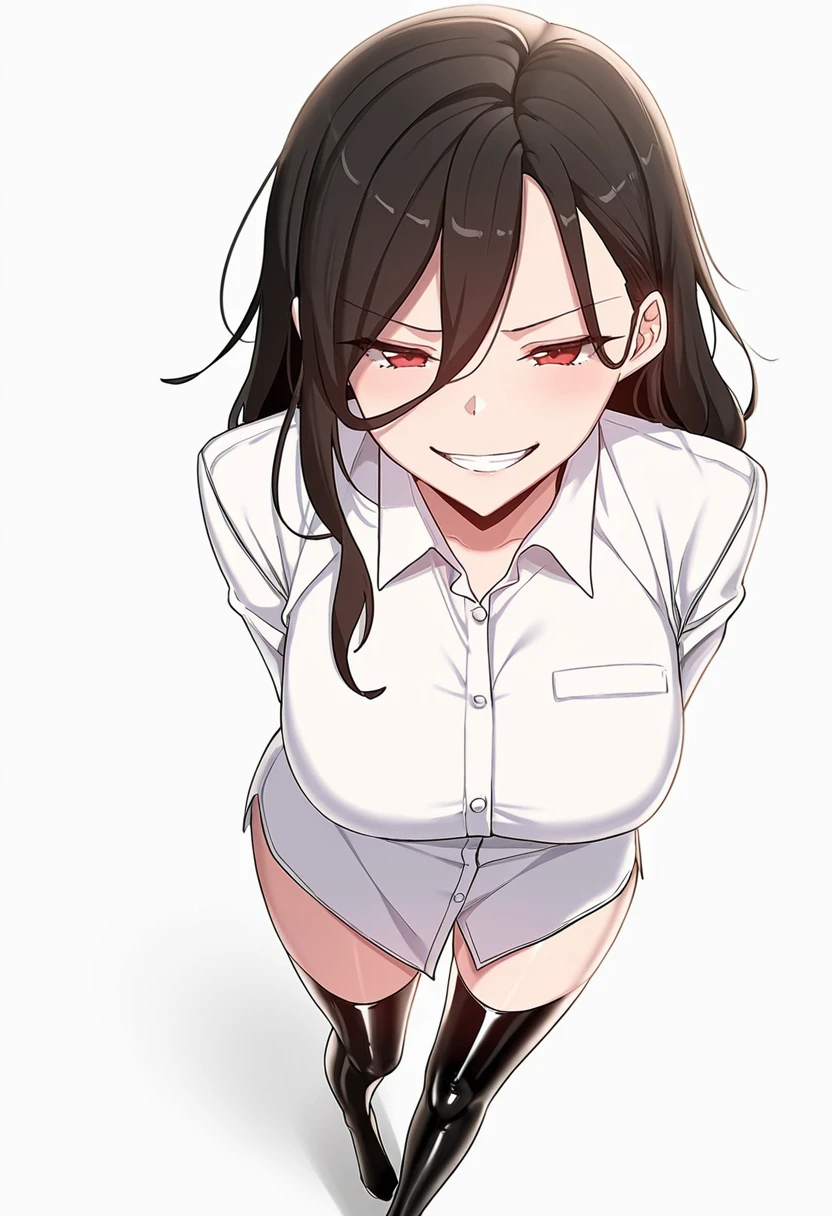 naeun_cnr, 1girl,black hair, long hair, bangs, sidelocks, hair between eyes,red eyes,large breasts,👗Default Outfit