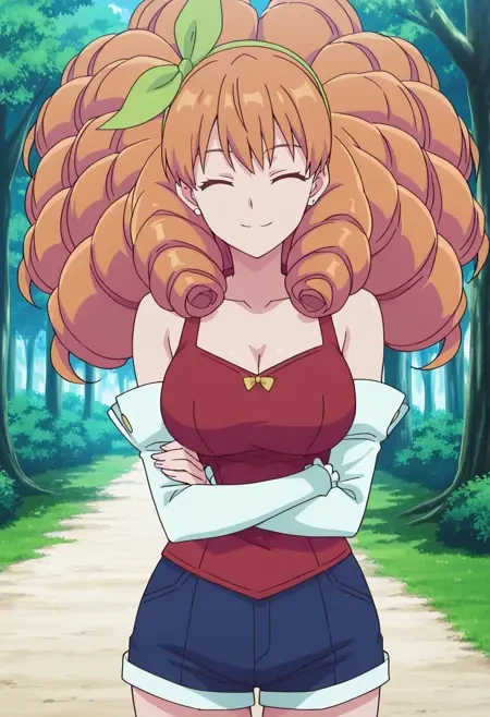 MelieCasAlter, 1girl, solo, orange hair, long hair, curly hair, drill hair, green eyes, large breasts, earrings, red shirt, cleavage, cleavage, detached sleeves, bare shoulders, blue shorts, ribbon, hair ribbon, no socks, dark blue shoes,Melie Pajamas