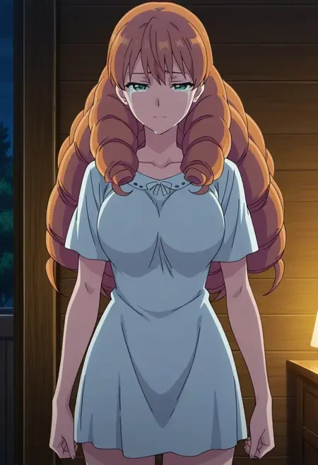 MeliePajamas, 1girl, solo, orange hair, long hair, curly hair, drill hair, green eyes, large breasts, white dress, bare feet,Melie Bikini