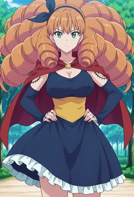 MelieCas, 1girl, solo, orange hair, long hair, curly hair, drill hair, green eyes, large breasts, earrings, cleavage, blue dress, detached sleeves, hairband, holding wand, red capelet, magic, hair ribbon, frills, jewelry, ribbon, tattoo on shoulder, tattoo on arm, tattoo thigh, frilled skirt dress, no socks, dark blue shoes,Melie Casual Alternative
