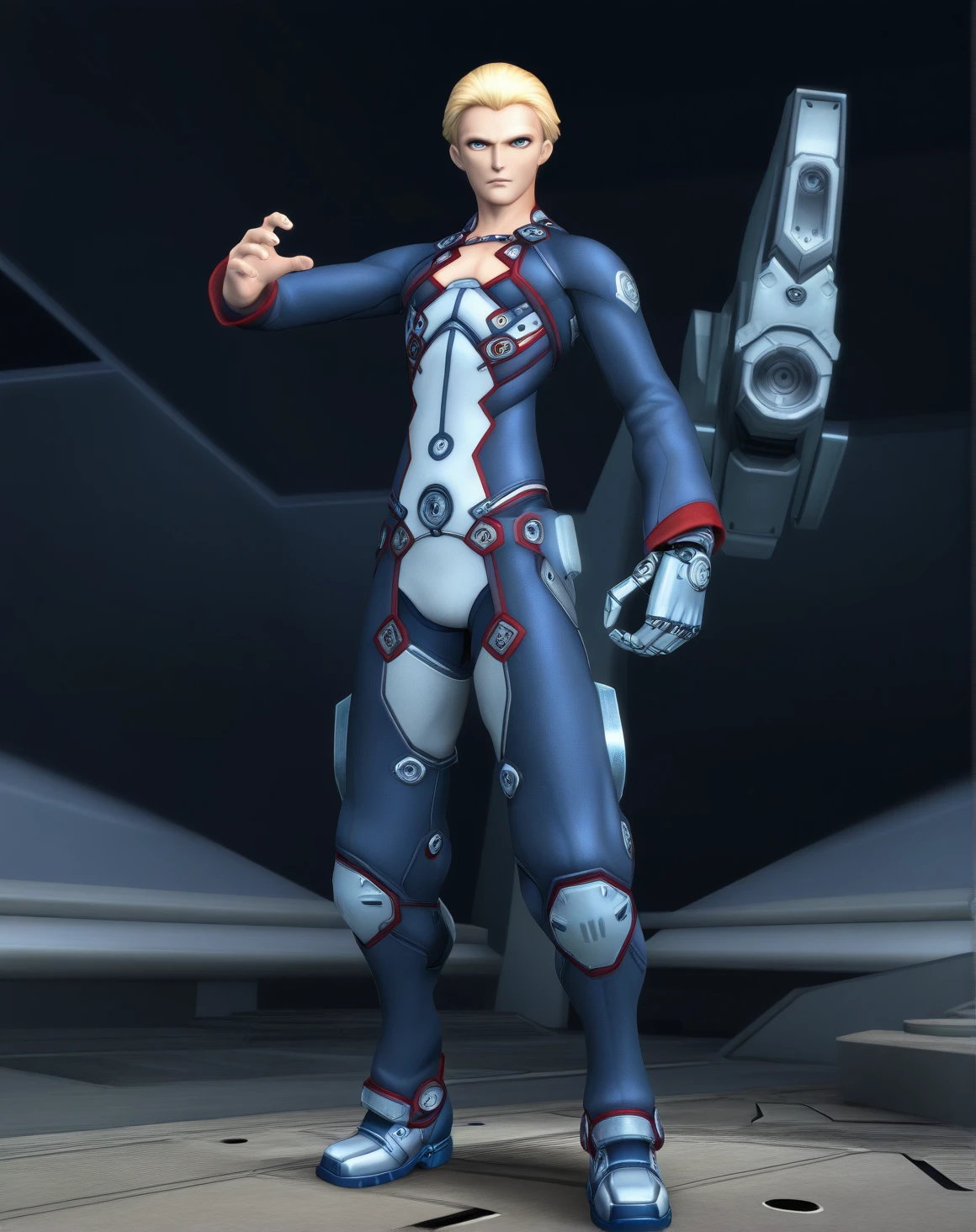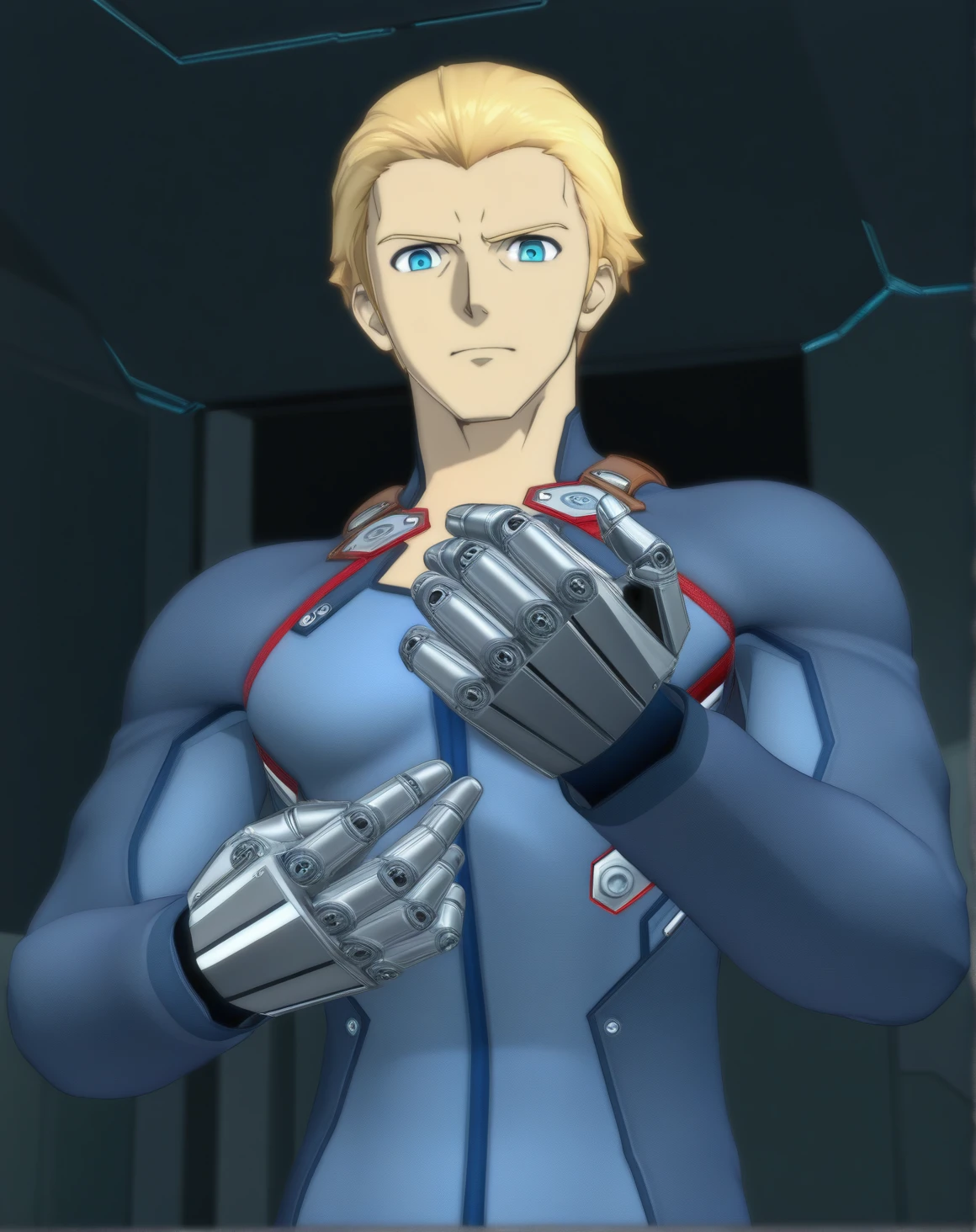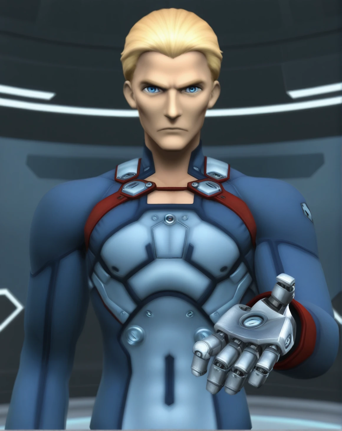 3d, 1boy, blonde hair, short hair, long sleeves, looking at viewer, upper body, ziggurat_8, science fiction, original_style, parody, big anime eyes, official art, parody, metal left hand, human right hand,