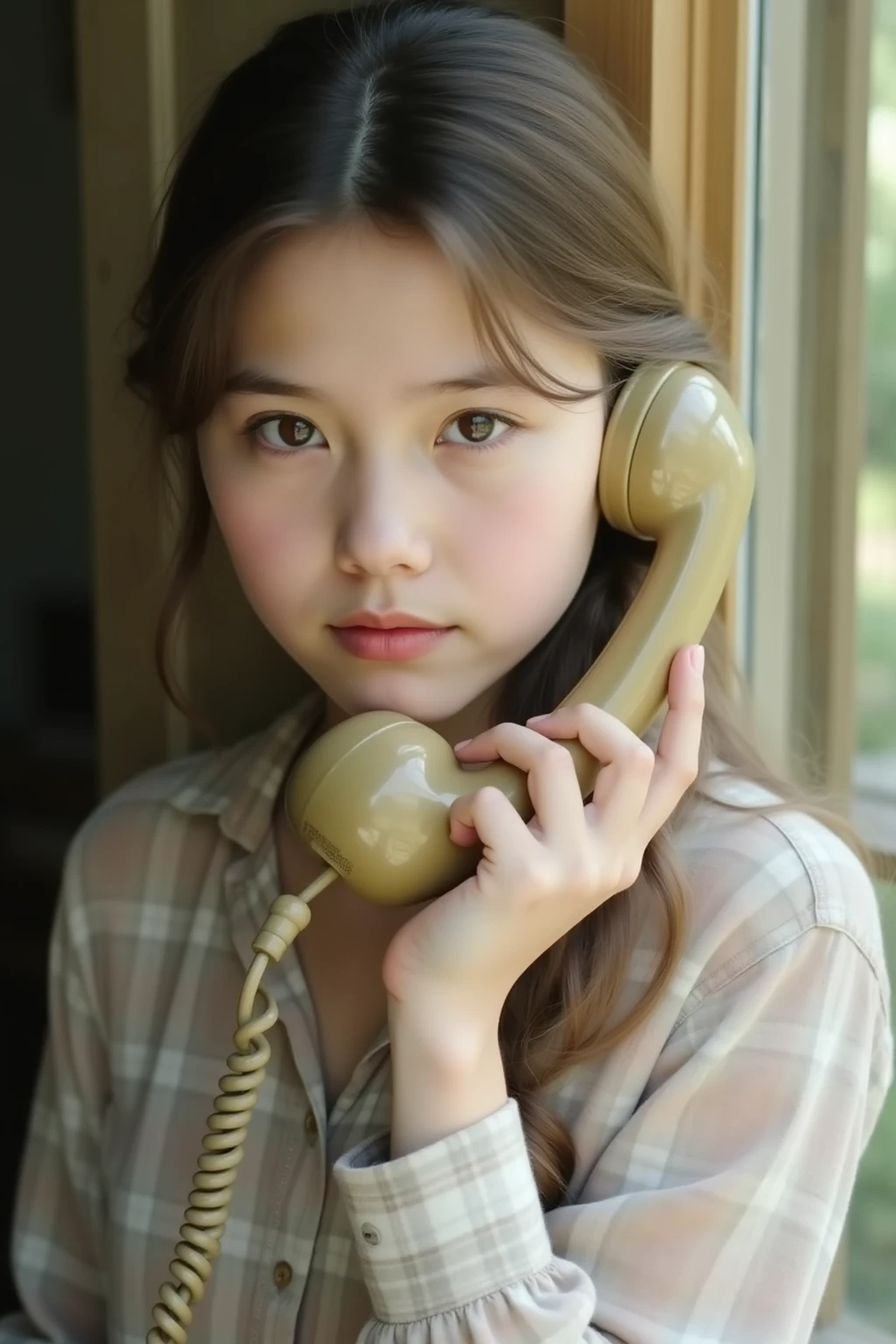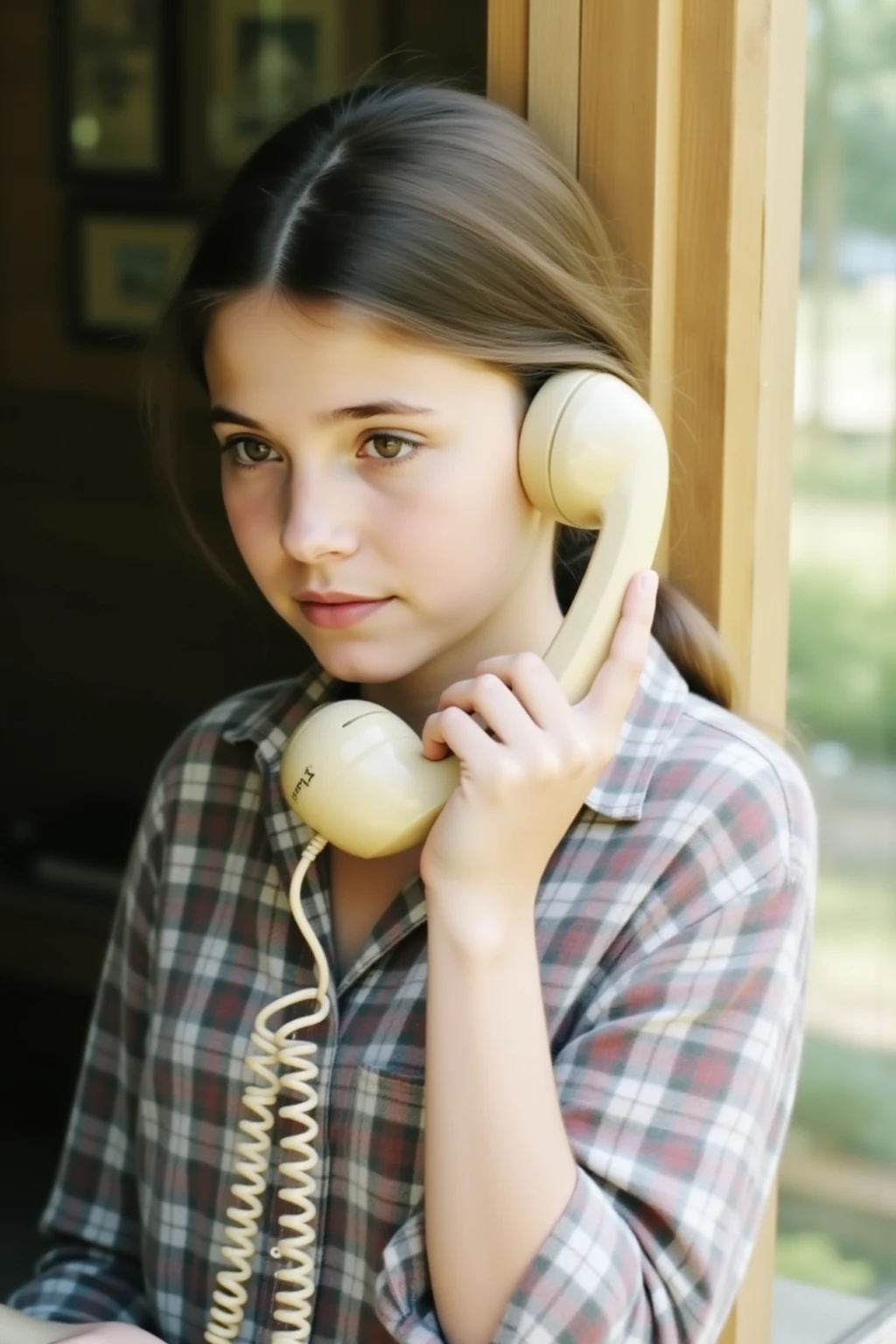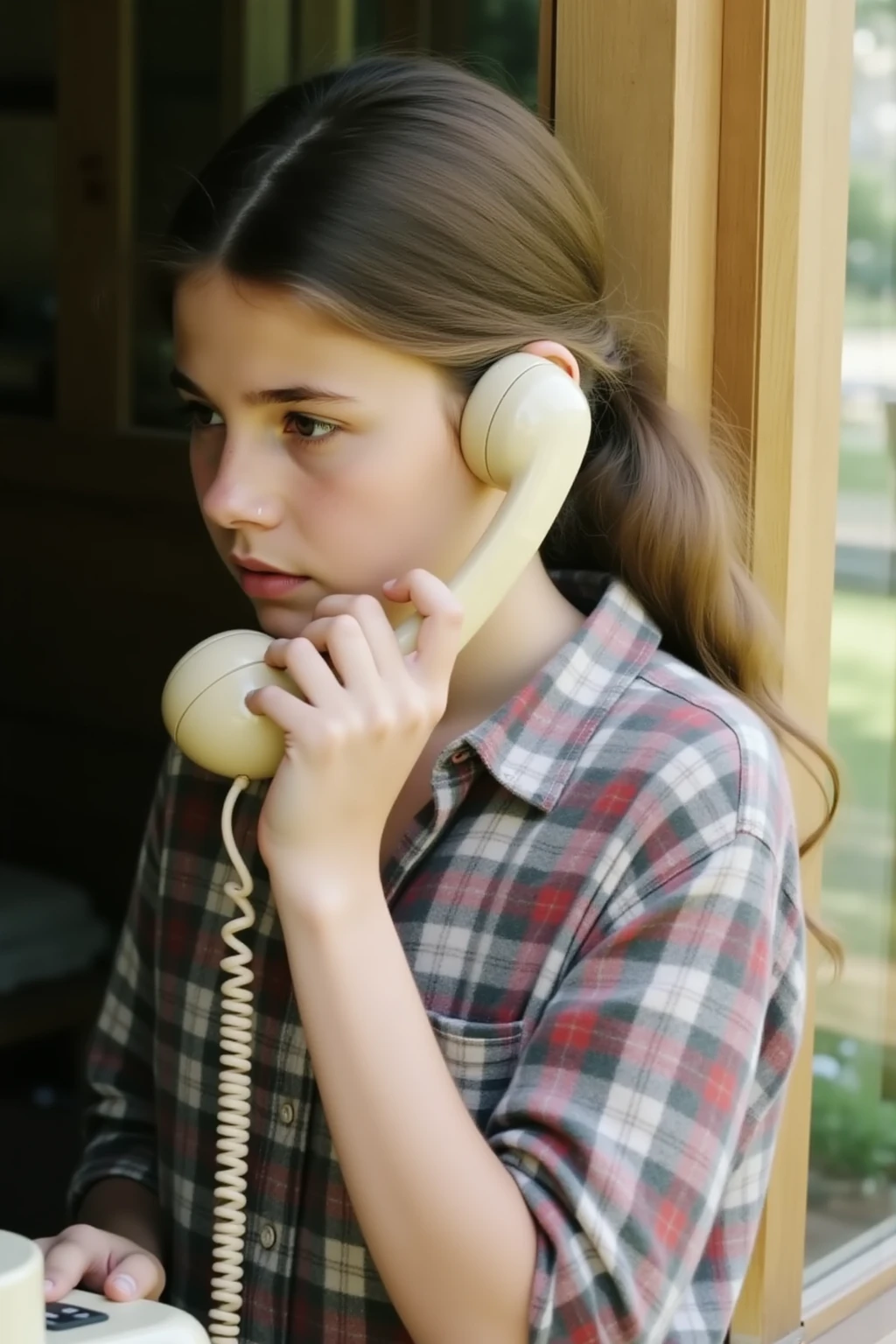 電話の受話器を脅かすリアルな女の子、赤と青の格子縞のシャツを着たポニーテールの若い女の子が、白い受話器を耳に当てています。彼女は外の緑を眺めながら窓の前に立っている。舞台は屋内のようで、背景には木製の壁と額入りの絵が見えます。照明は柔らかく、彼女の顔と周囲を優しい光で照らします。