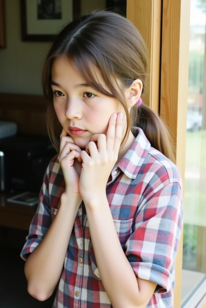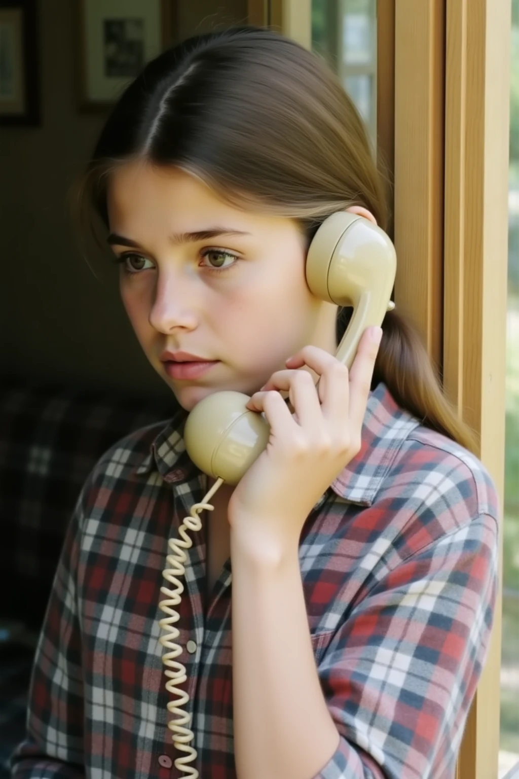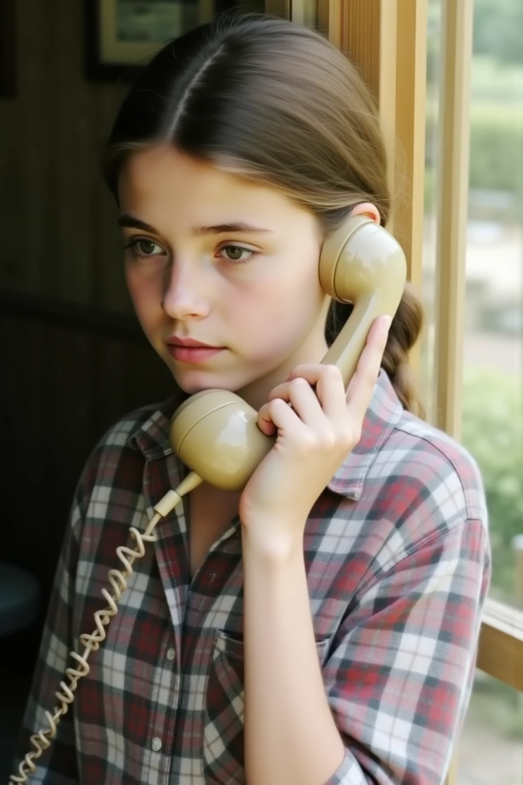 電話の受話器を脅かすリアルな女の子、赤と青の格子縞のシャツを着たポニーテールの若い女の子が、白い受話器を耳に当てています。彼女は外の緑を眺めながら窓の前に立っている。舞台は屋内のようで、背景には木製の壁と額入りの絵が見えます。照明は柔らかく、彼女の顔と周囲を優しい光で照らします。