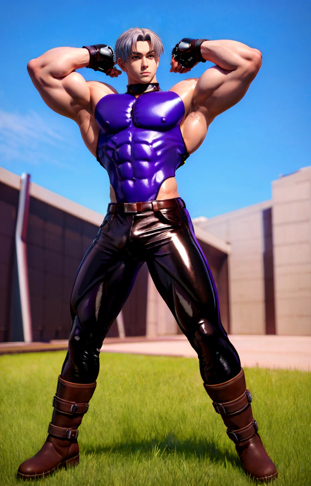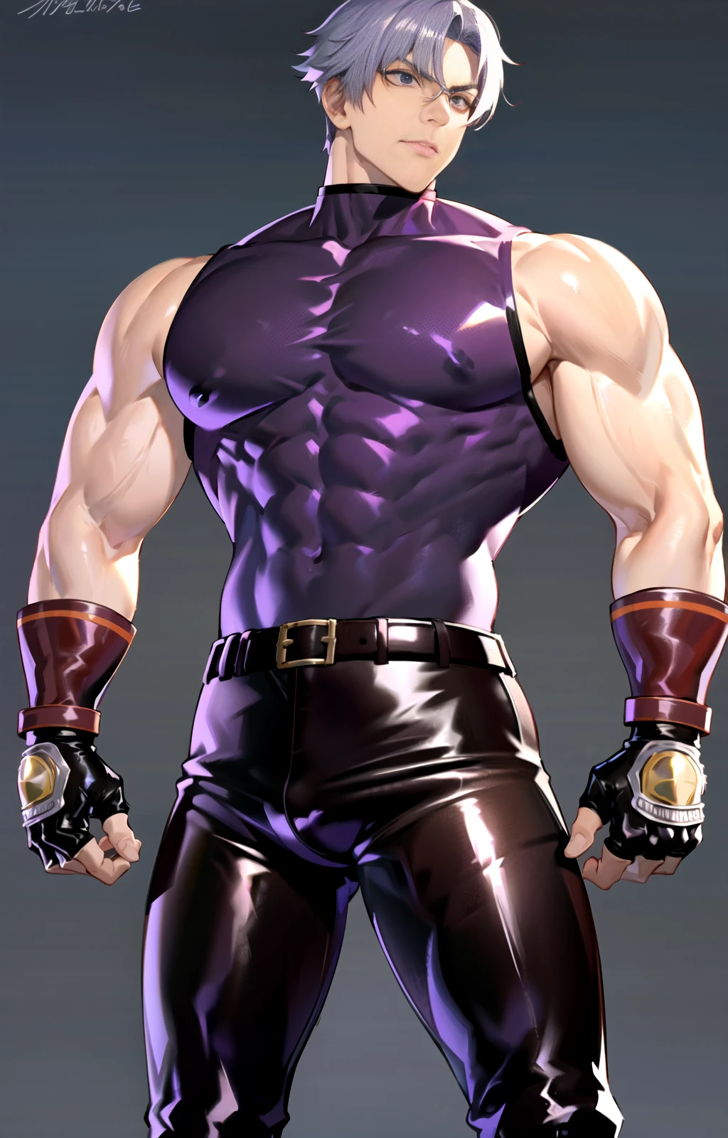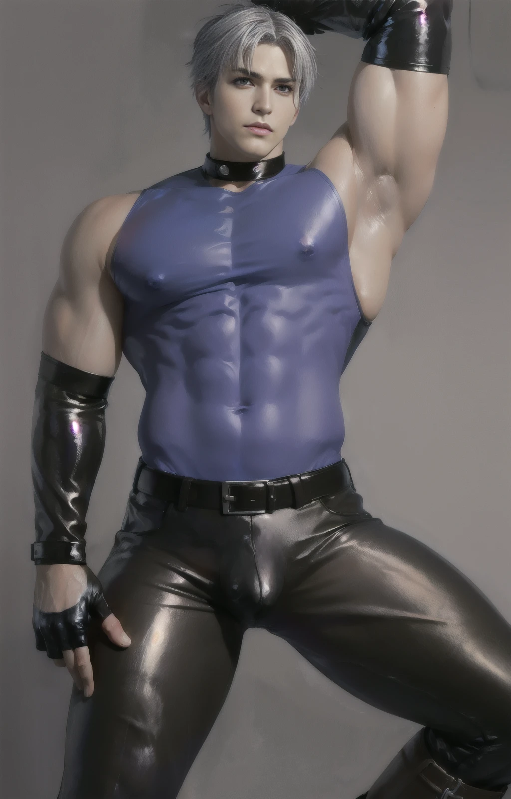 leepurple , latex shirt, sleeveless , muscular, leather pants, fingerless gloves, pectoral muscles, ,korean male, middle part hair, short hair, silver hair, biceps, triceps, tight pants, leather,