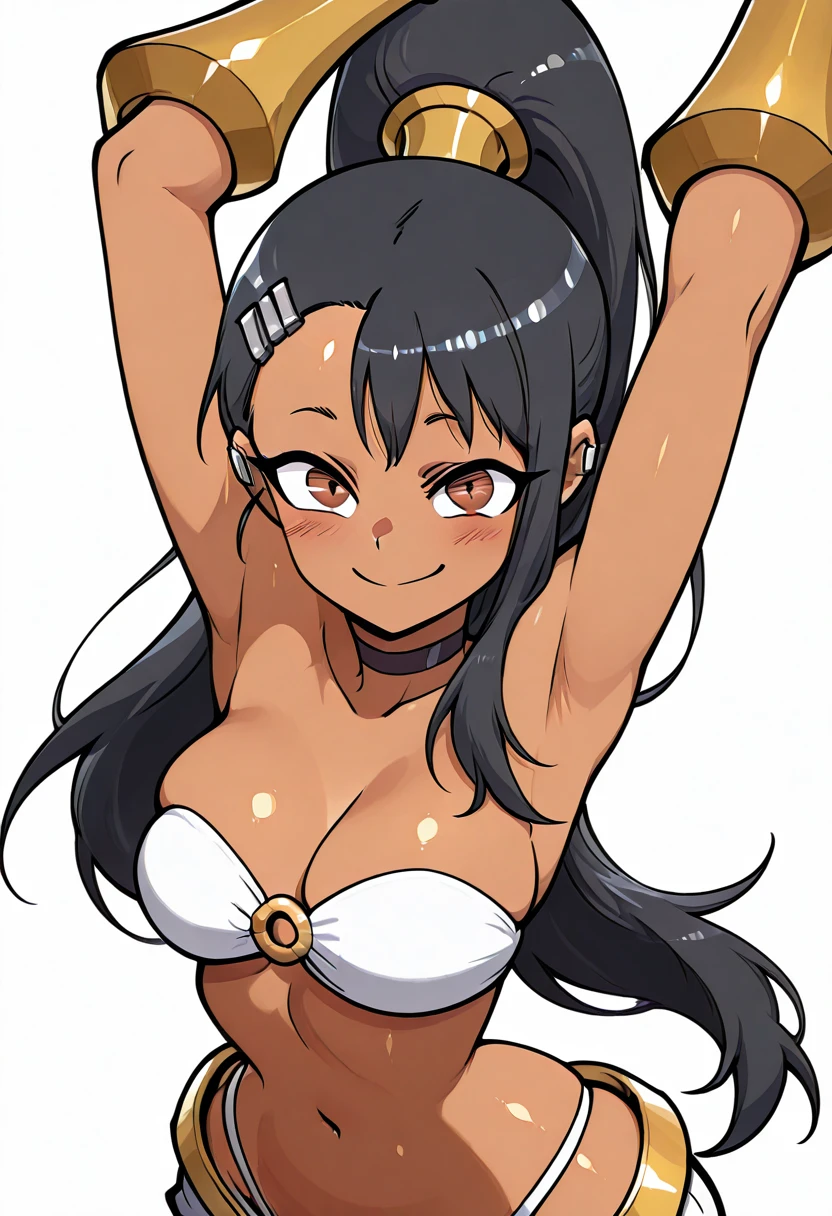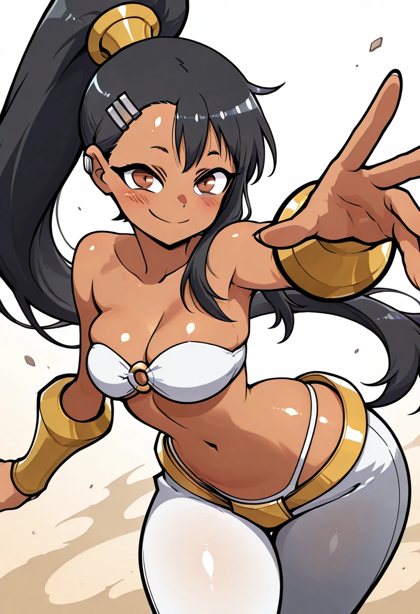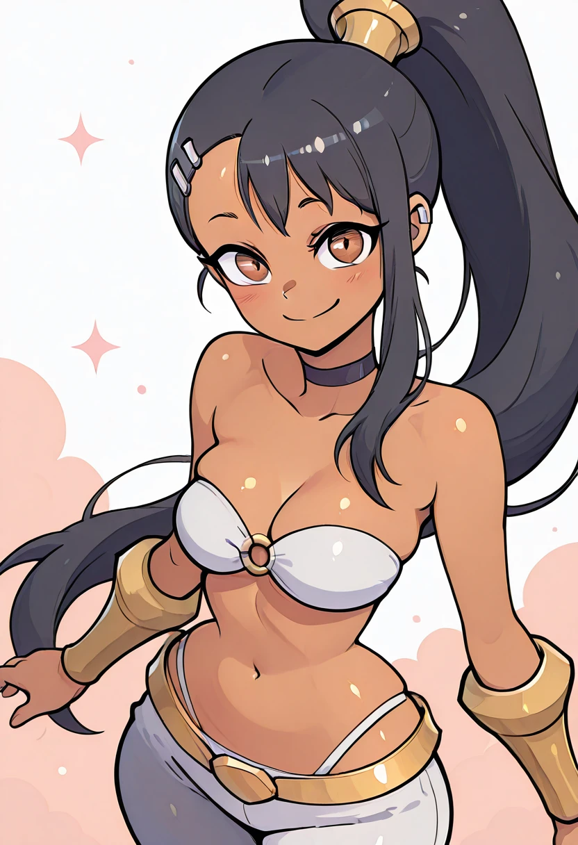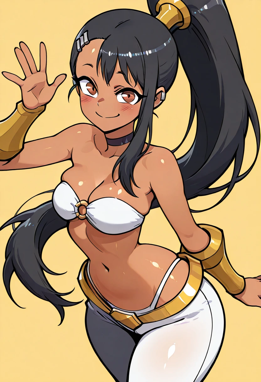 zzNagatoro, brown eyes, black hair, hair ornament, hairclip, long hair, dark skin, ponytail, bare shoulders, bandeau, navel, highleg panties, white panties, o-ring top, white pants,
