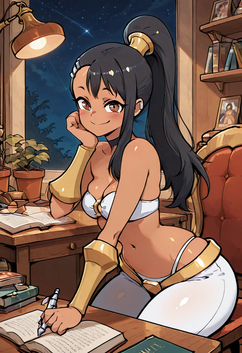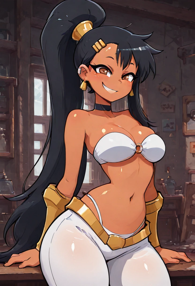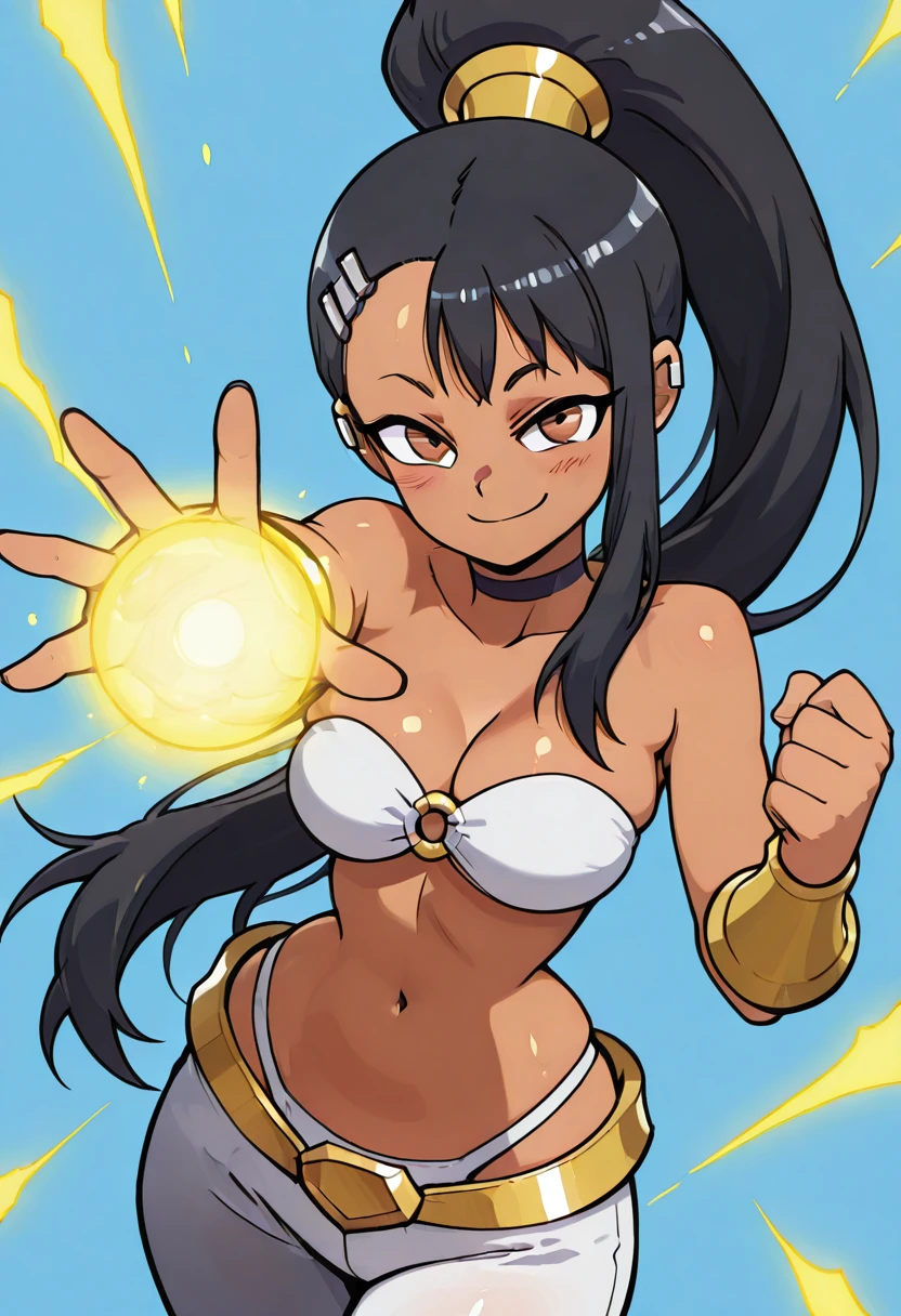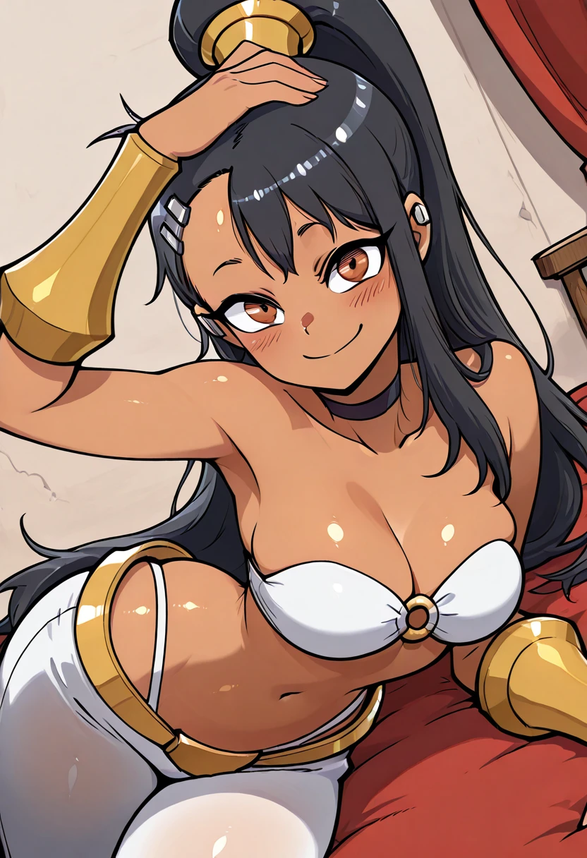 zzNagatoro, brown eyes, black hair, hair ornament, hairclip, long hair, dark skin, ponytail, bare shoulders, bandeau, navel, highleg panties, white panties, o-ring top, white pants,