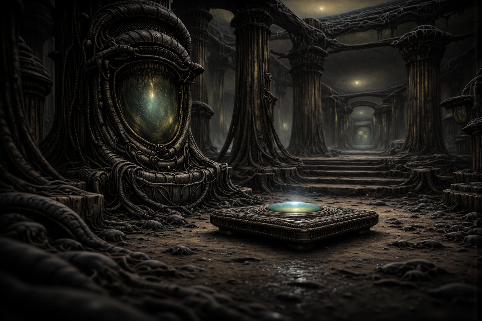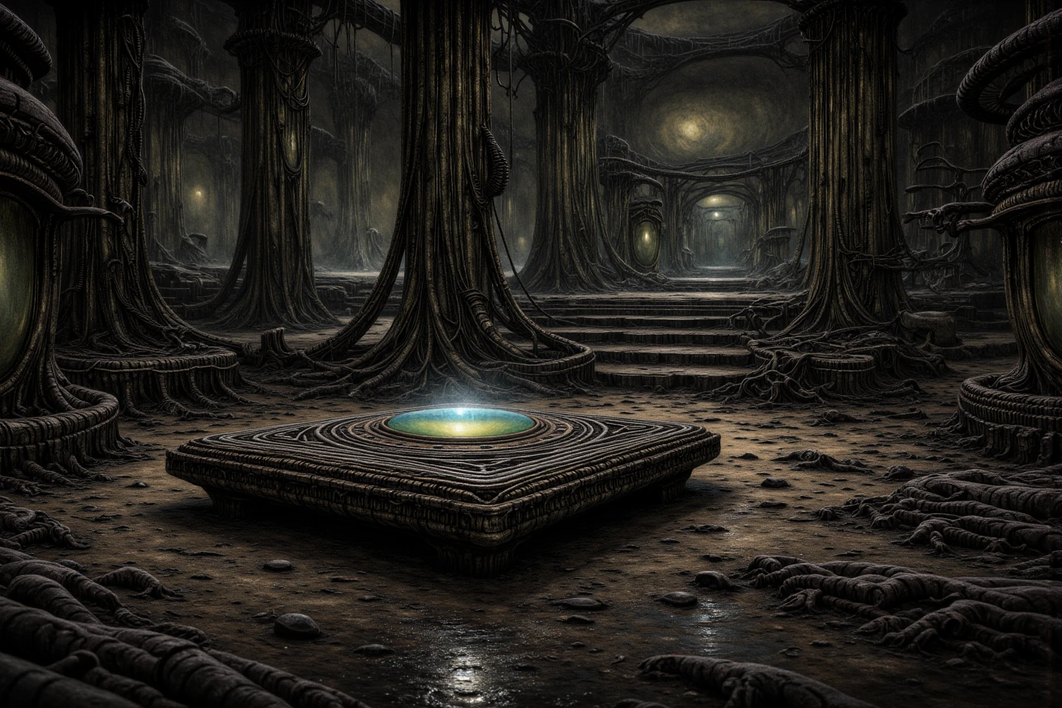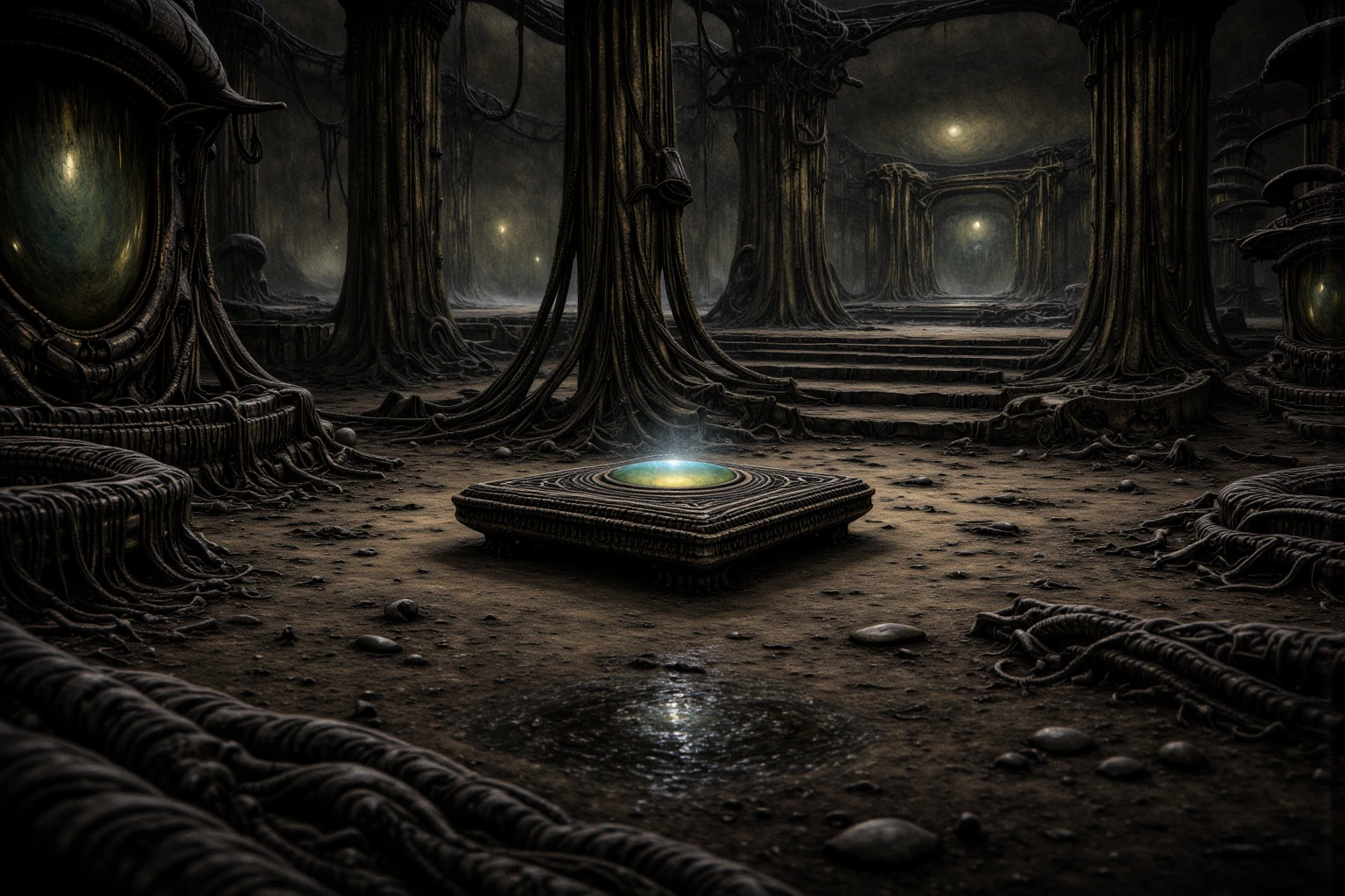Ancient biomechanical temple, vast ceremonial chamber constructed from fused organic and metallic structures, ribbed arches and column-like growths resembling fossilized alien exoskeletons, damp stone floor partially consumed by root-like biomechanical tendrils, cold desaturated palette of charcoal, oxidized steel, and muted bone tones. Diffuse overhead ambient light filters through unseen openings, mixed with faint green bioluminescent glow emanating from technological-organic interfaces. Atmospheric volumetric haze softens distance and creates depth layering. At the center stands a raised square central altar, carved with concentric mechanical sigils, containing a recessed luminous liquid core emitting pale green energy light upward. On the left side, a semi-transparent vertical Bio-pod chamber embedded into the wall holds suspended organic matter or fluid, softly illuminated from within. Surrounding architecture suggests abandoned ritual technology, ancient alien engineering, and dormant bio-mechanical life support systems integrated into temple infrastructure.