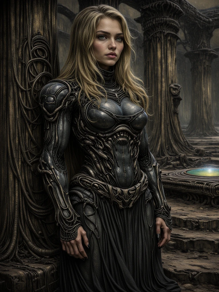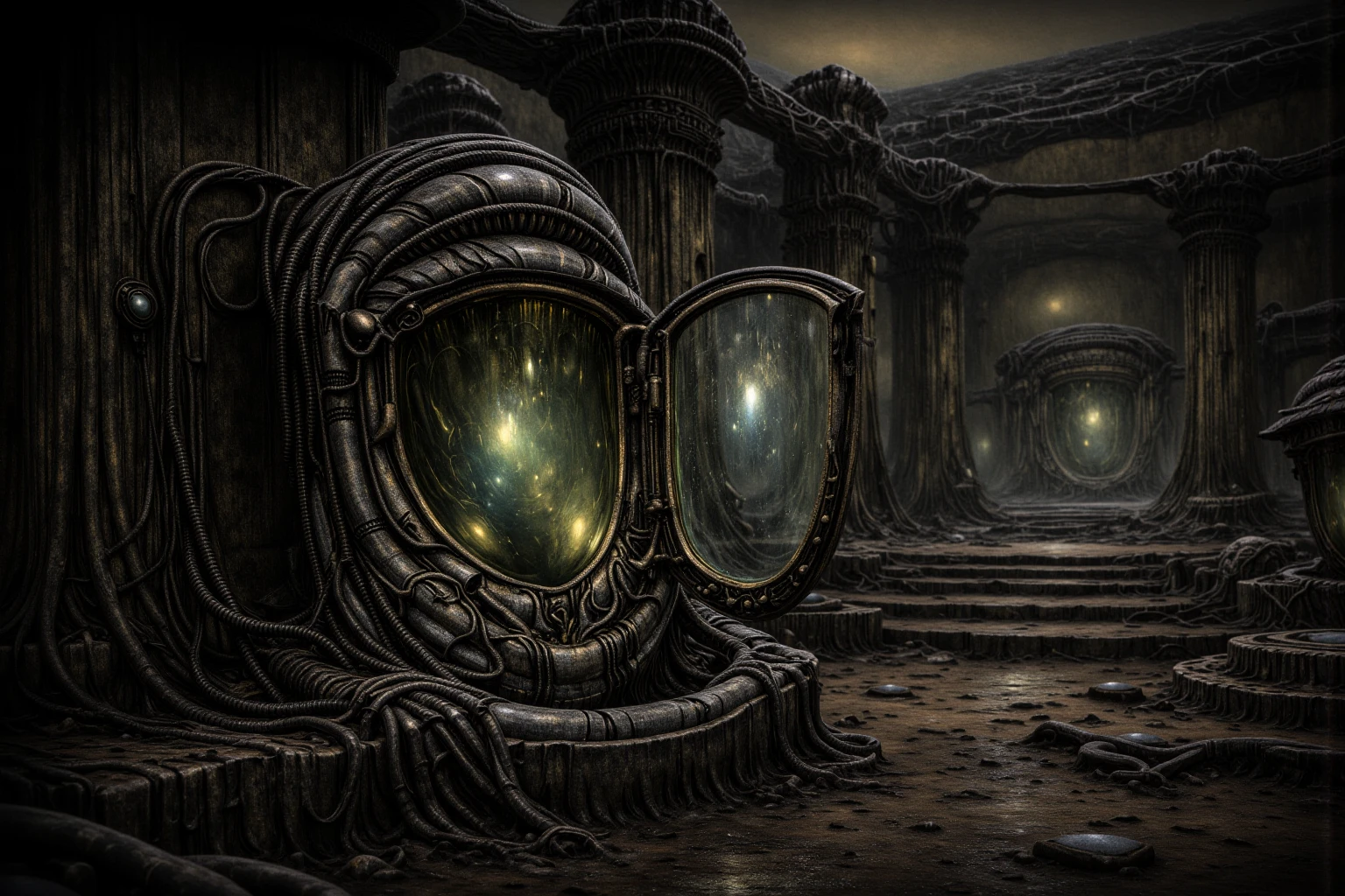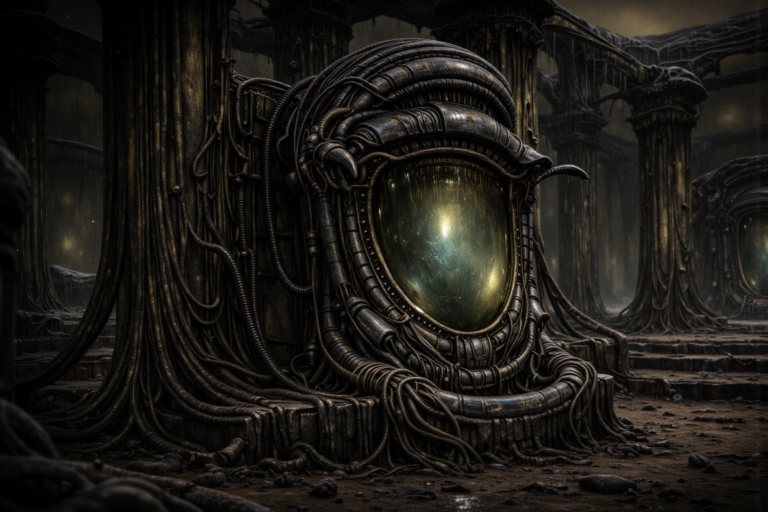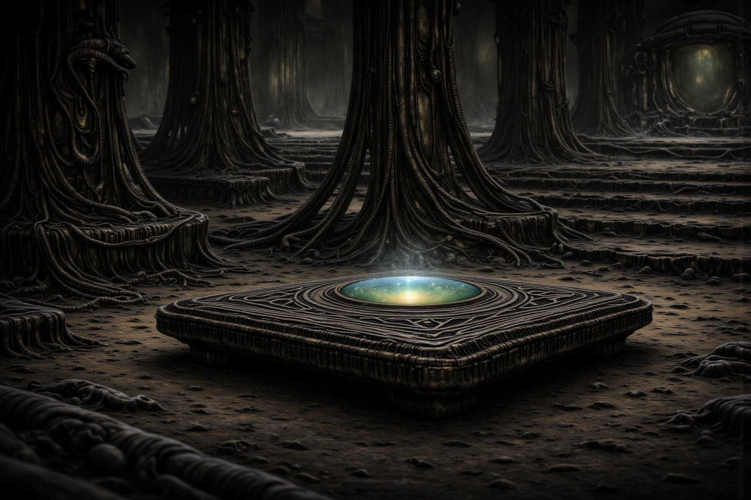 Ancient biomechanical temple, vast ceremonial chamber constructed from fused organic and metallic structures, ribbed arches and column-like growths resembling fossilized alien exoskeletons, damp stone floor partially consumed by root-like biomechanical tendrils, cold desaturated palette of charcoal, oxidized steel, and muted bone tones. Diffuse overhead ambient light filters through unseen openings, mixed with faint green bioluminescent glow emanating from technological-organic interfaces. Atmospheric volumetric haze softens distance and creates depth layering. At the center stands a raised square central altar, carved with concentric mechanical sigils, containing a recessed luminous liquid core emitting pale green energy light upward. On the left side, a semi-transparent vertical Bio-pod chamber embedded into the wall holds suspended organic matter or fluid, softly illuminated from within. Surrounding architecture suggests abandoned ritual technology, ancient alien engineering, and dormant bio-mechanical life support systems integrated into temple infrastructure.