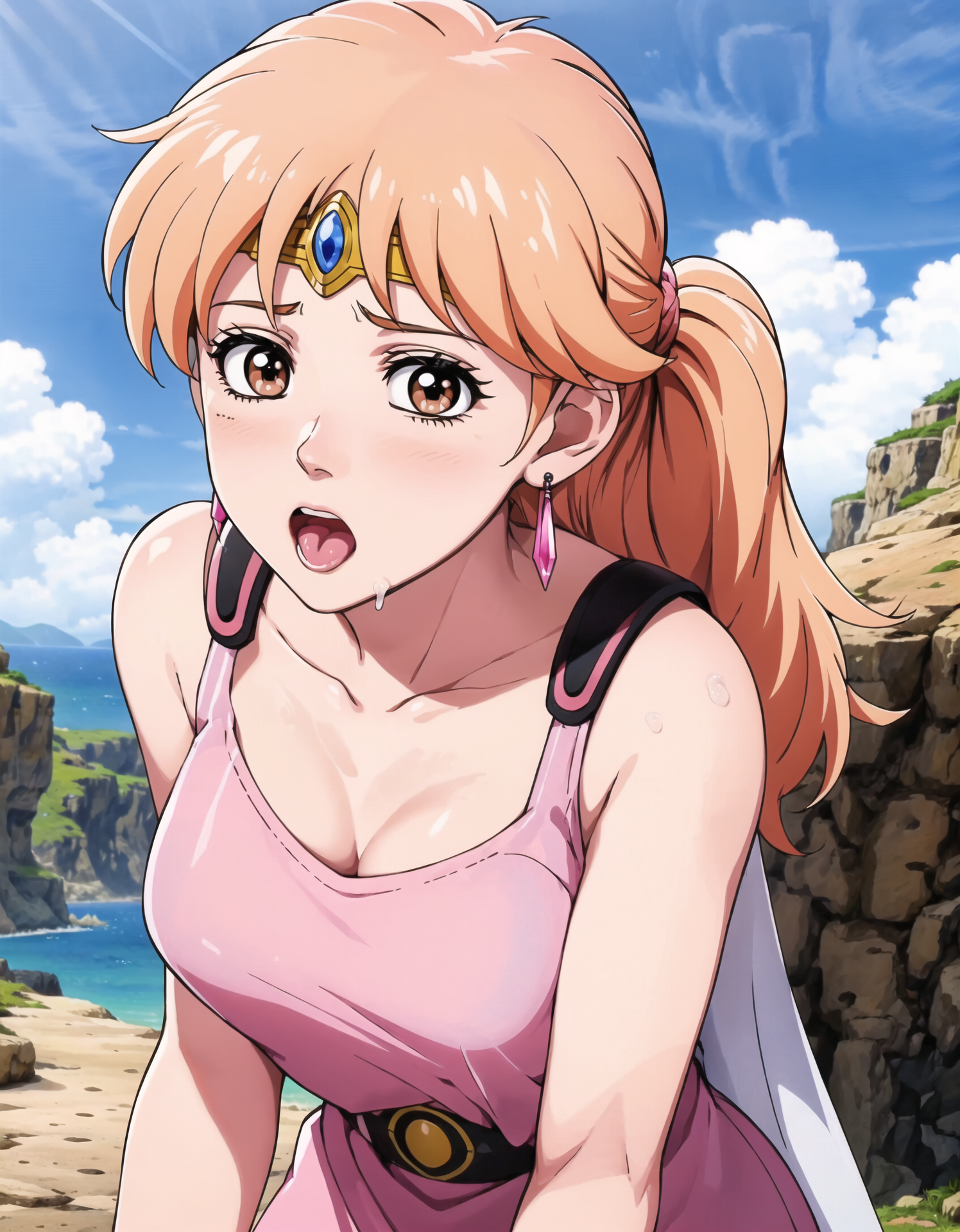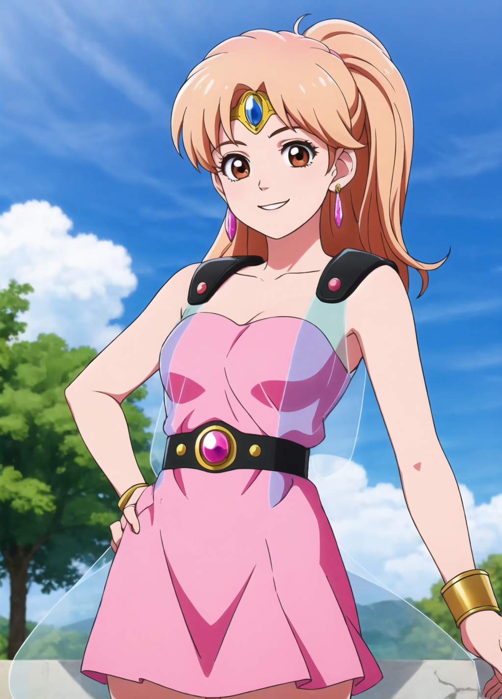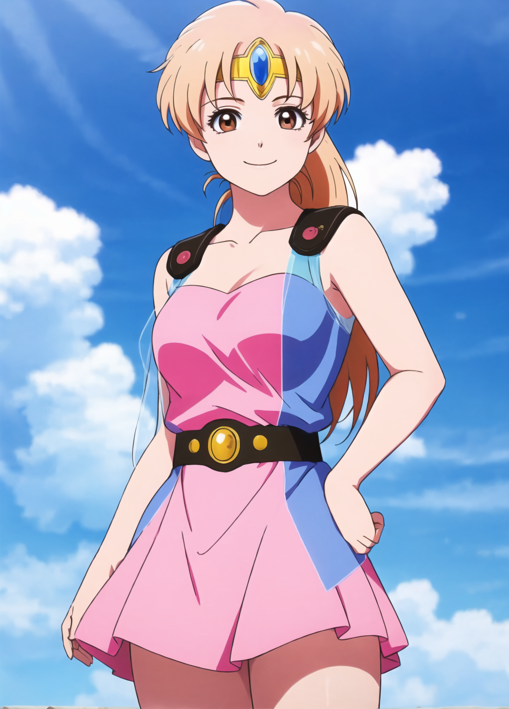Episode 2 Outfit: [ leonadq2020, 1girl, solo, blonde hair, long hair, brown eyes, sky, circlet, pink dress, short dress, transparent cape, ponytail, smile, sexy pose ]