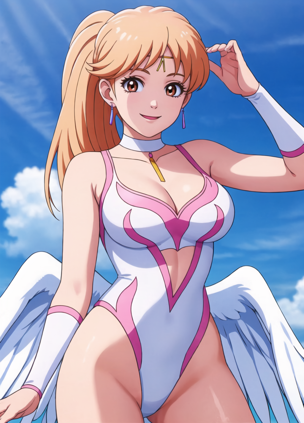 White Winged Bikini / Leotard: [ leonadq2020, 1girl, solo, blonde hair, long hair, brown eyes, sky, cleavage, leotard, white choker, wings, orange hair, ponytail, angel wings, white wings, white leotard, smile, sexy pose ]