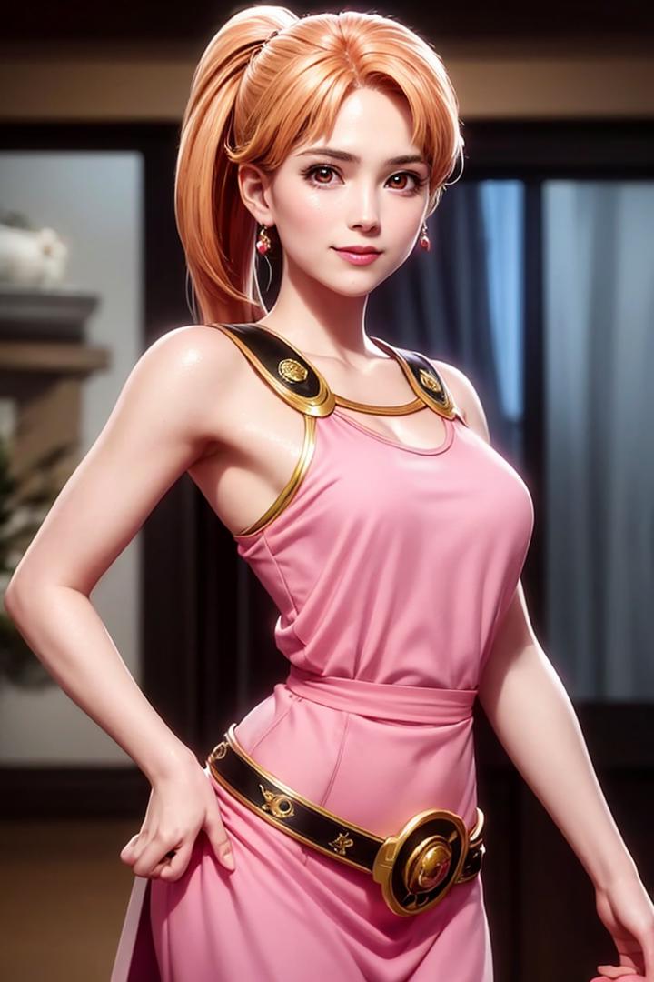 Common triggers: [ leonadq2020, 1girl, blonde hair, long hair, brown eyes, golden circlet, cleavage, orange hair, ponytail ]